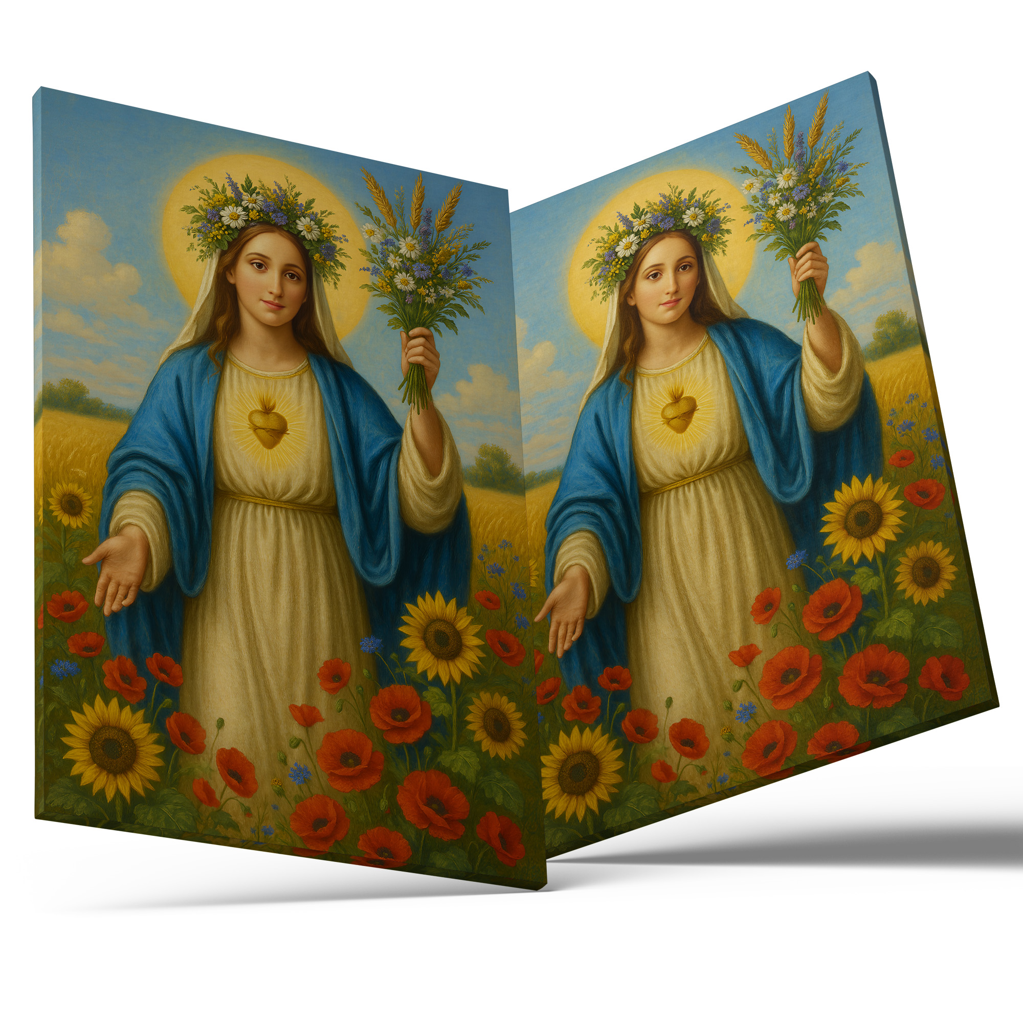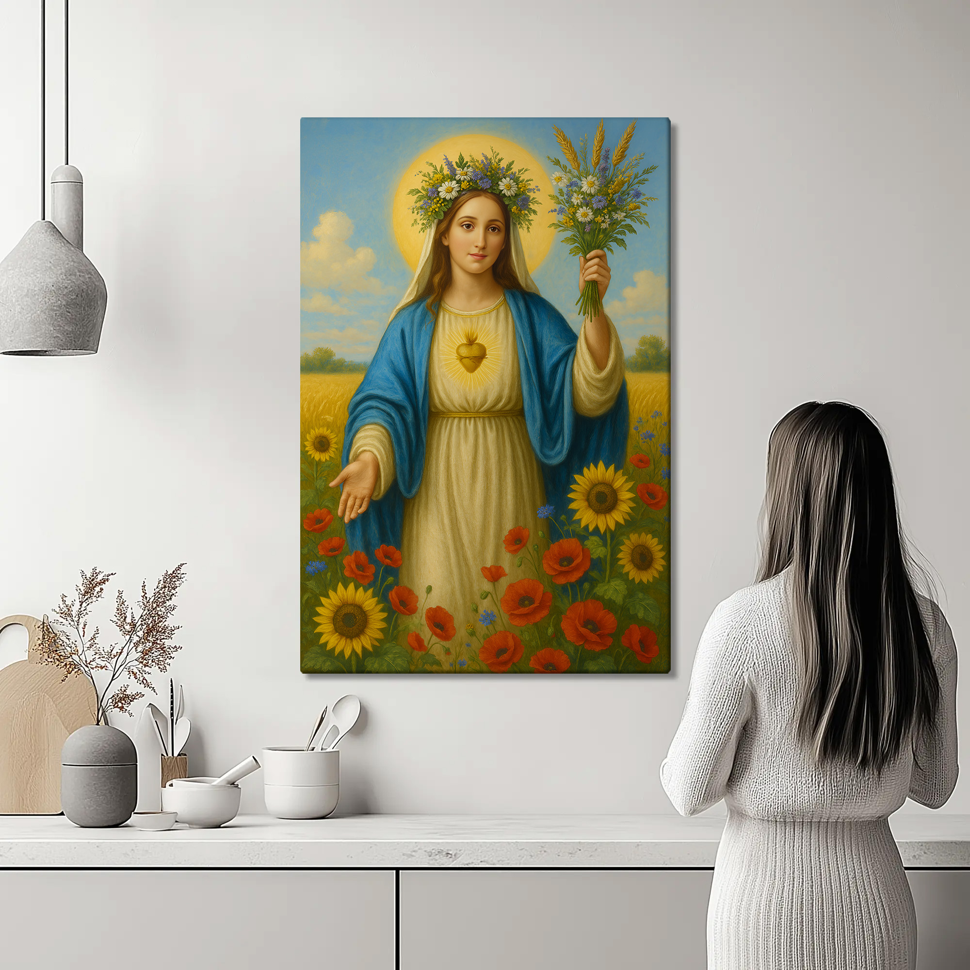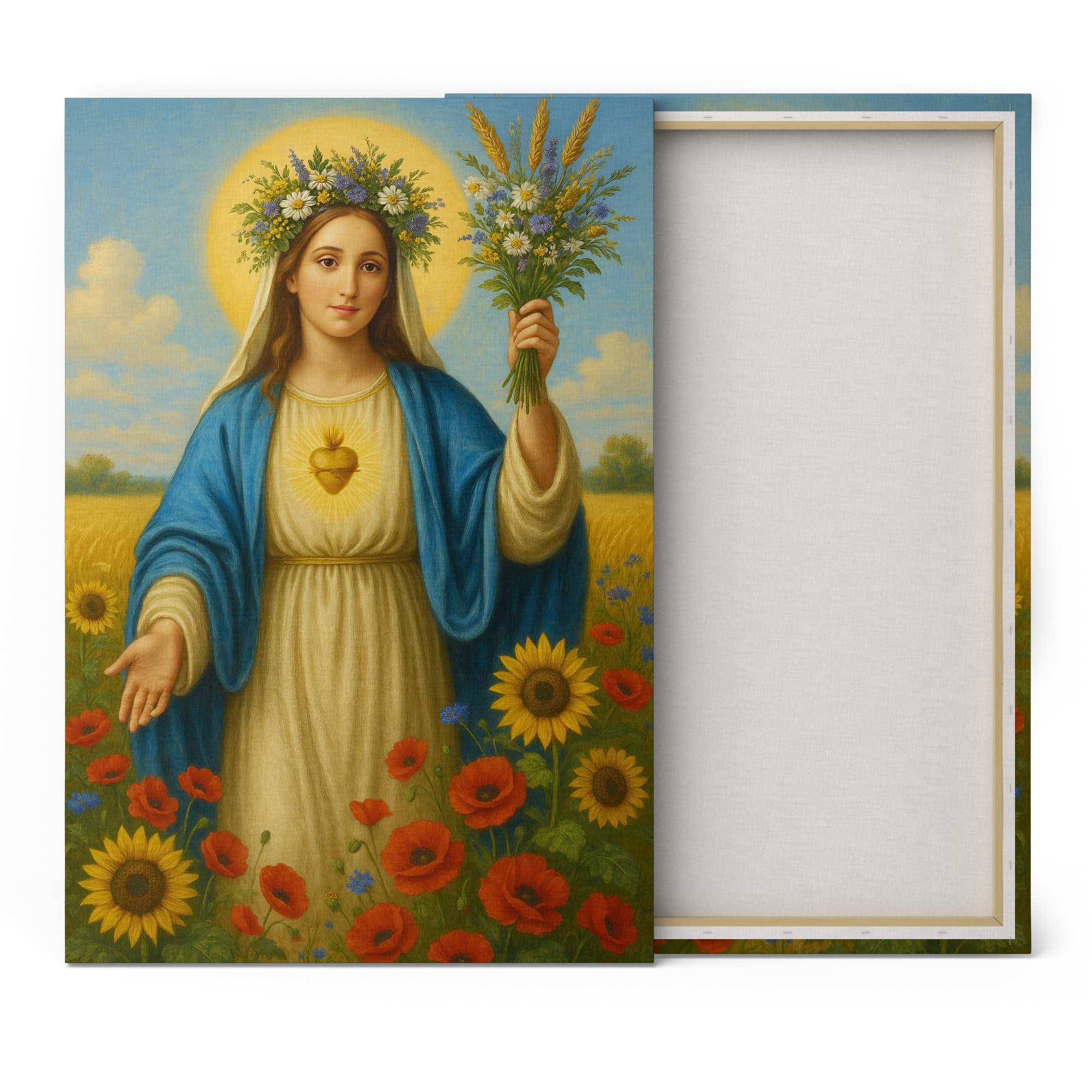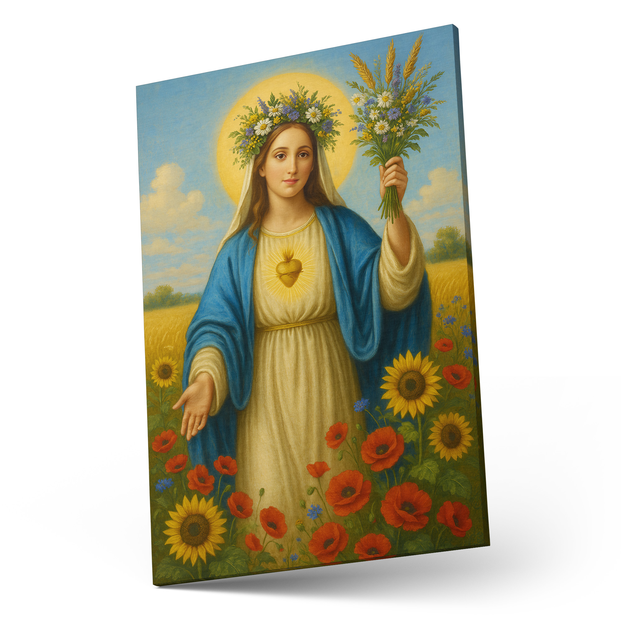 Obraz religijny na płótnie – Maryja z bukietem kwiatów. Canvas premium, ręcznie naciągnięty na krosna, gotowy do zawieszenia. Piękna dekoracja i wyjątkowy prezent religijny.