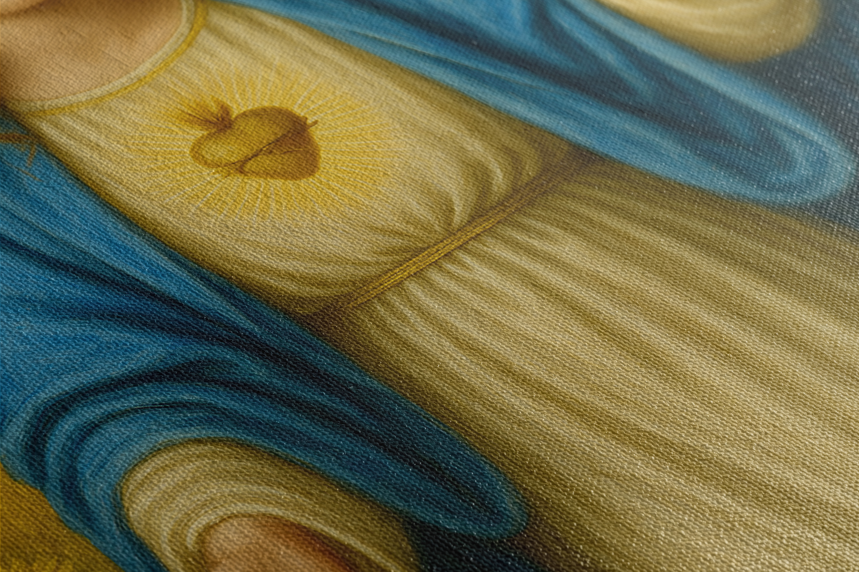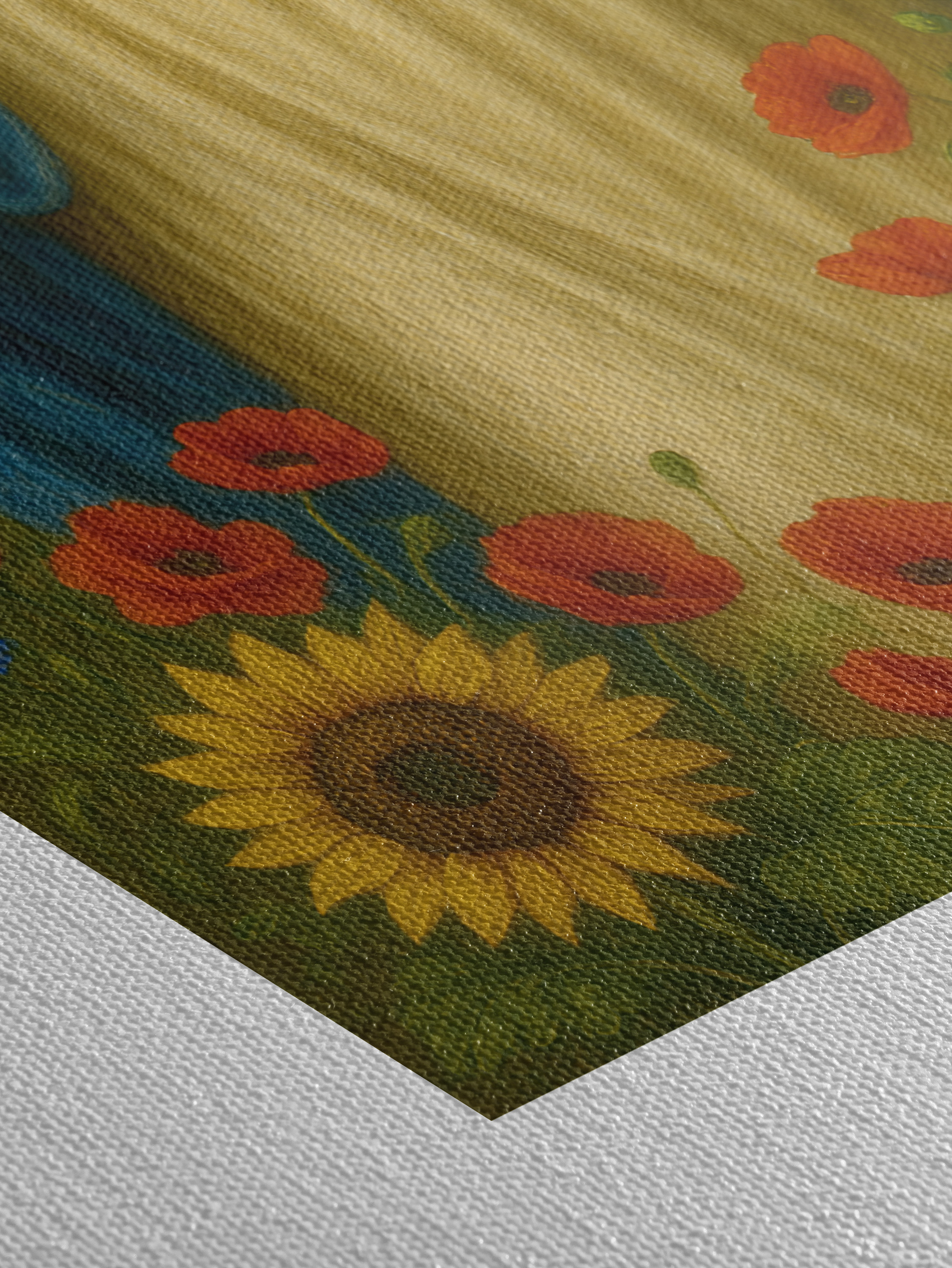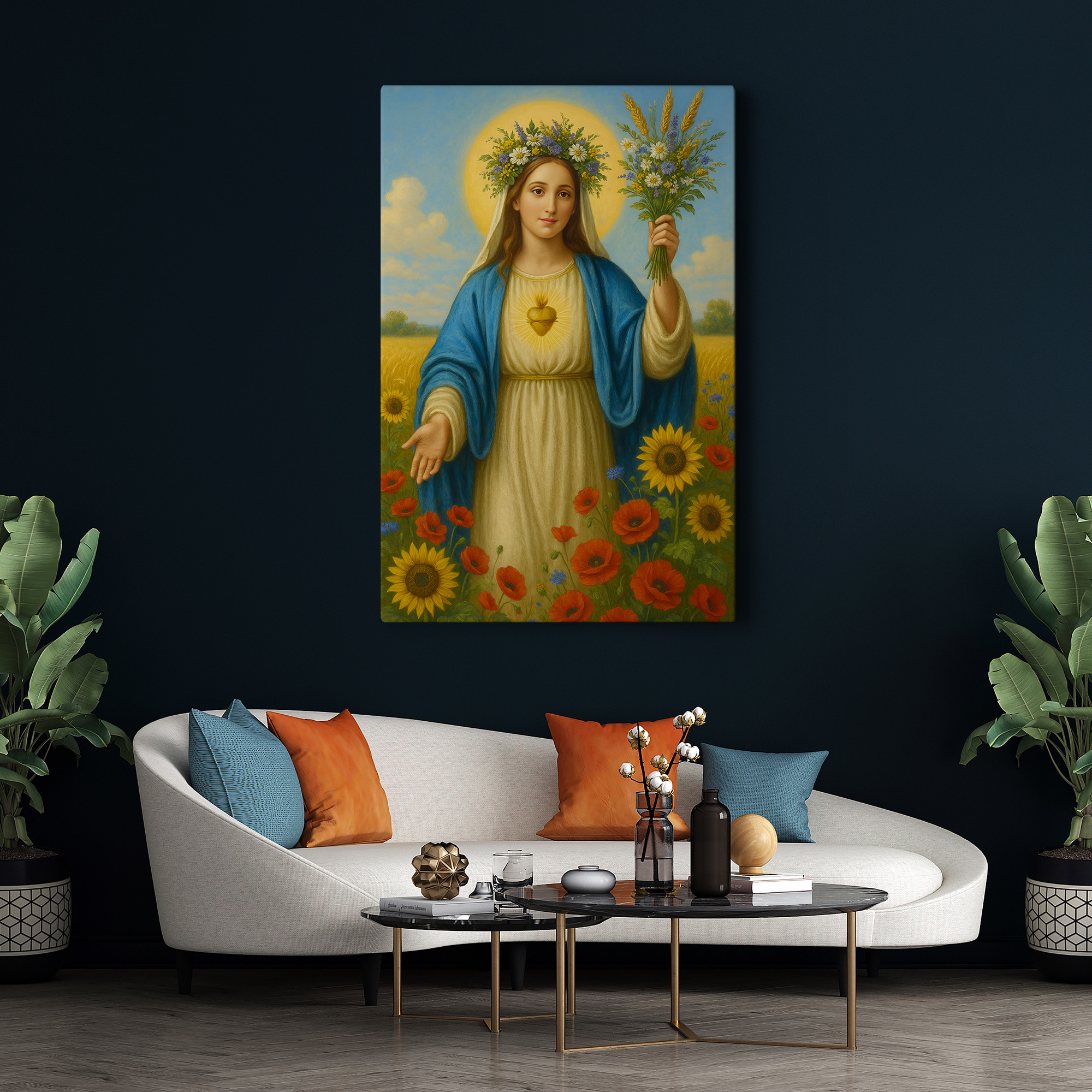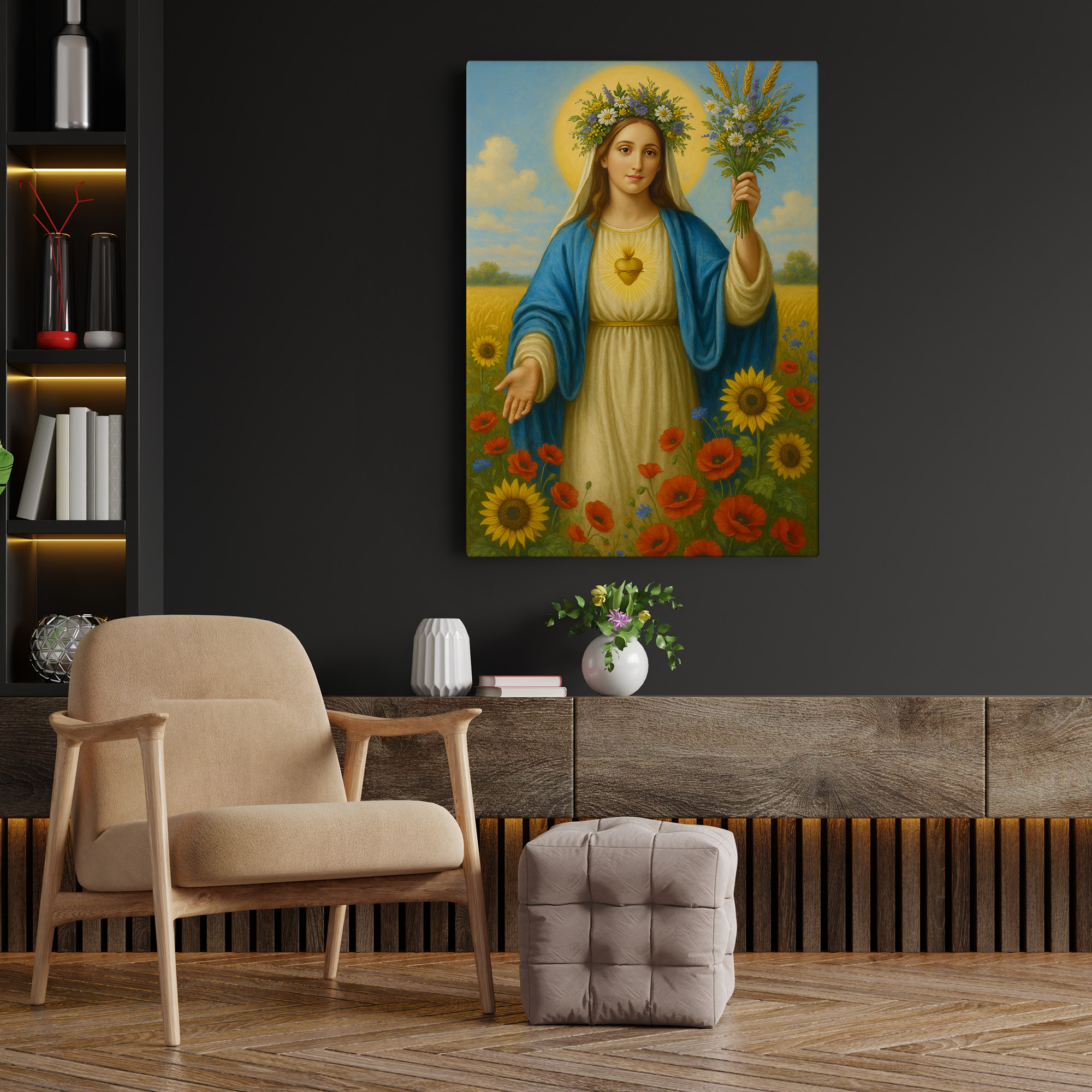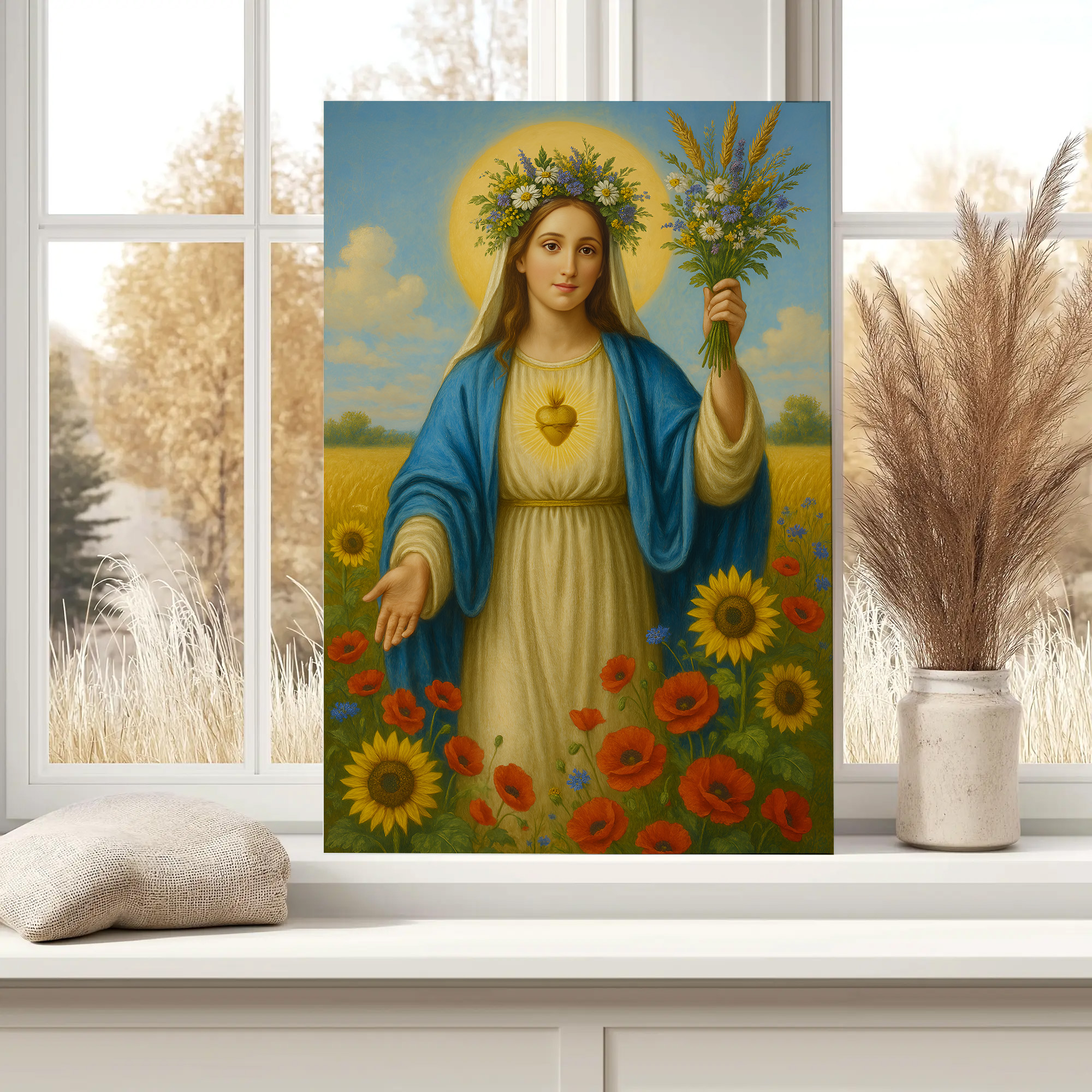 Obraz religijny na płótnie – Maryja z bukietem kwiatów. Canvas premium, ręcznie naciągnięty na krosna, gotowy do zawieszenia. Piękna dekoracja i wyjątkowy prezent religijny.