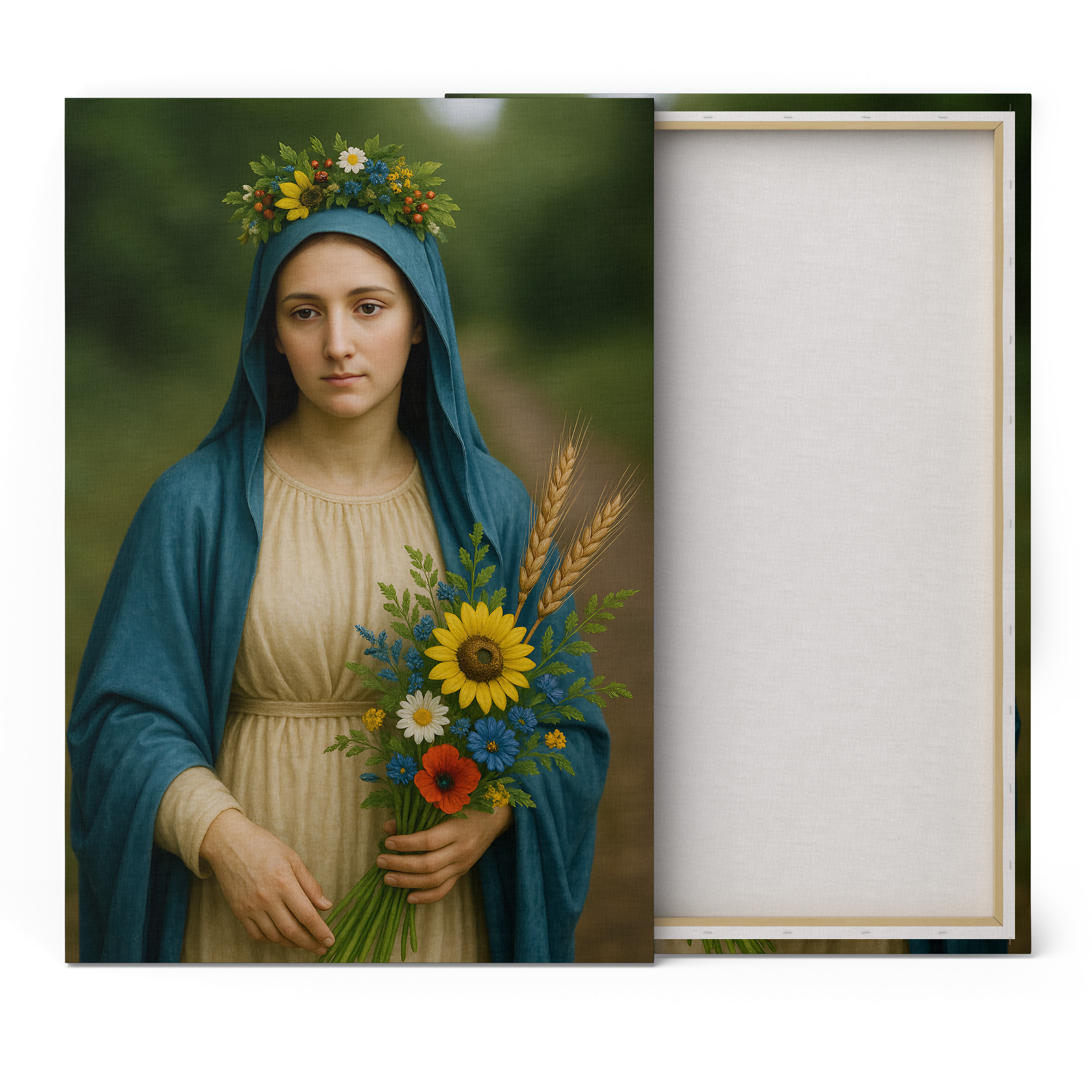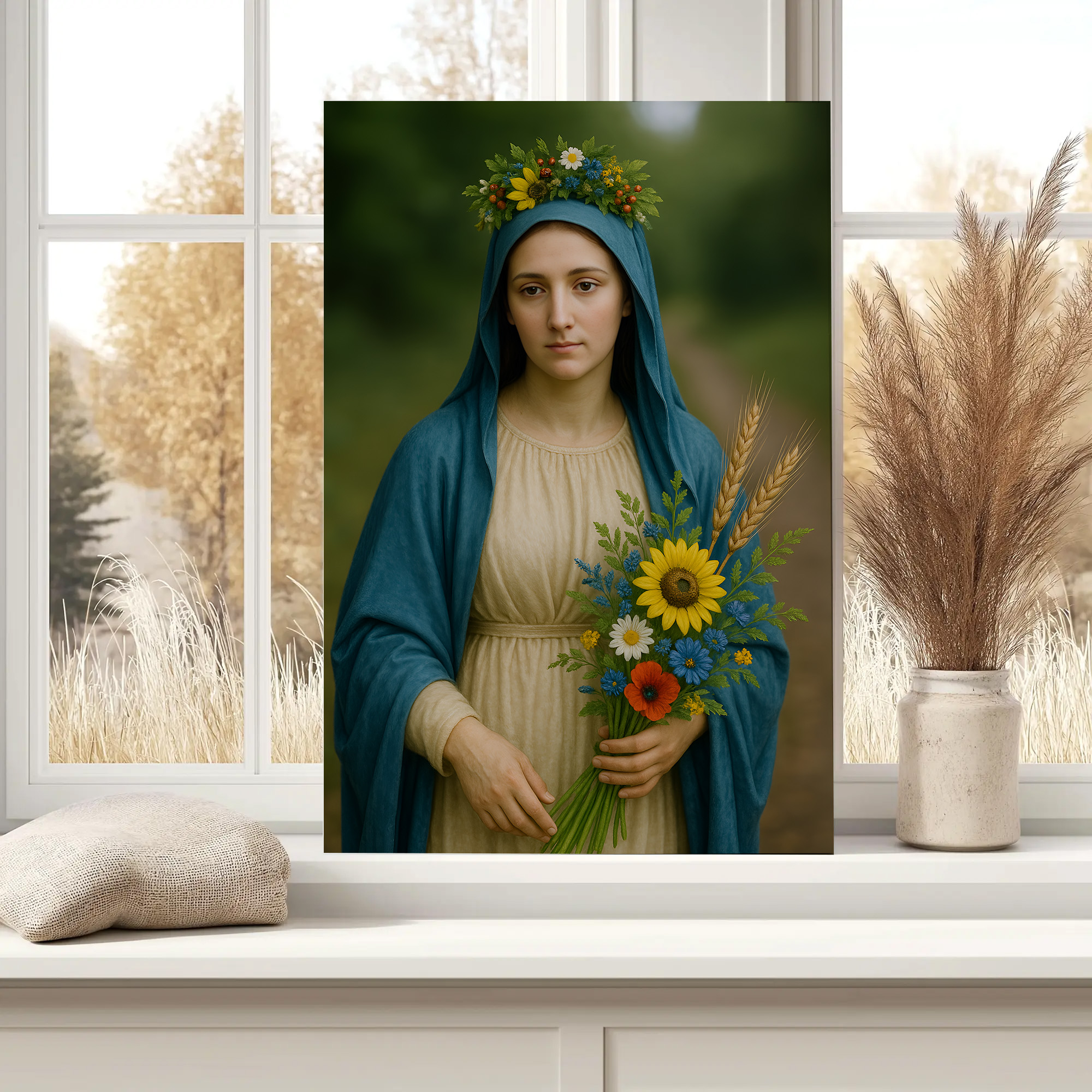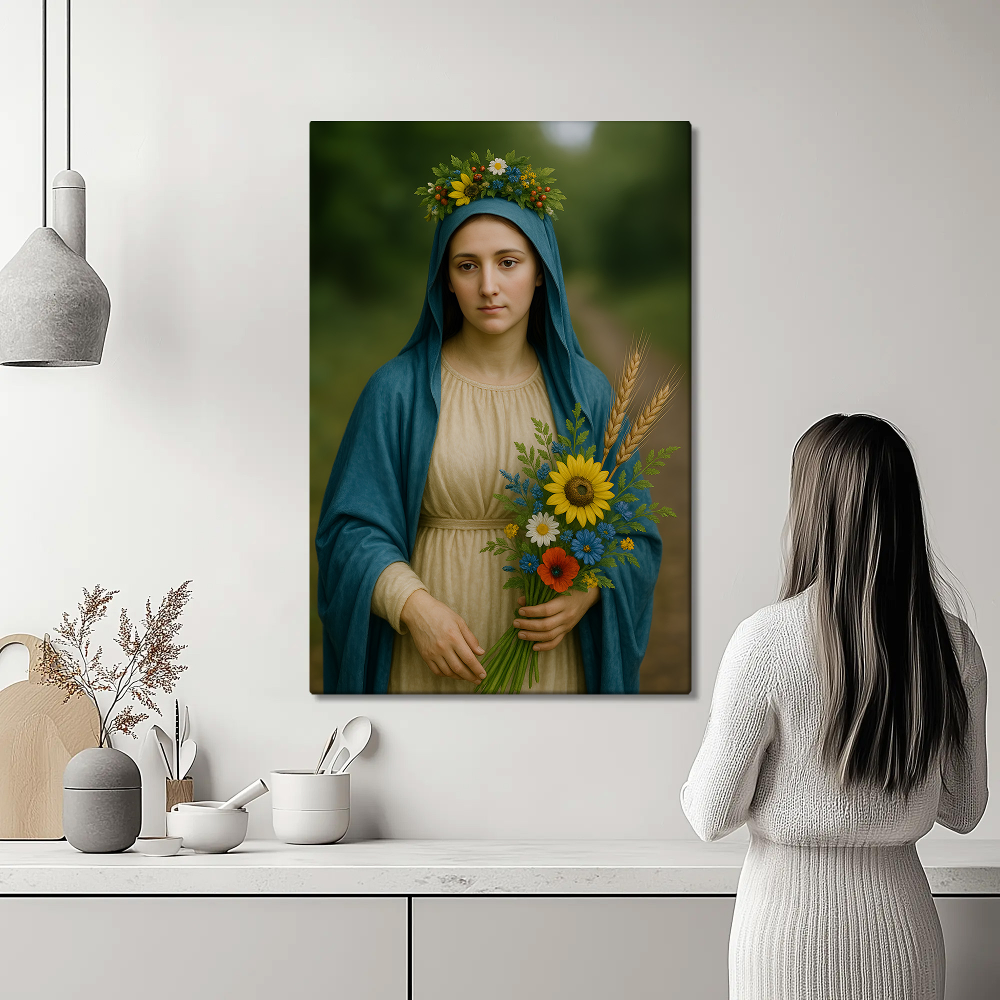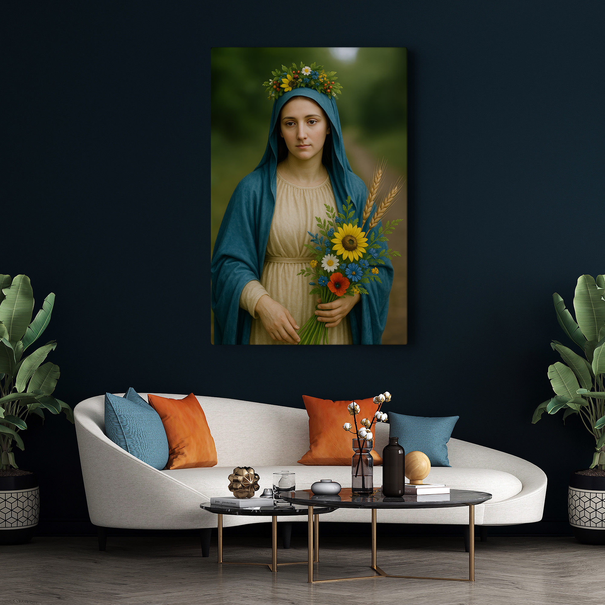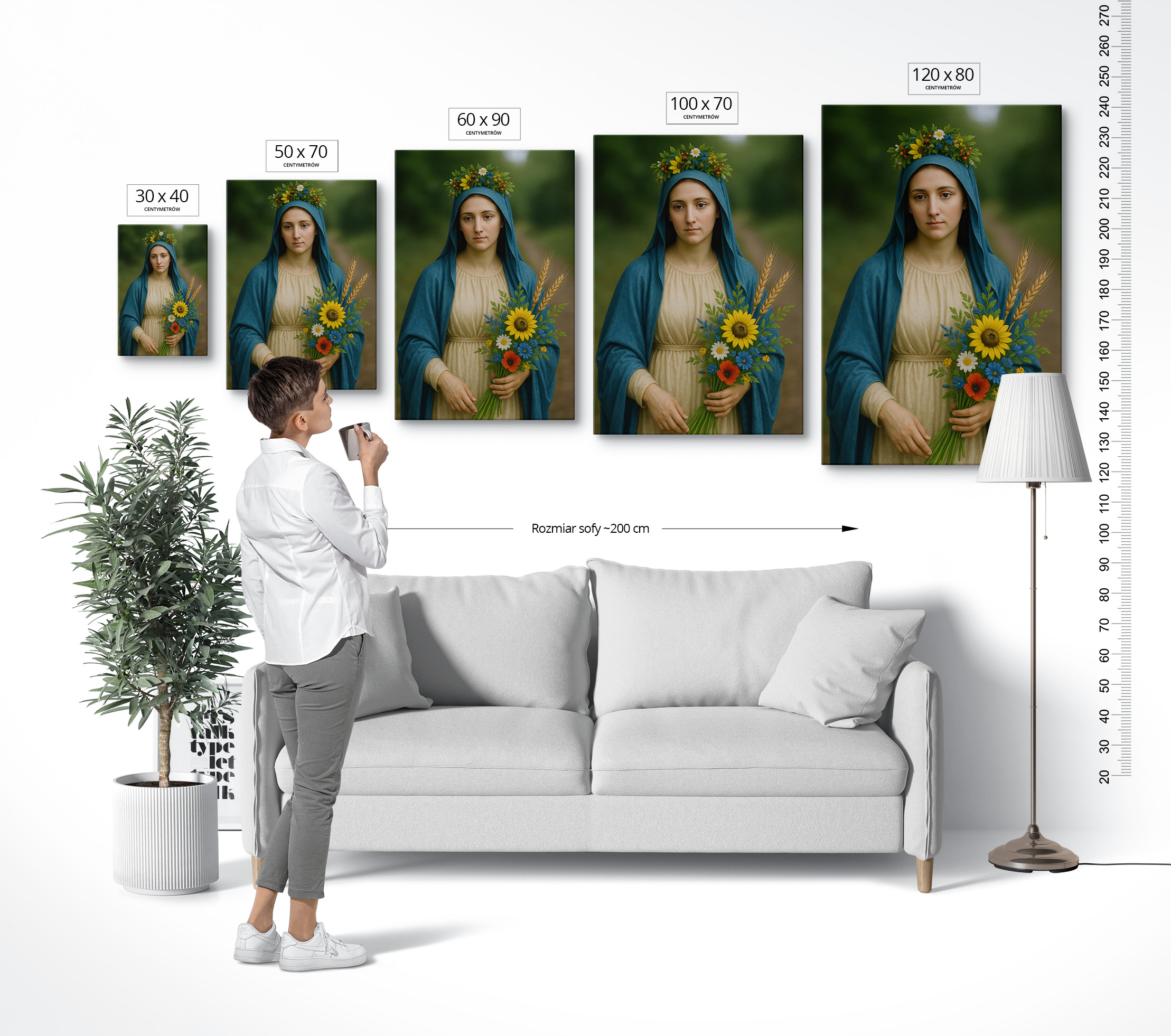 Zamów obraz „Maryja z bukietem zbóż i kwiatów" i wprowadź do swojego domu piękno prostoty oraz błogosławieństwo Matki Bożej.