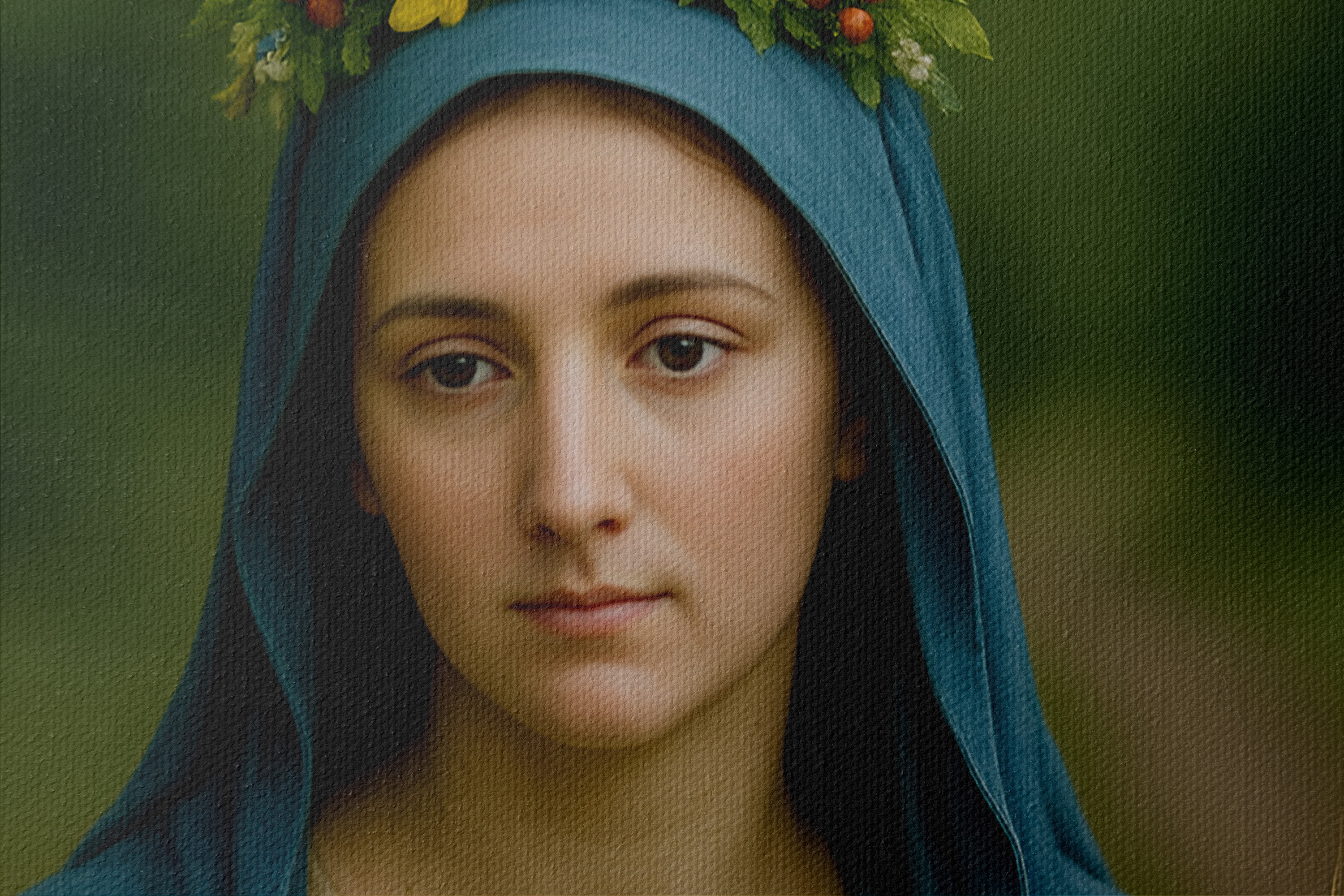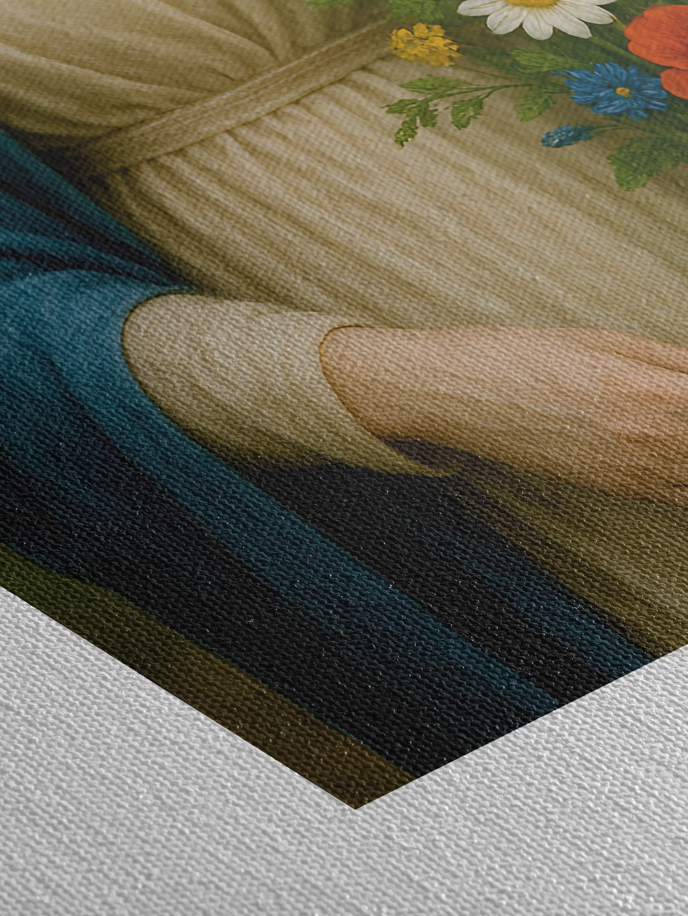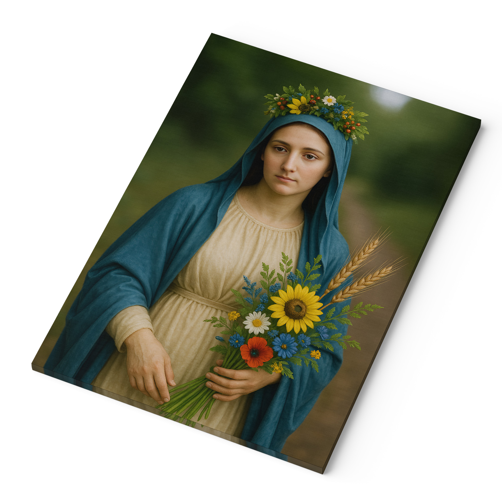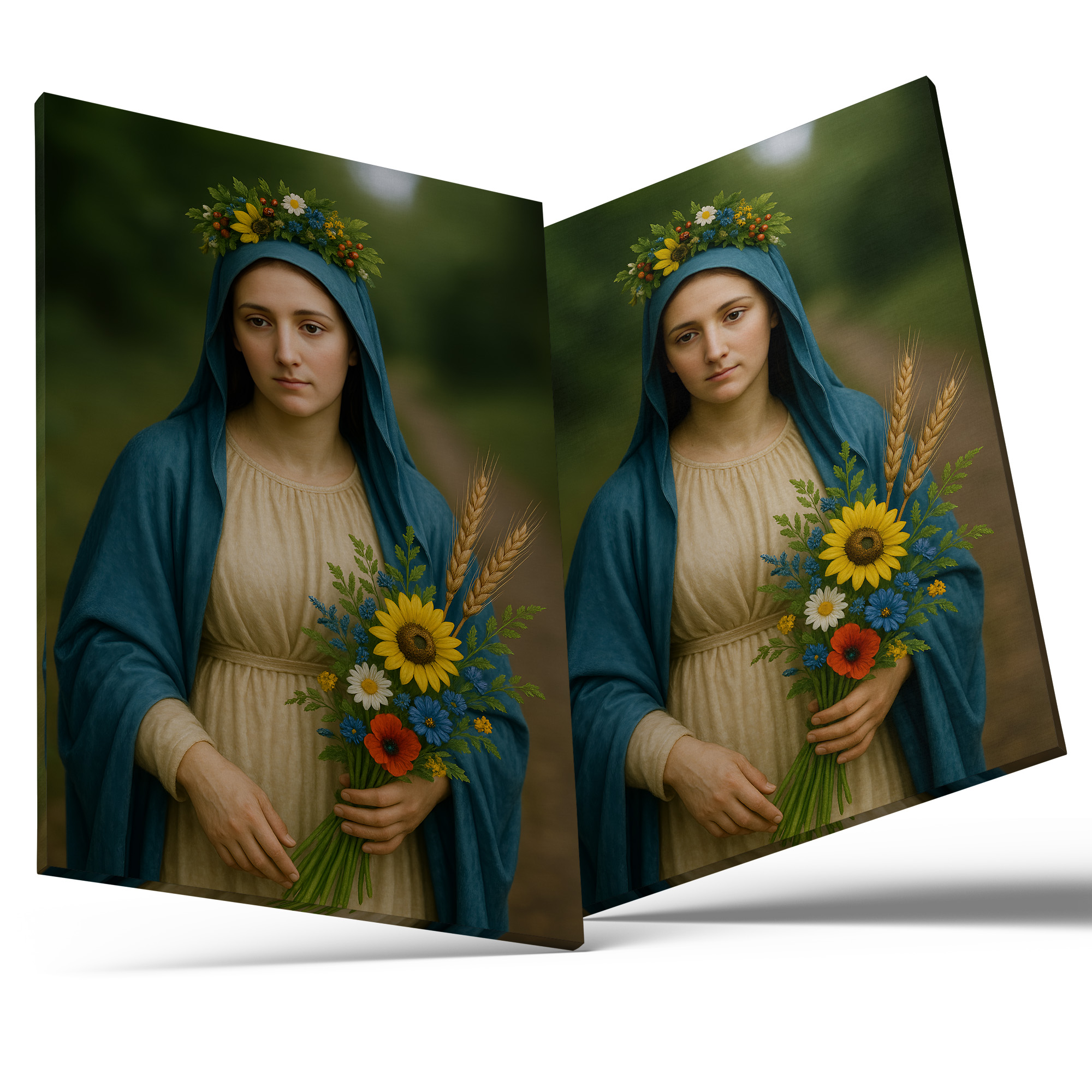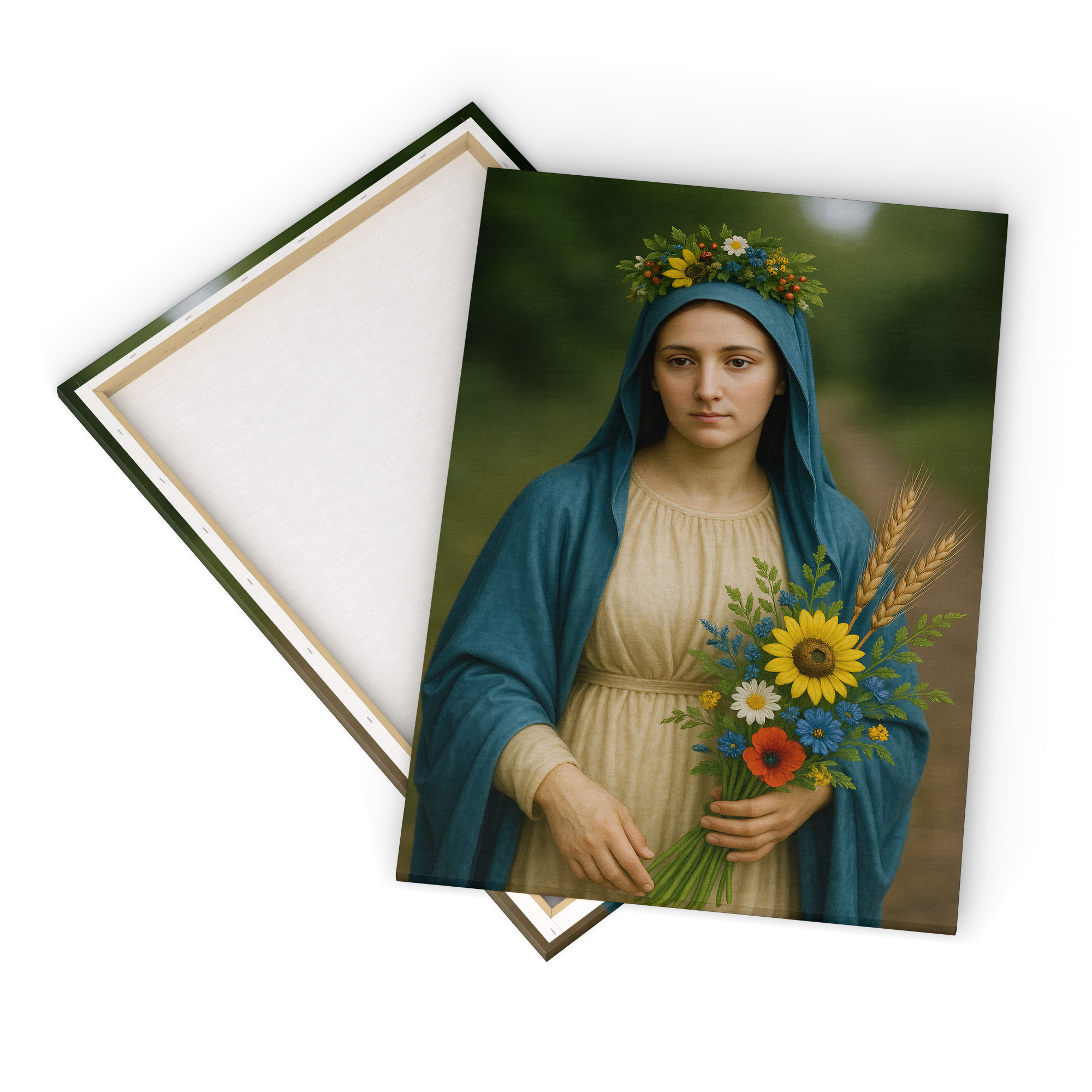 Zamów obraz „Maryja z bukietem zbóż i kwiatów" i wprowadź do swojego domu piękno prostoty oraz błogosławieństwo Matki Bożej.