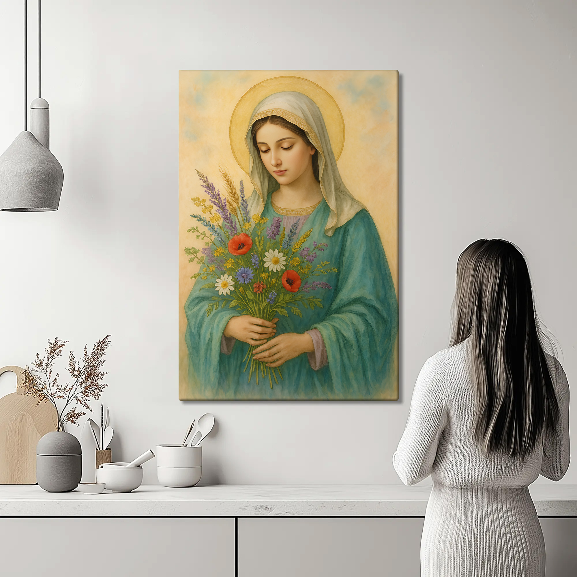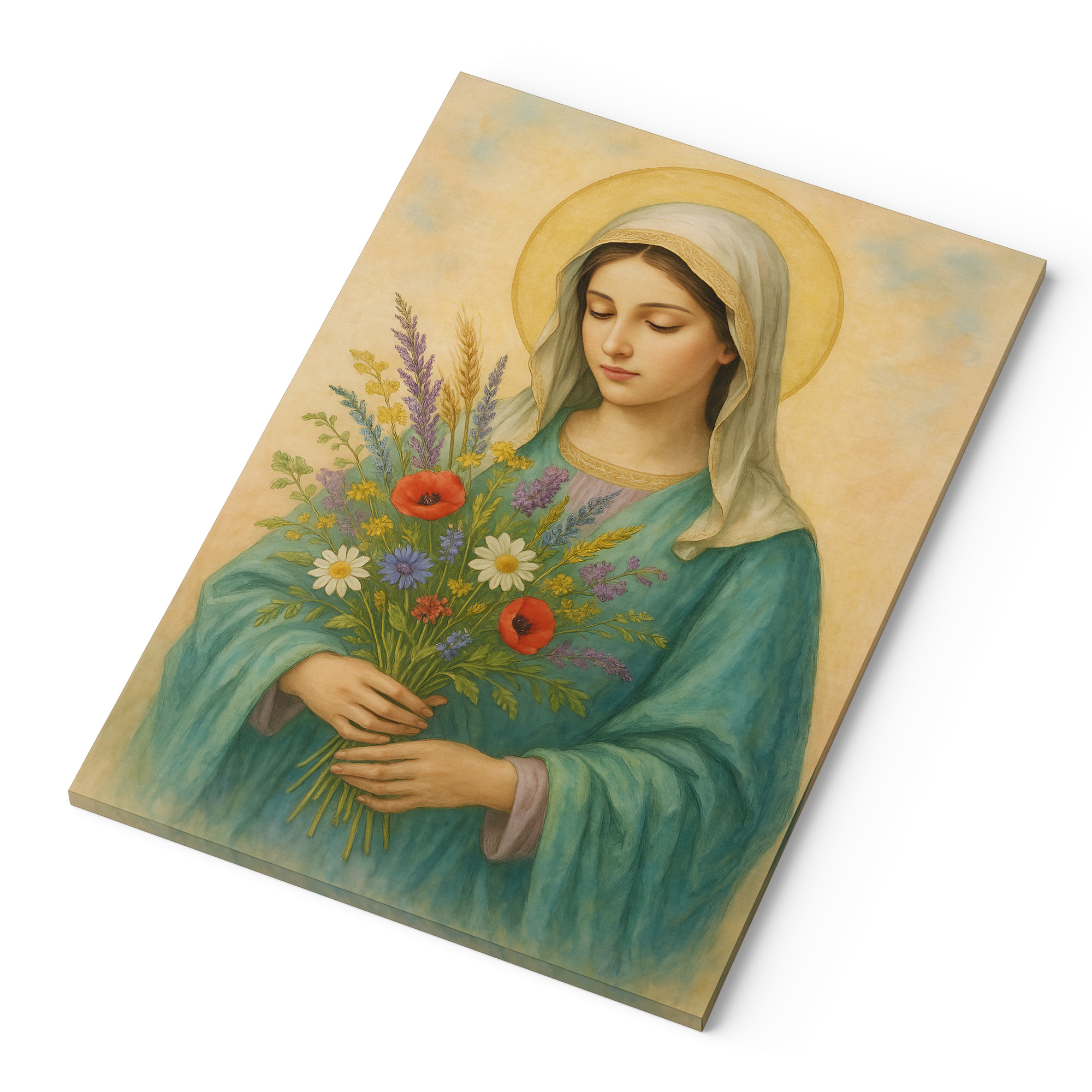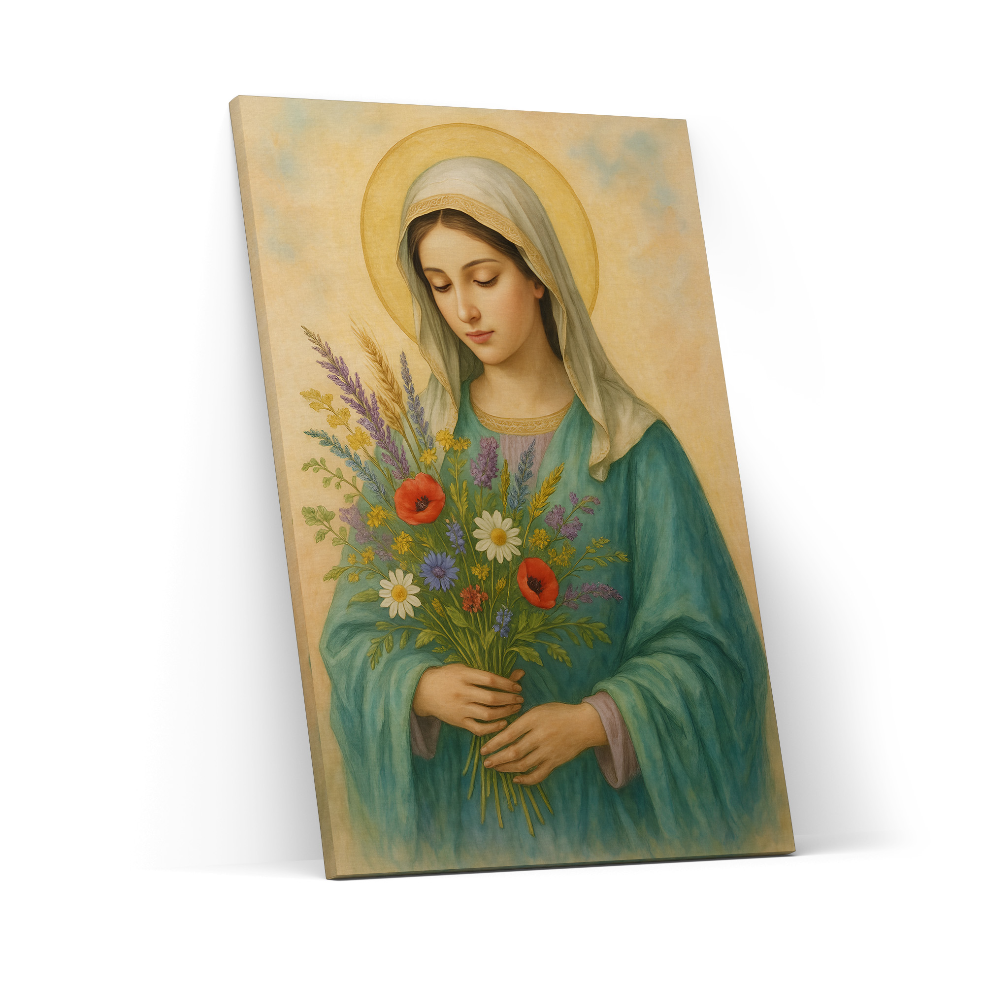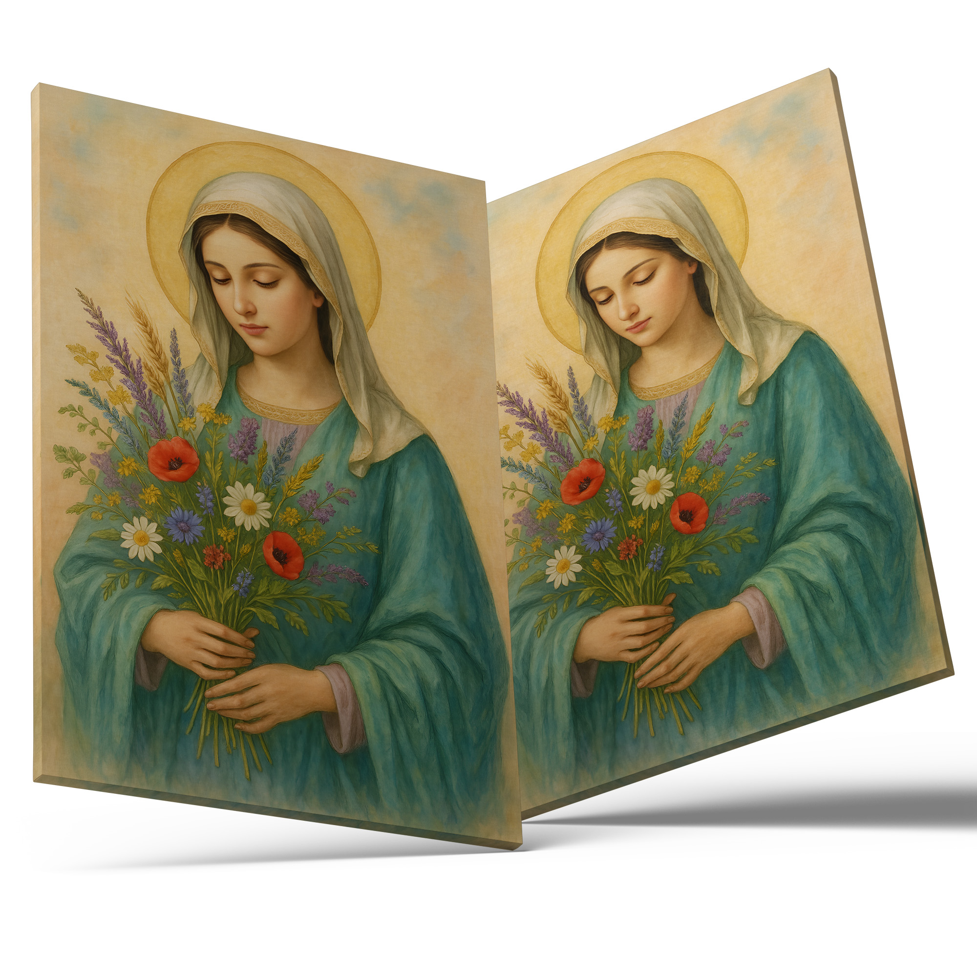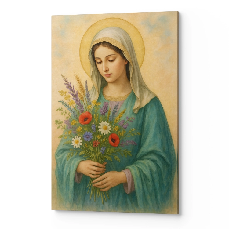 Zamów obraz „Maryja z bukietem polnych kwiatów" i zaproś Jej łagodność oraz błogosławieństwo do swojego domu.