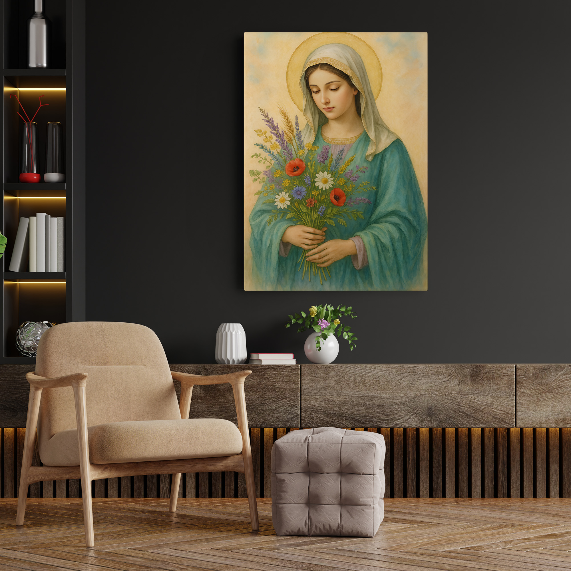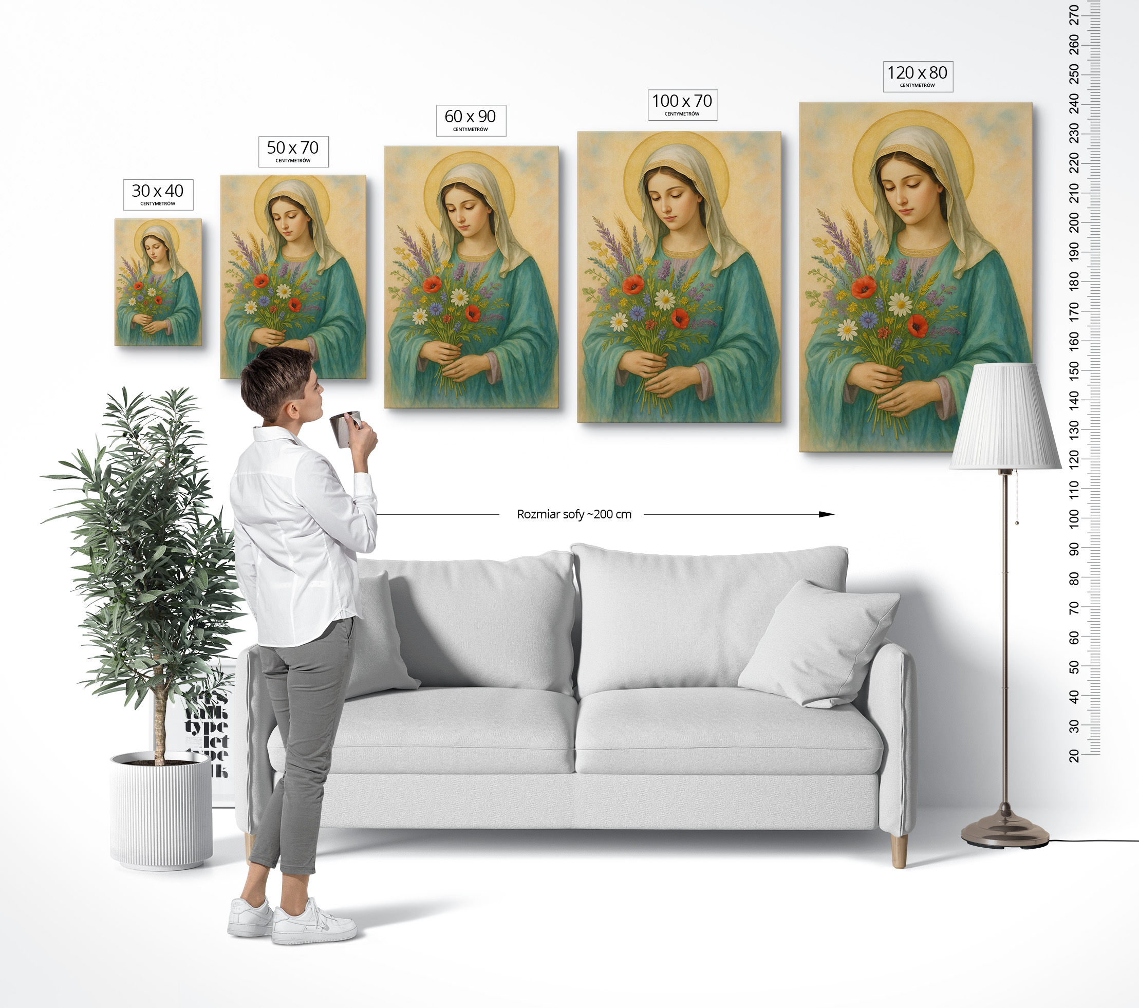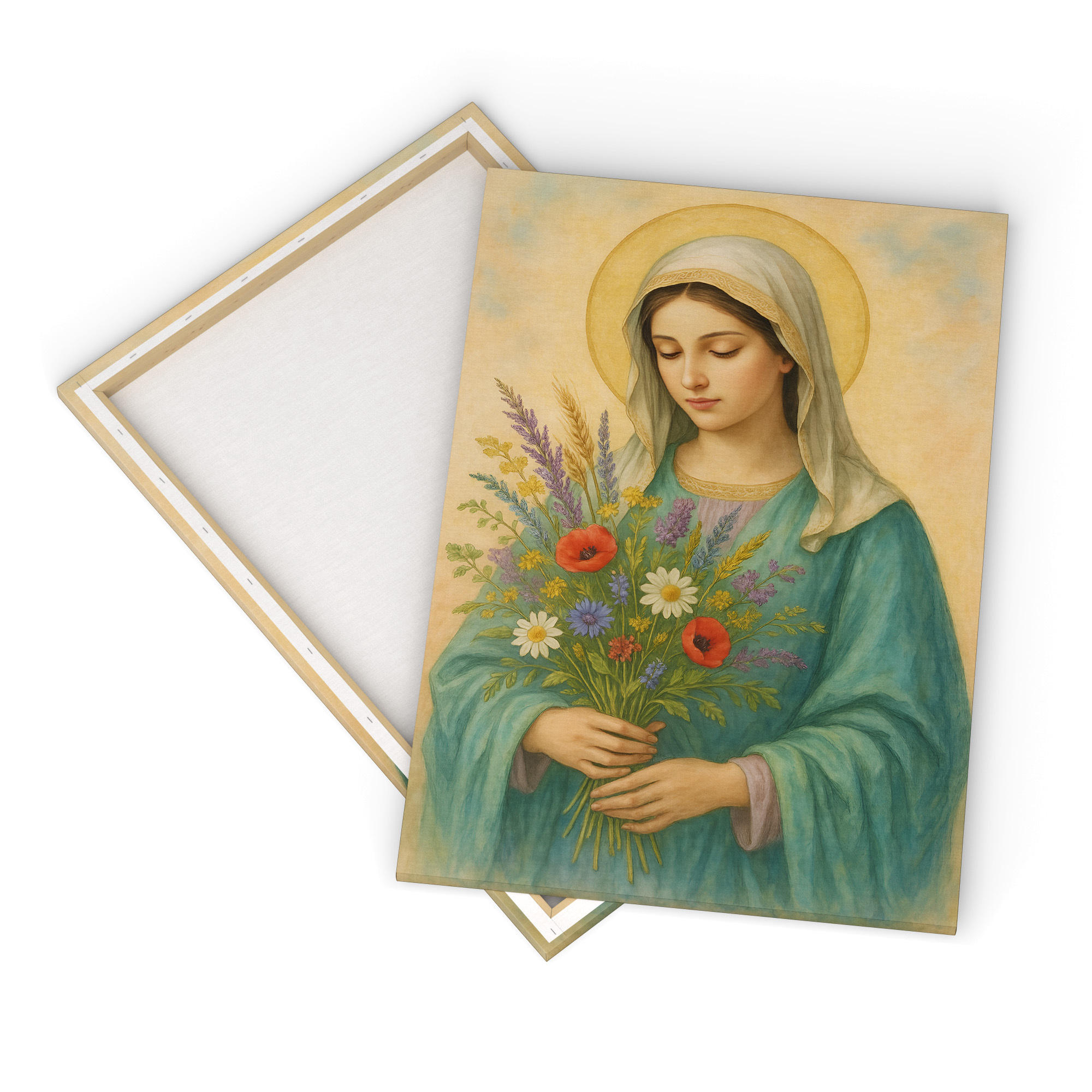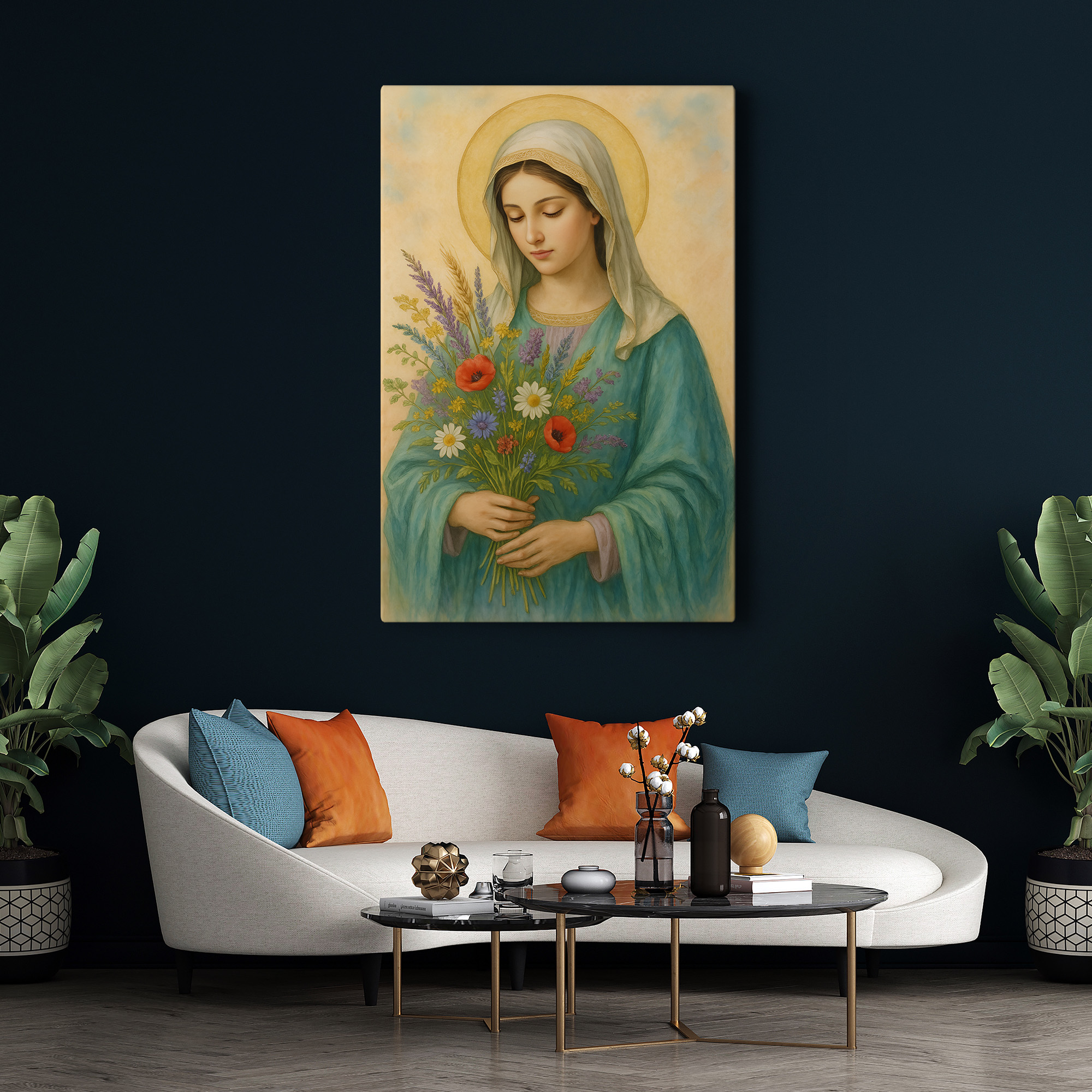 Zamów obraz „Maryja z bukietem polnych kwiatów" i zaproś Jej łagodność oraz błogosławieństwo do swojego domu.