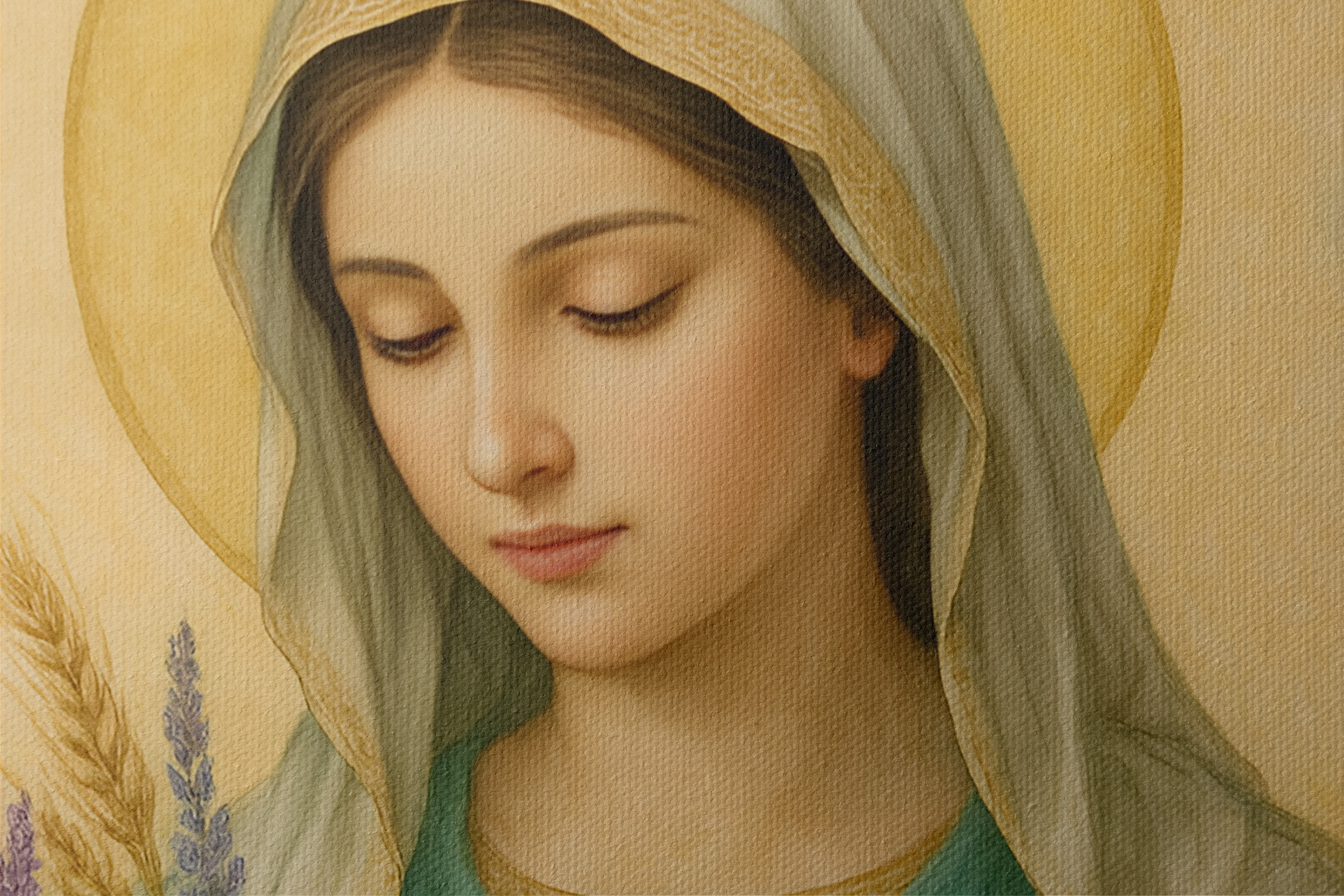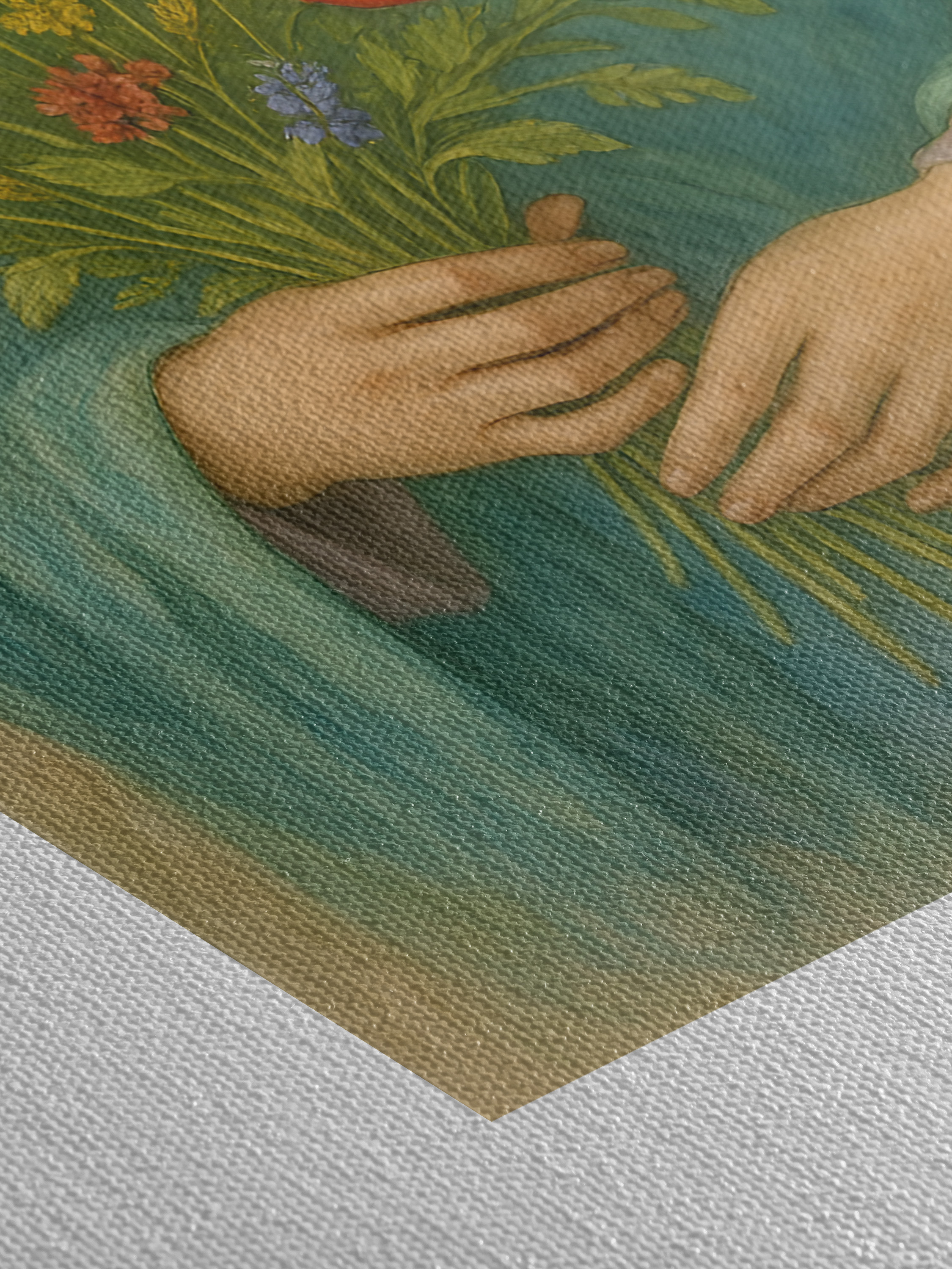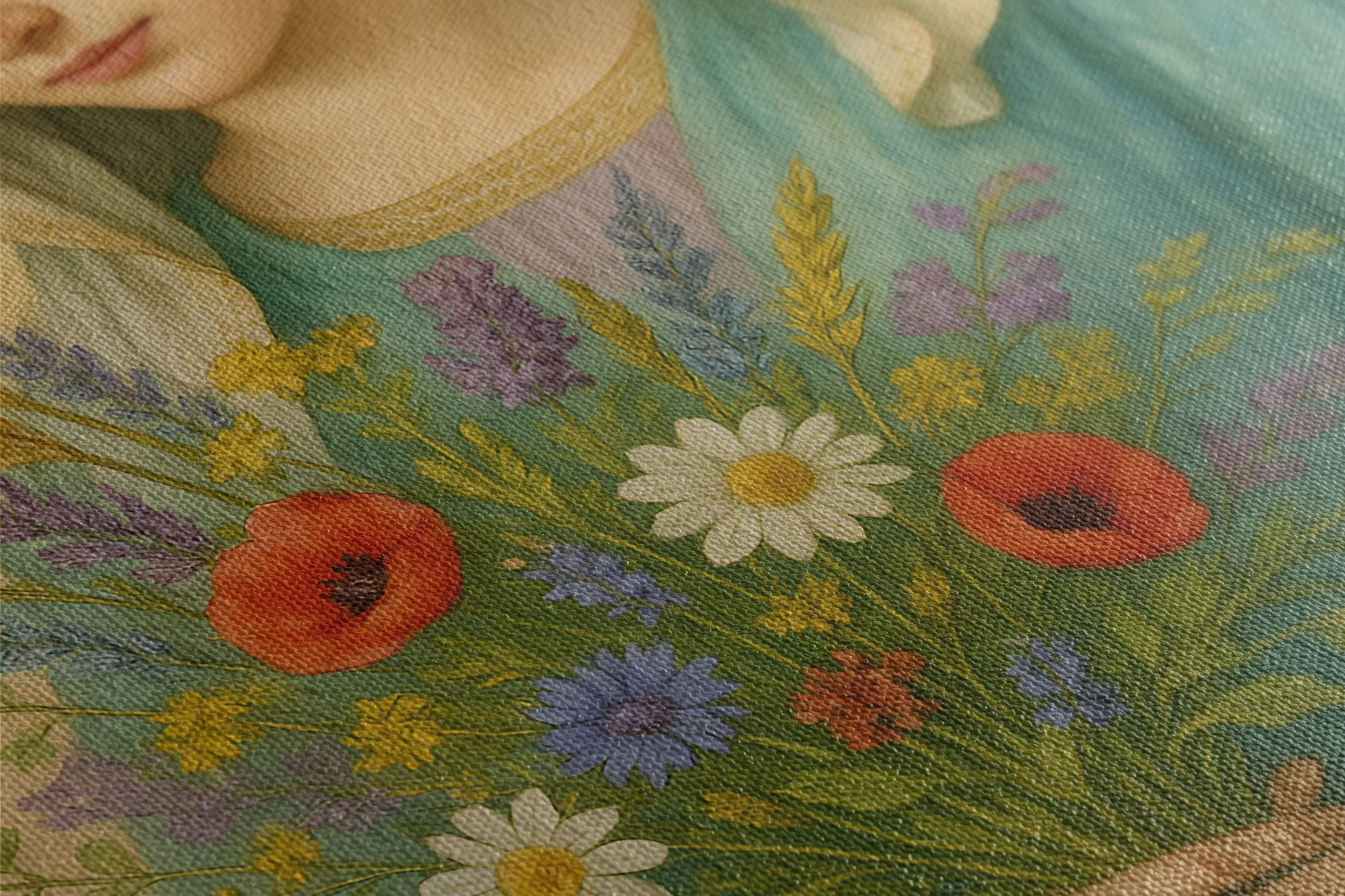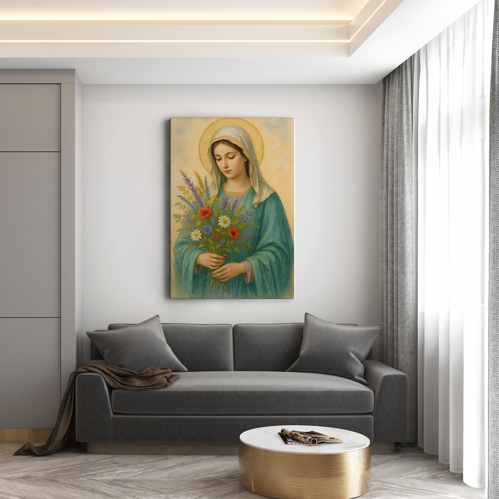 Zamów obraz „Maryja z bukietem polnych kwiatów" i zaproś Jej łagodność oraz błogosławieństwo do swojego domu.