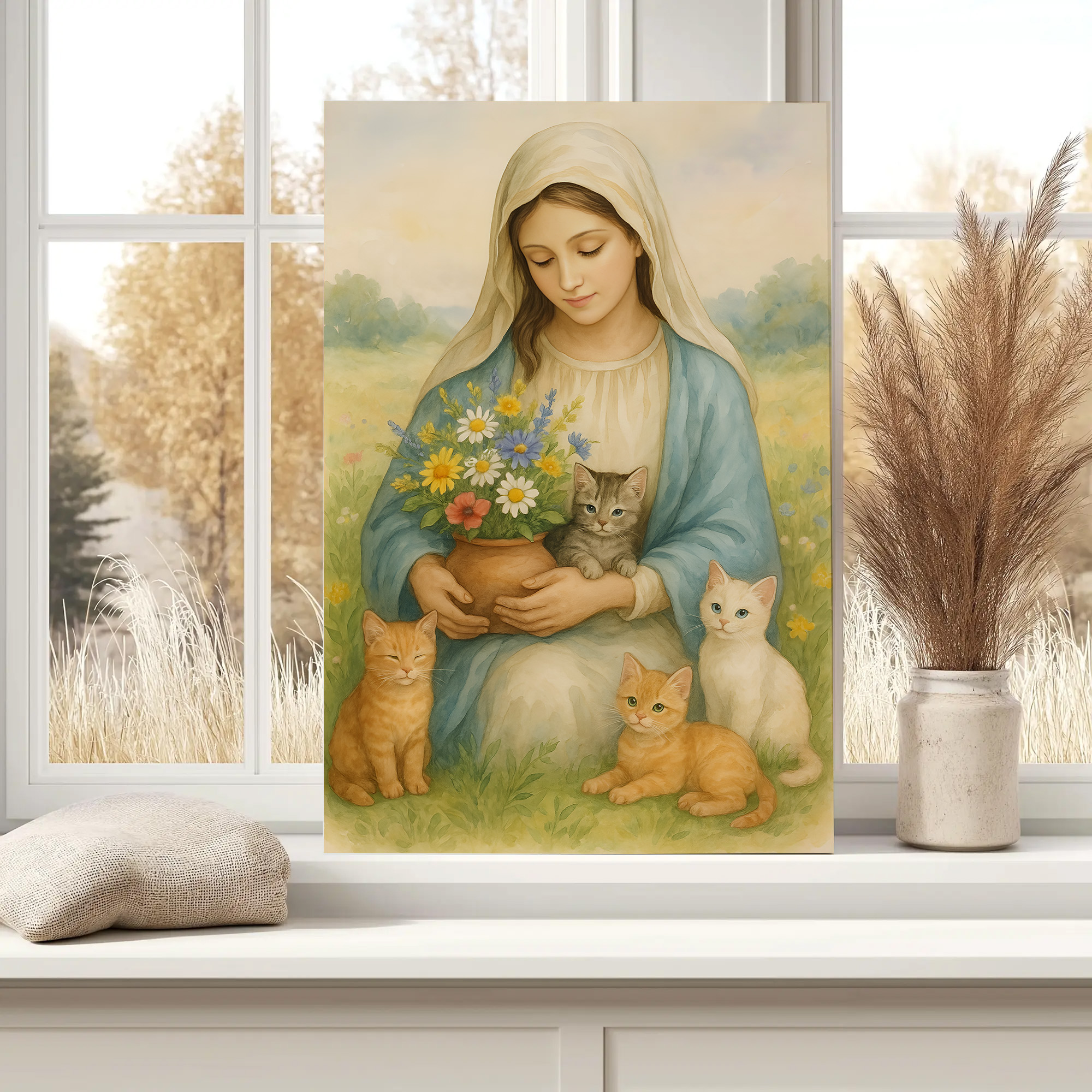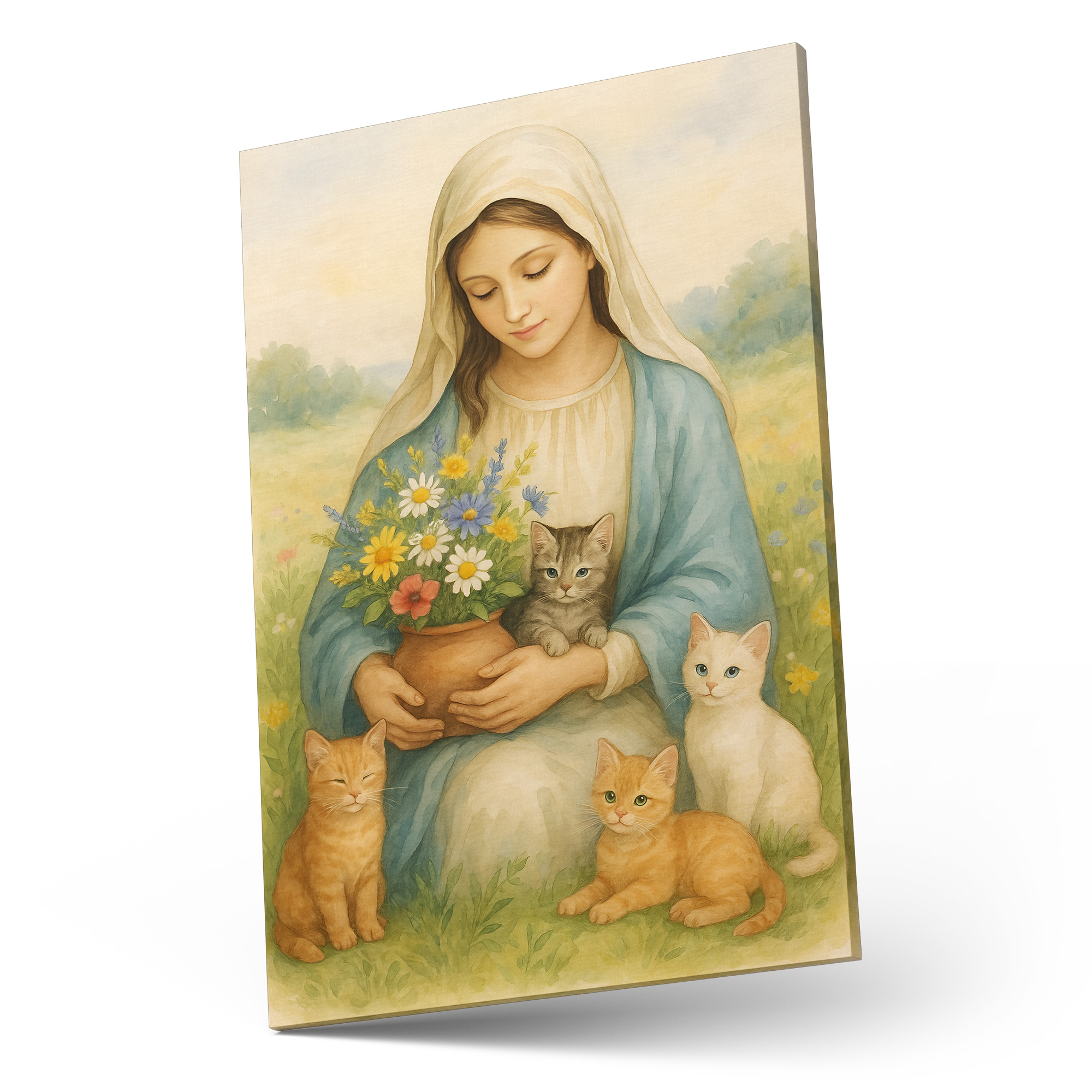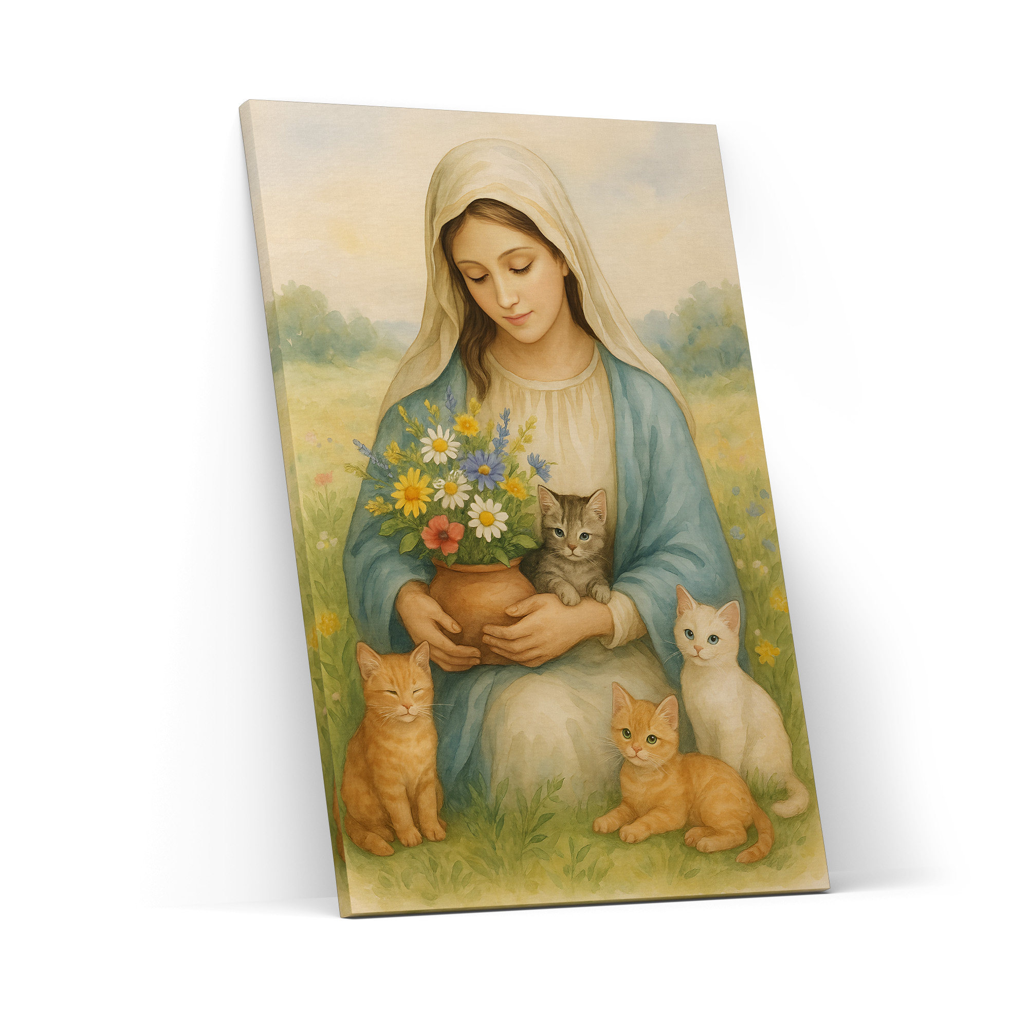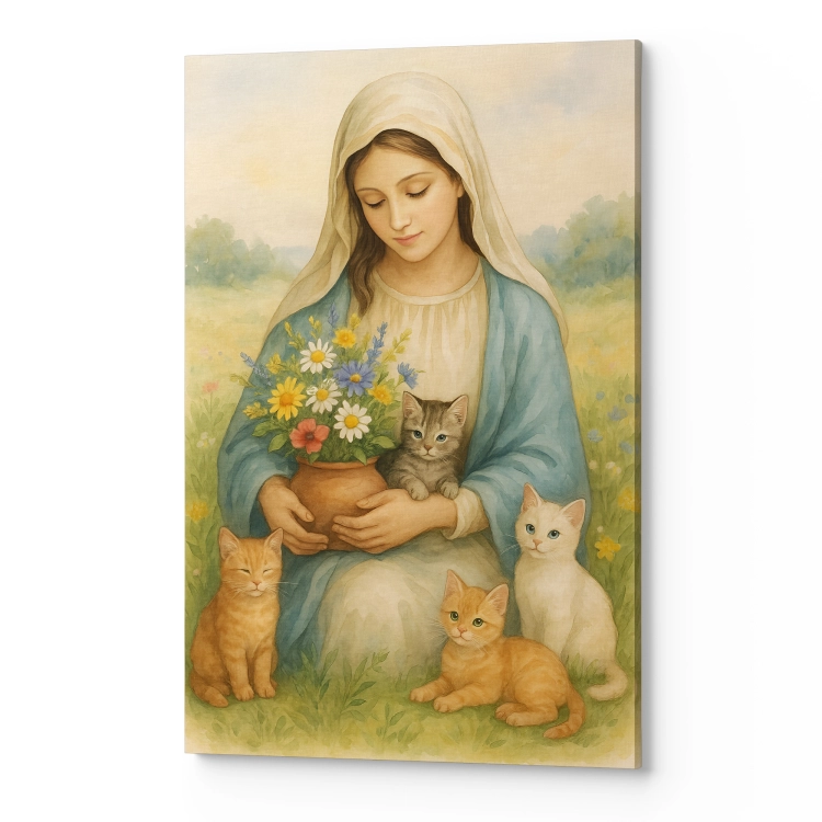 Zamów obraz „Maryja z kwiatami i kotkami" i pozwól, by radość, pokój i miłość Matki Bożej rozświetlały Twoje wnętrze.