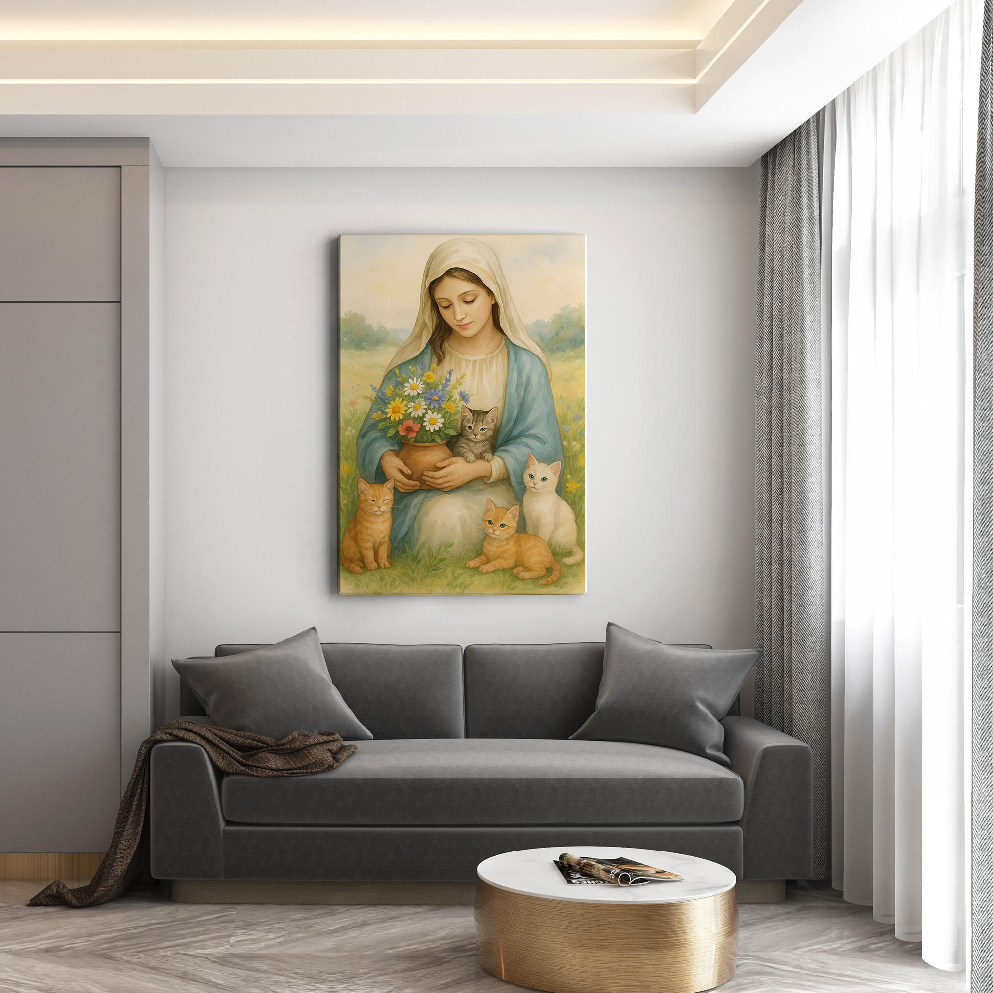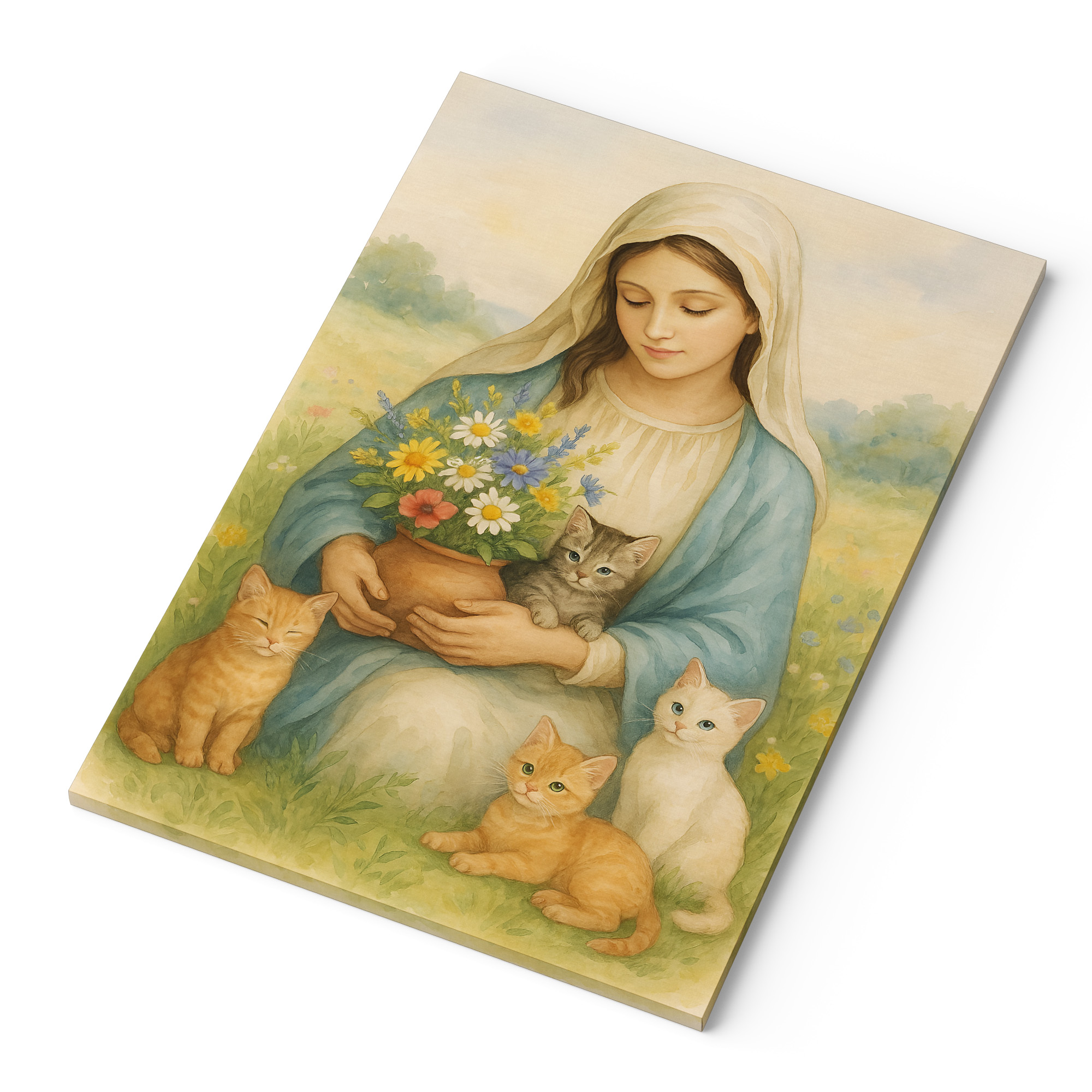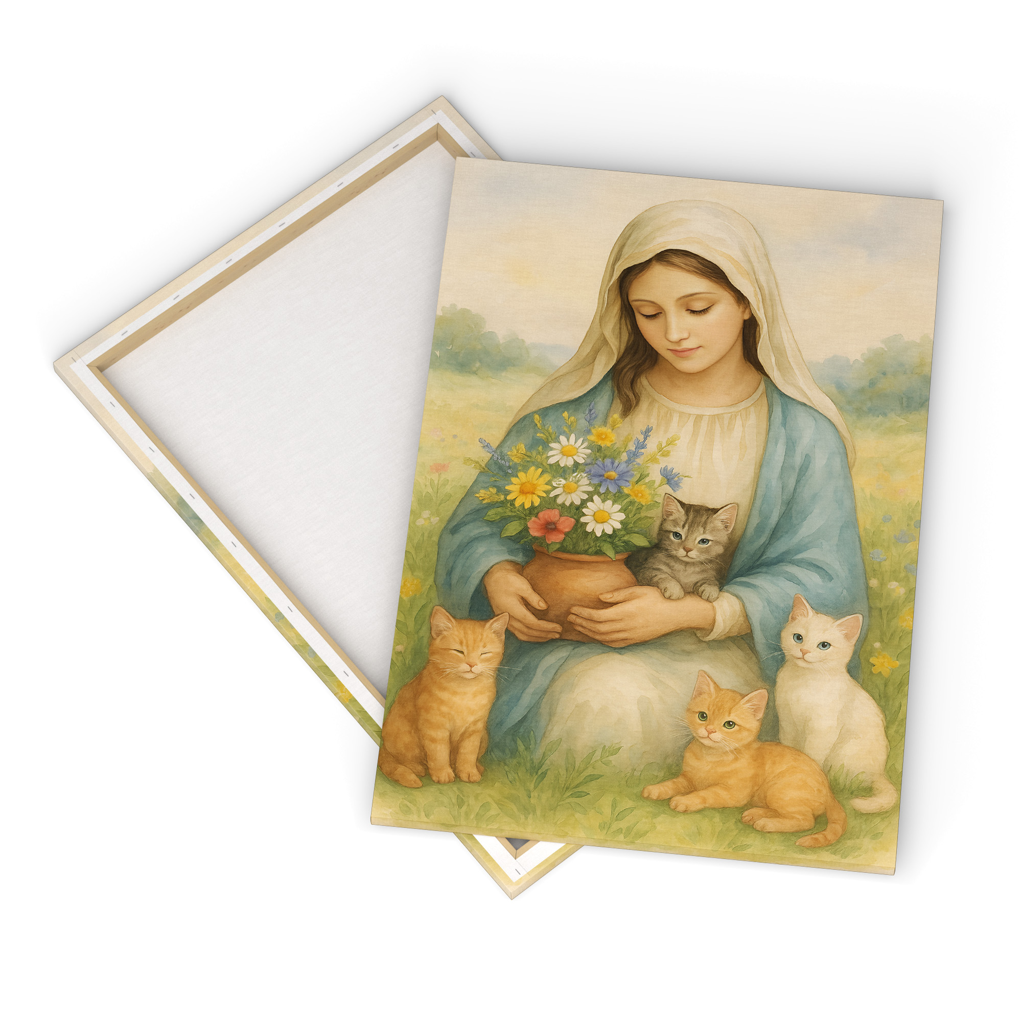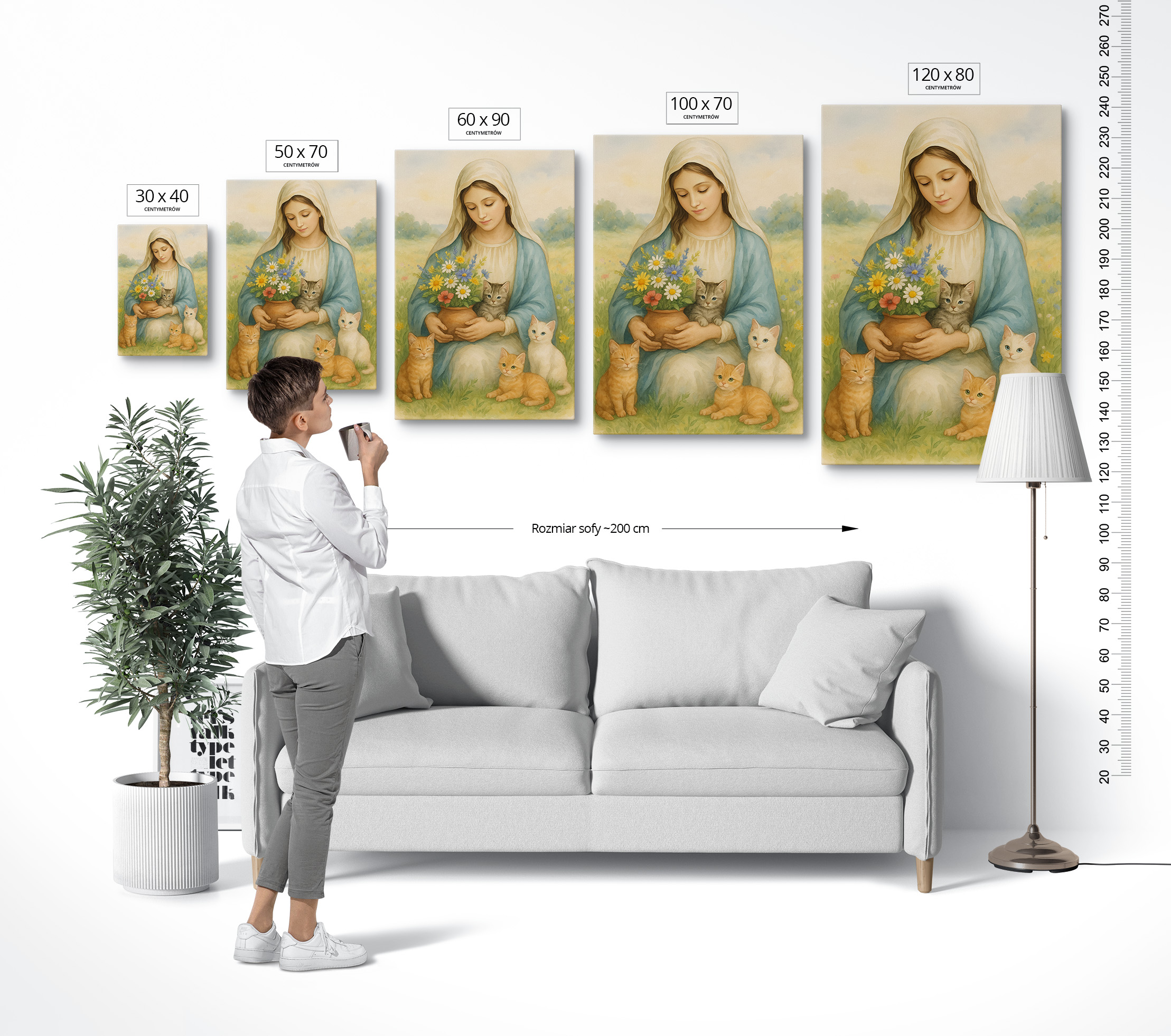 Zamów obraz „Maryja z kwiatami i kotkami" i pozwól, by radość, pokój i miłość Matki Bożej rozświetlały Twoje wnętrze.