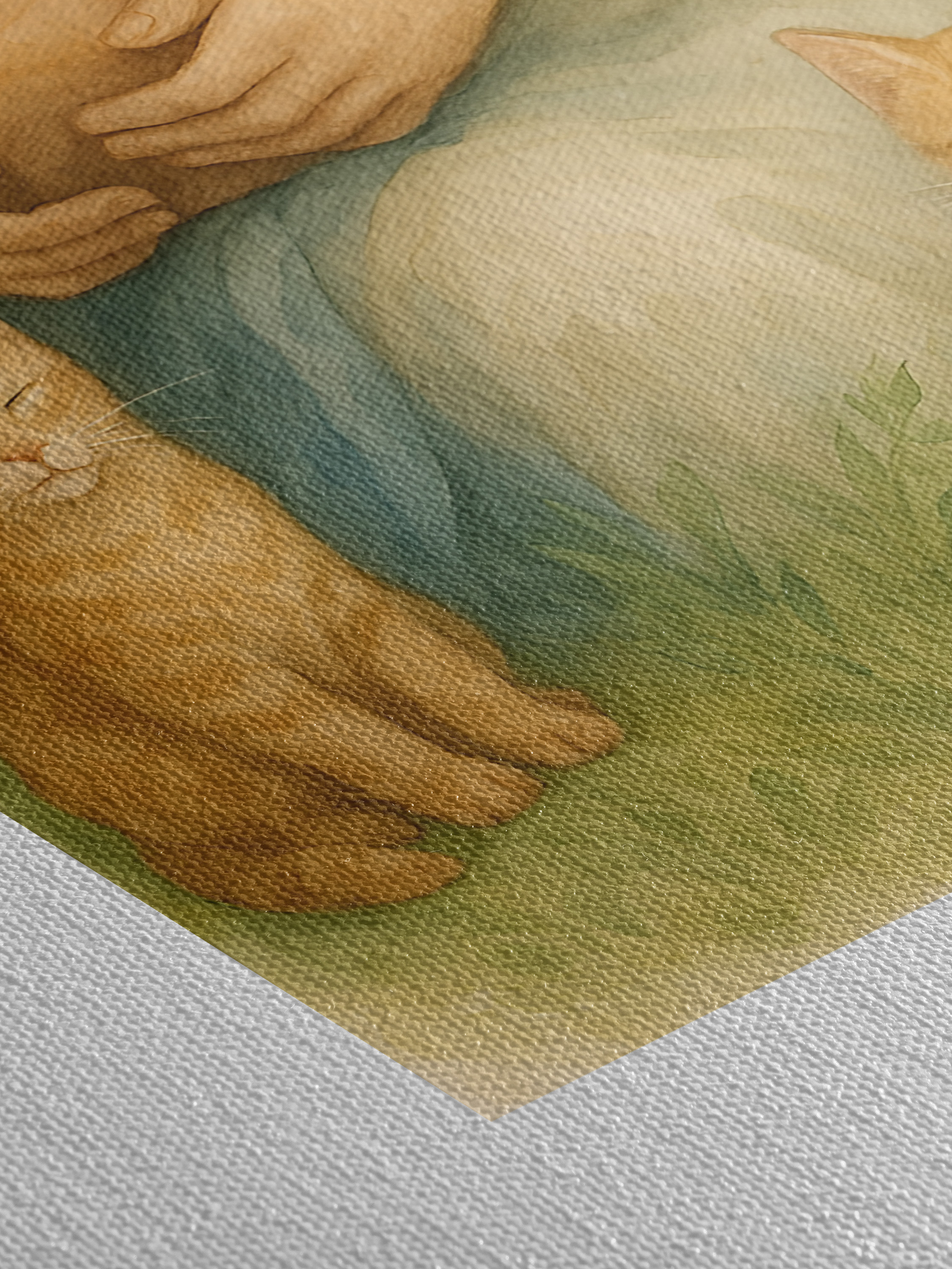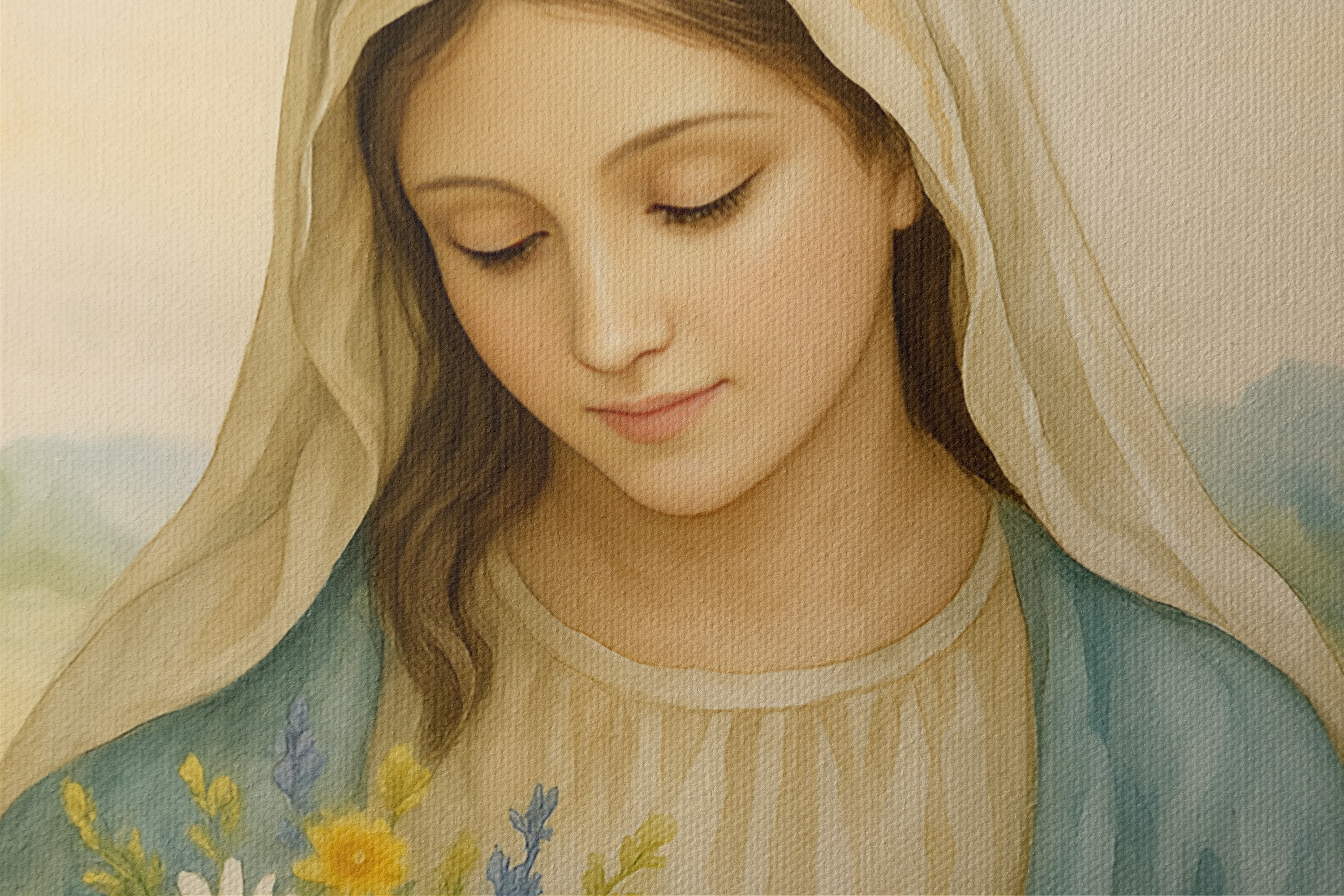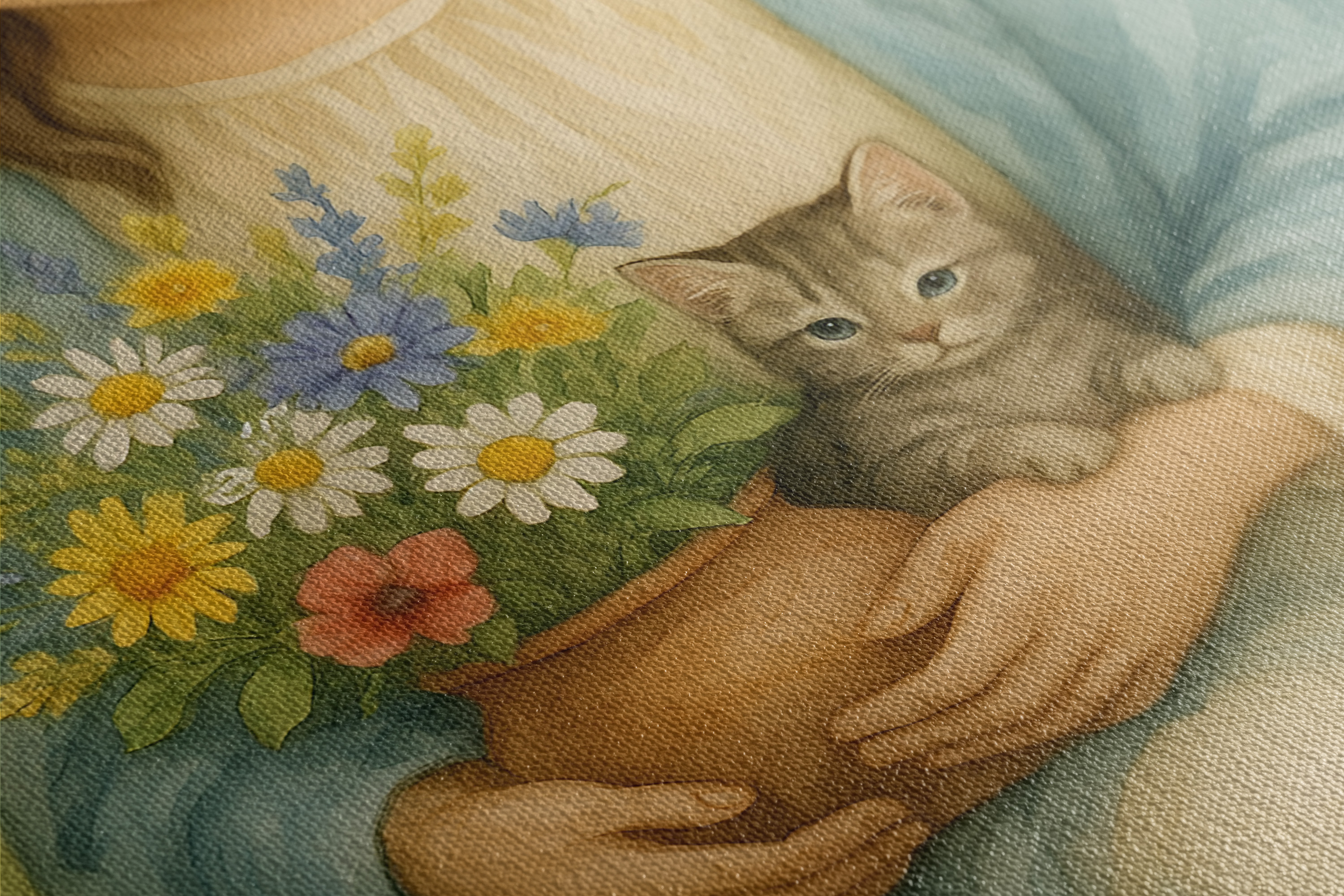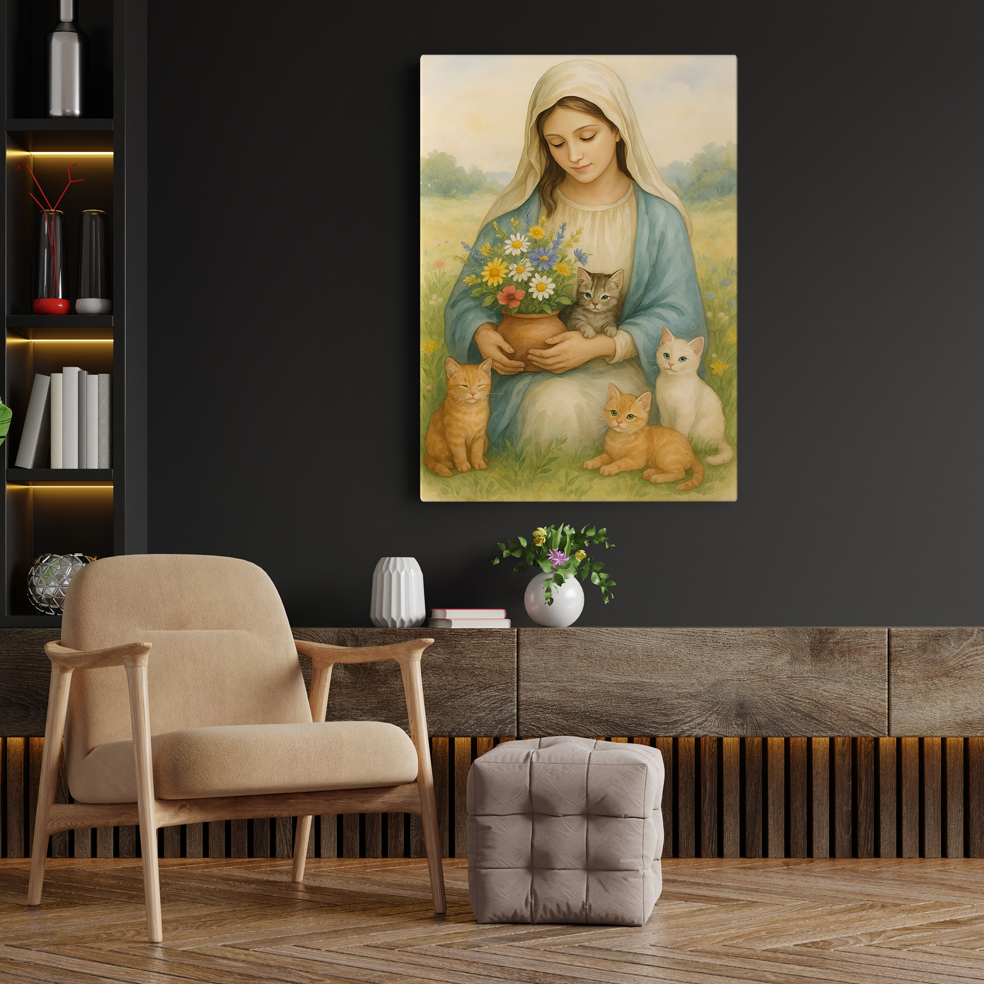 Zamów obraz „Maryja z kwiatami i kotkami" i pozwól, by radość, pokój i miłość Matki Bożej rozświetlały Twoje wnętrze.
