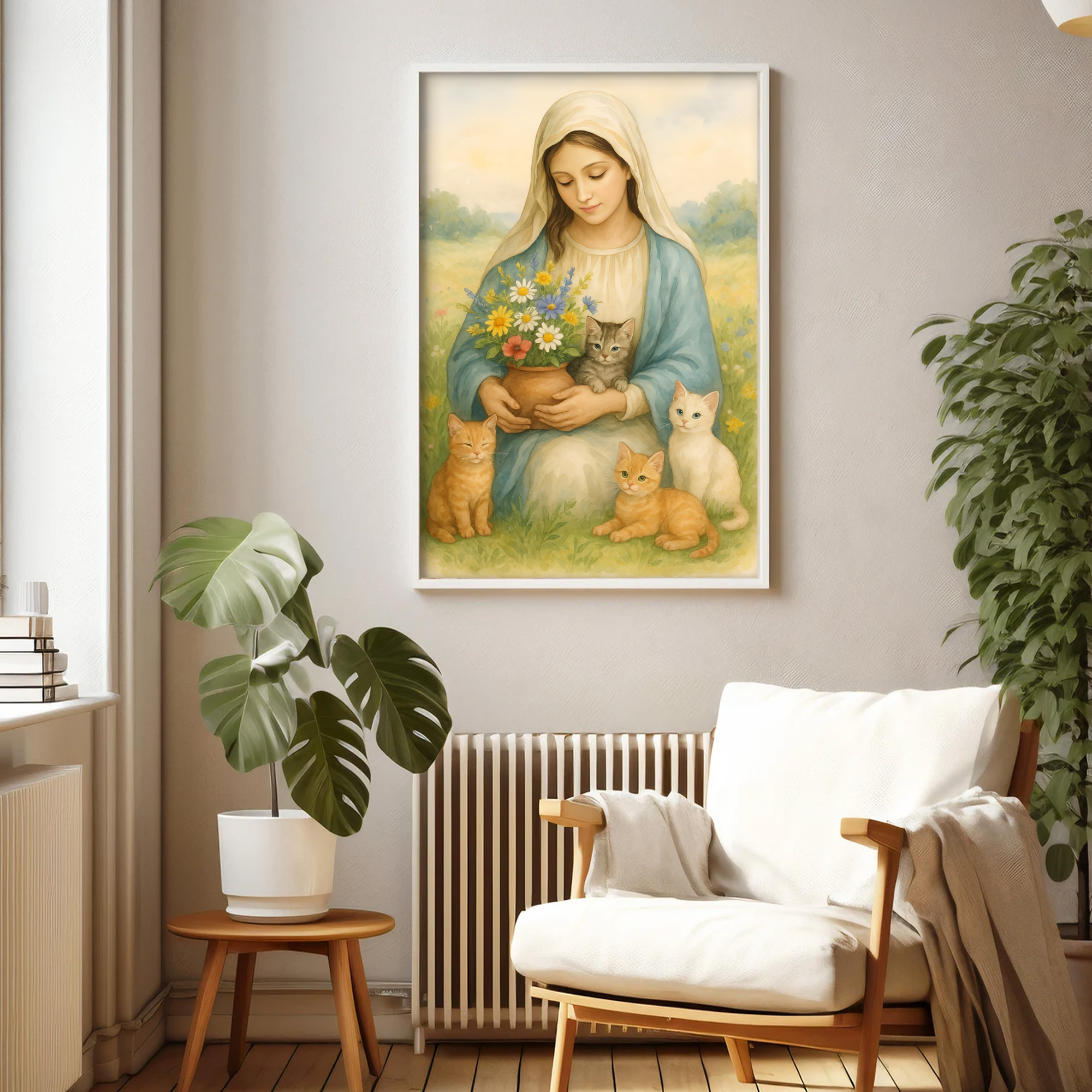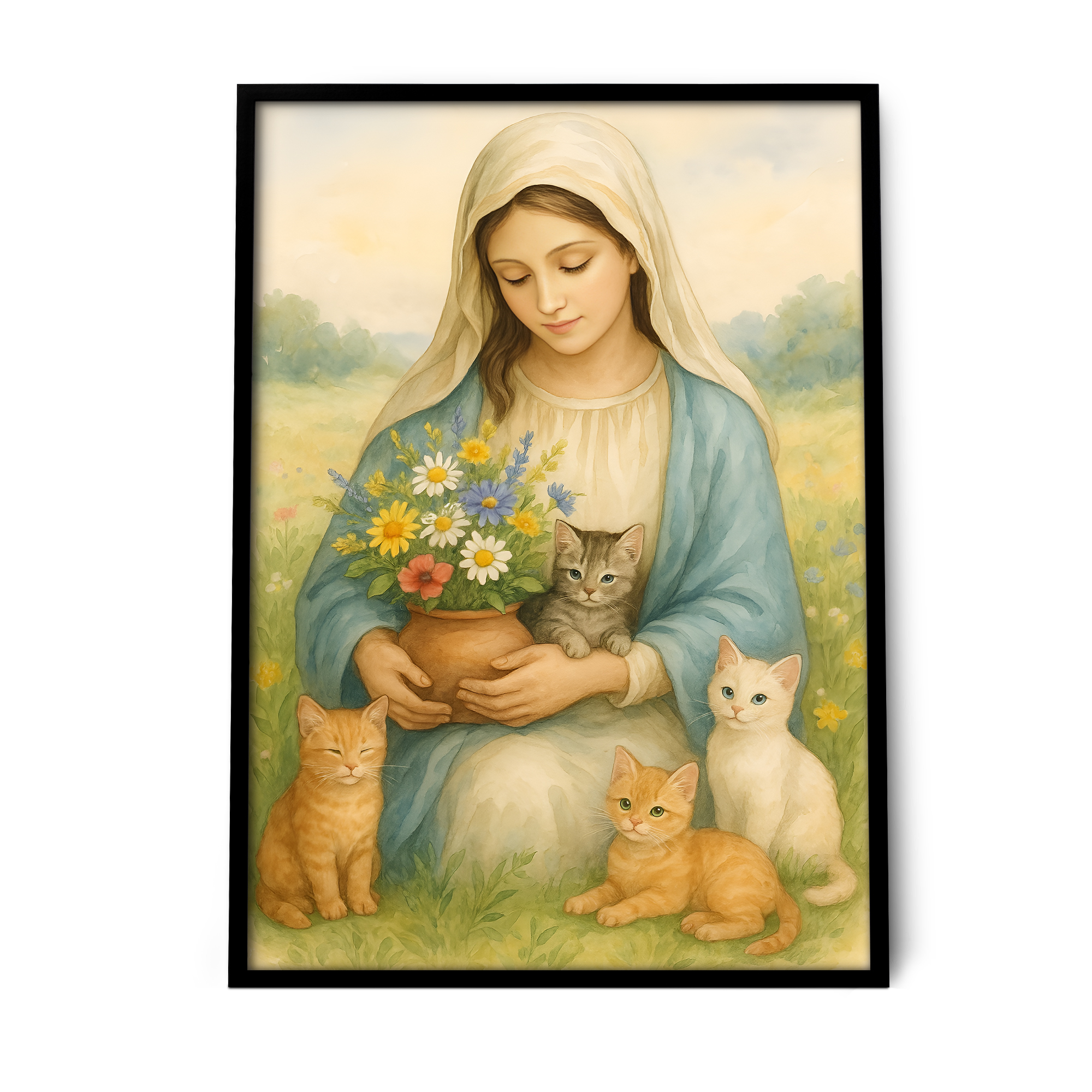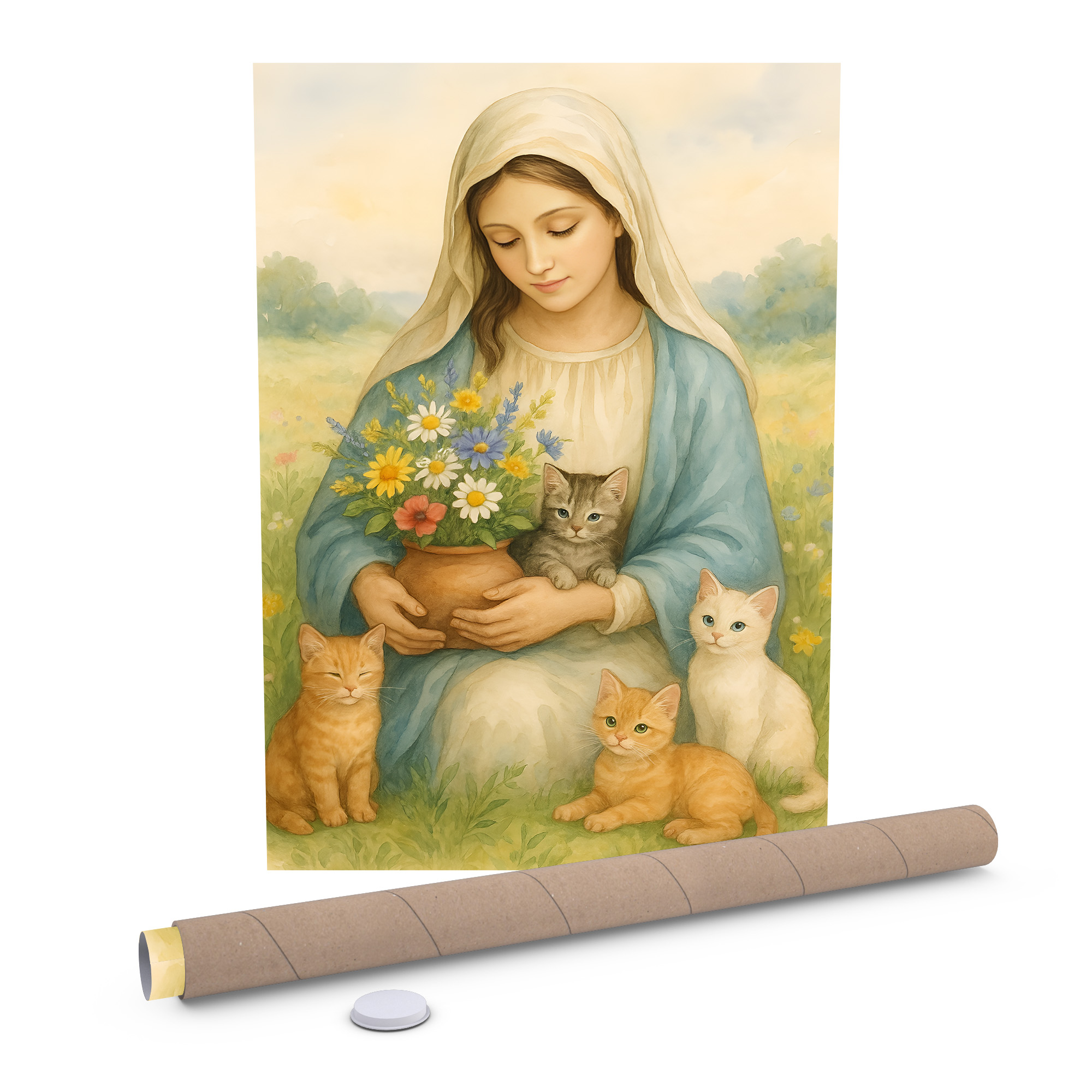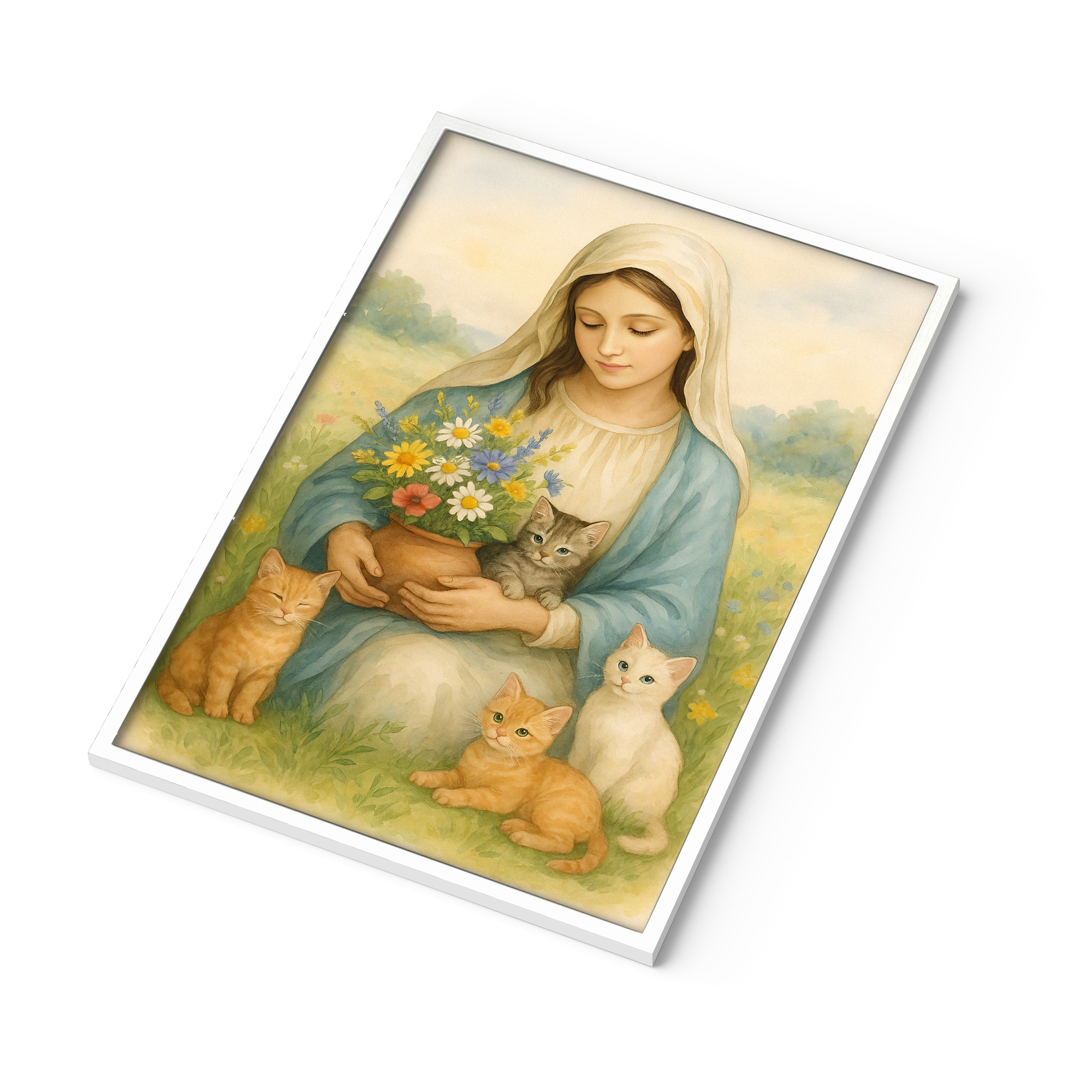 Plakat religijny – „Maryja z kwiatami i kotkami". Wydruk premium na papierze satynowym, matowe wykończenie i trwałe kolory. Idealny do domu i na prezent.