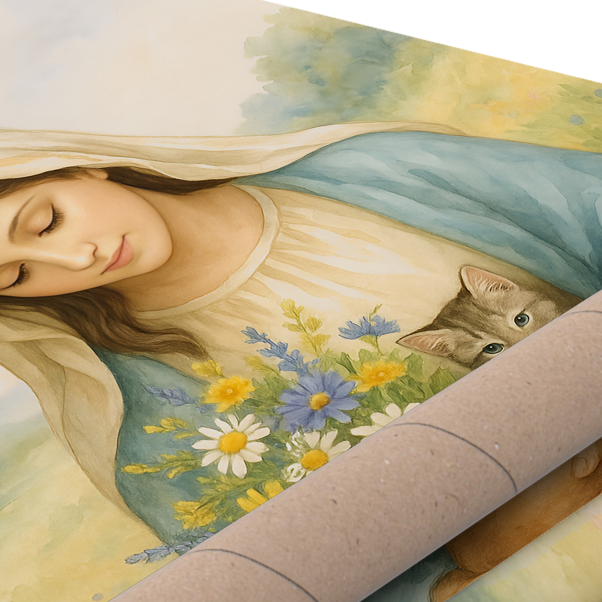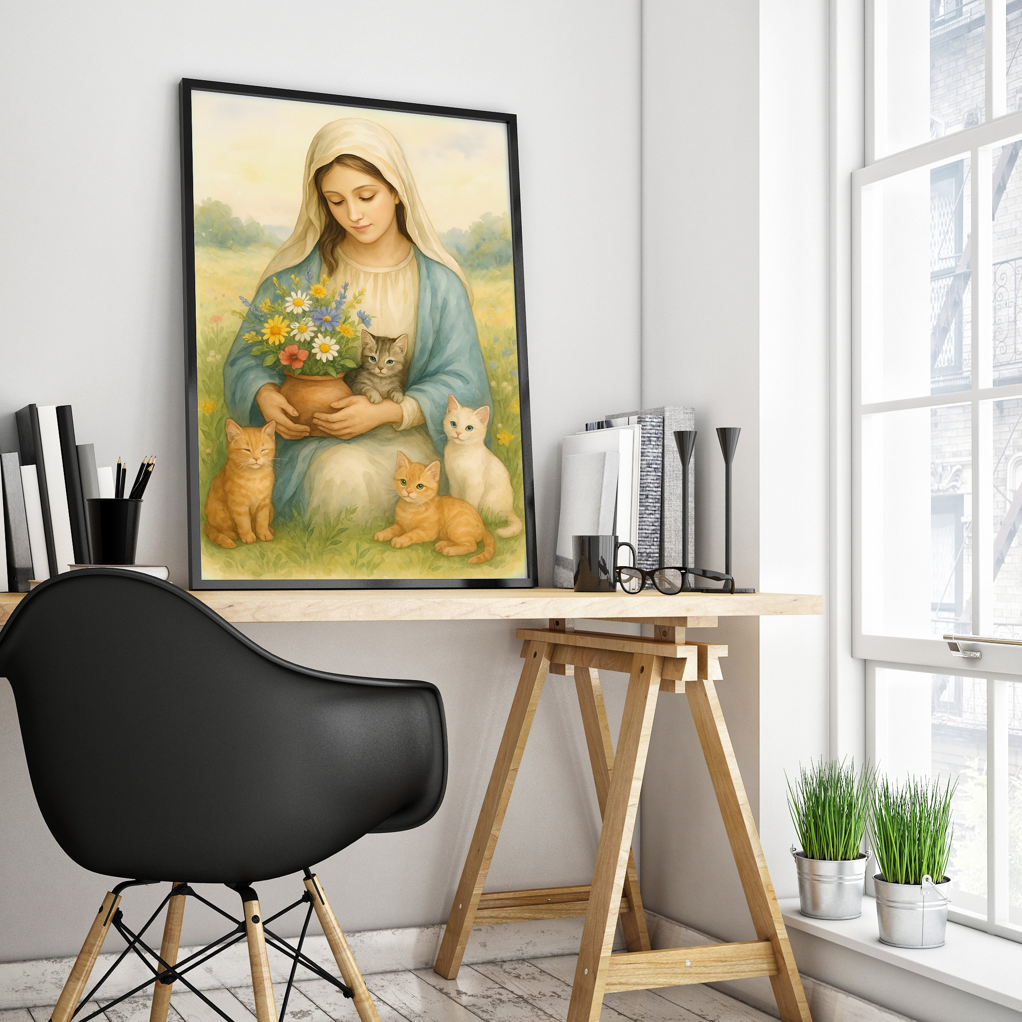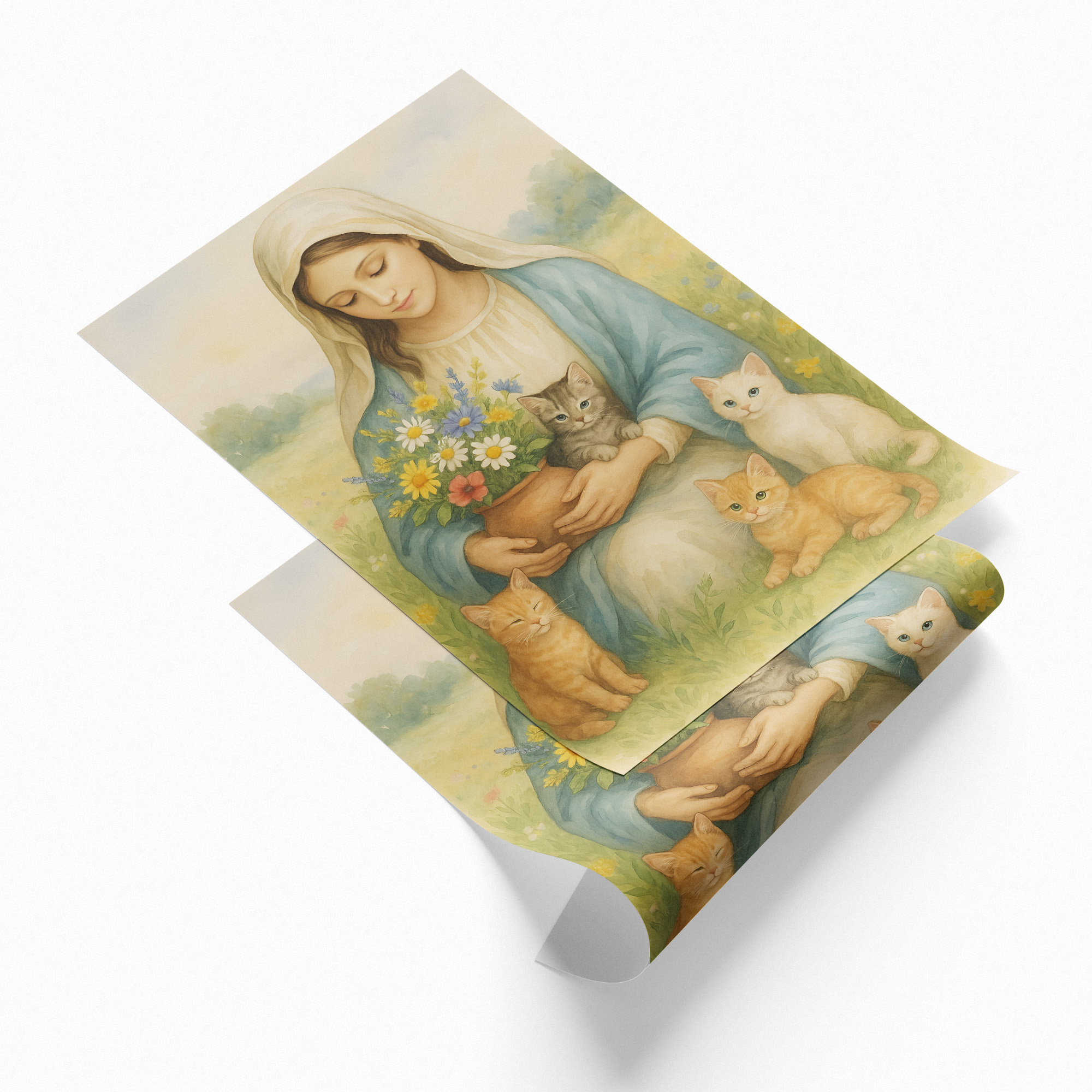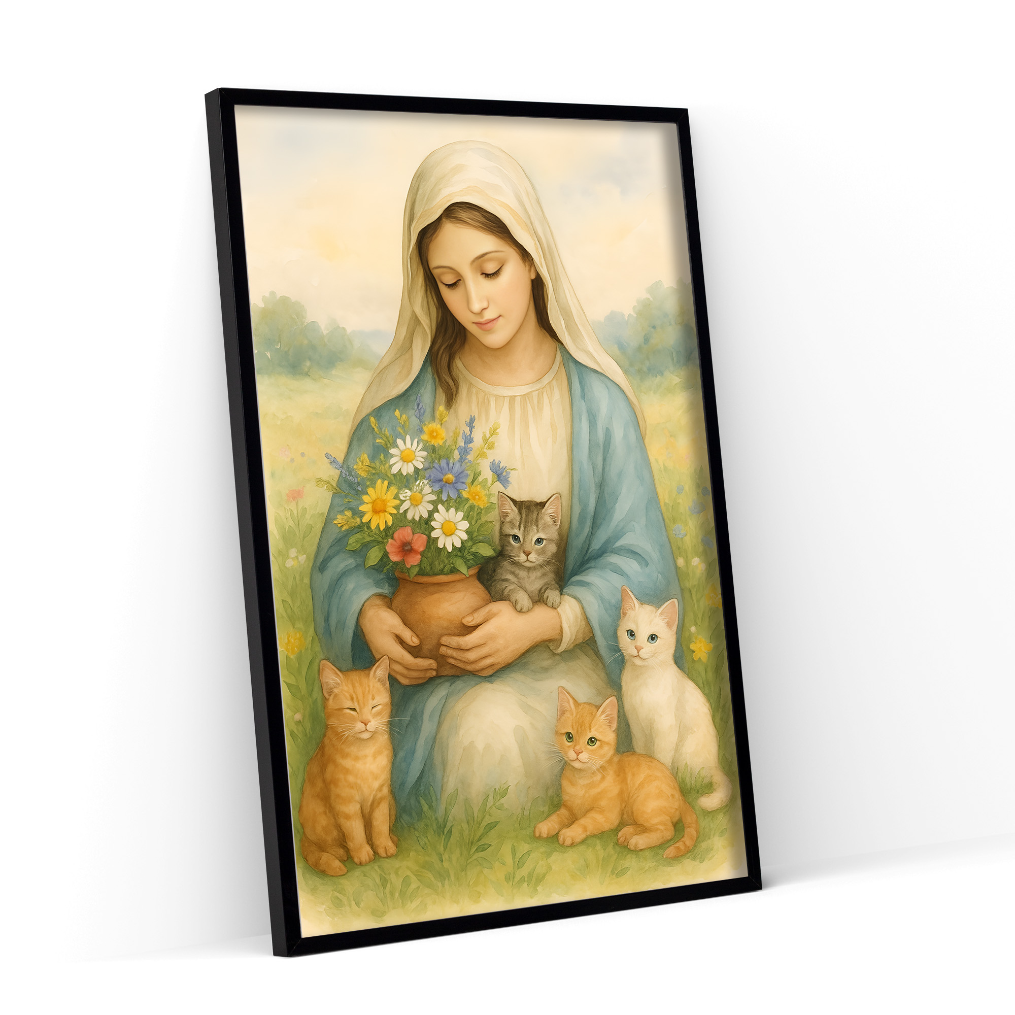 Plakat religijny – „Maryja z kwiatami i kotkami". Wydruk premium na papierze satynowym, matowe wykończenie i trwałe kolory. Idealny do domu i na prezent.