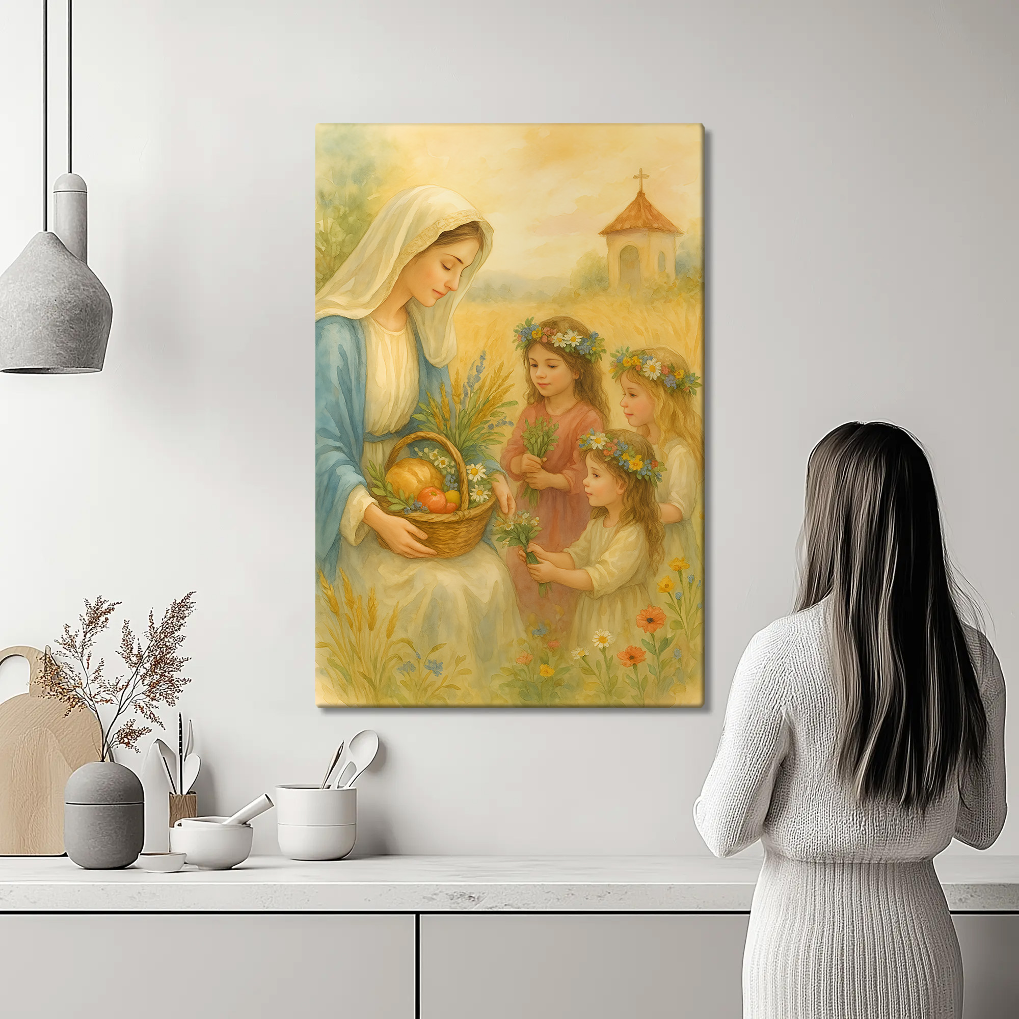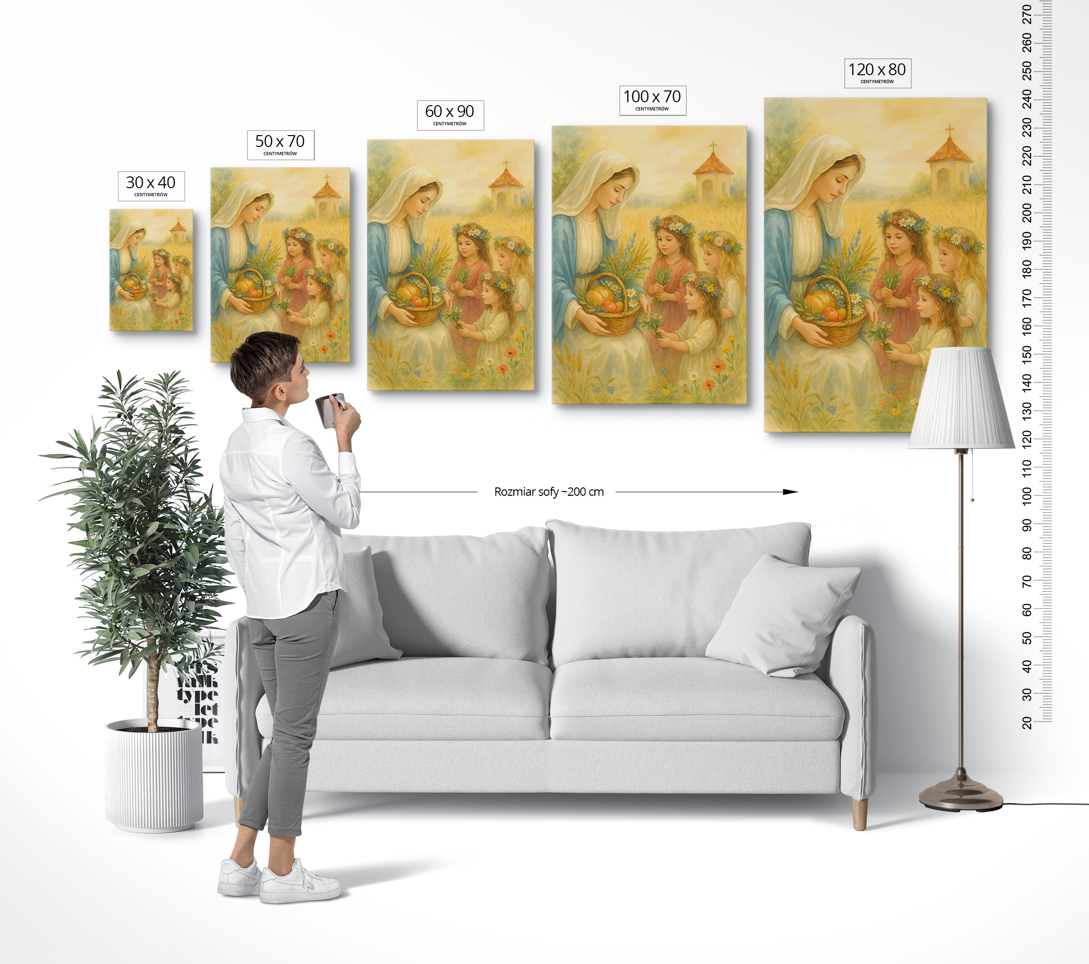 Obraz religijny na płótnie – Matka Boska Zielna z koszem ziół i owoców. Canvas premium, ręcznie naciągnięty na krosna, gotowy do zawieszenia. Piękna dekoracja i wyjątkowy prezent religijny.