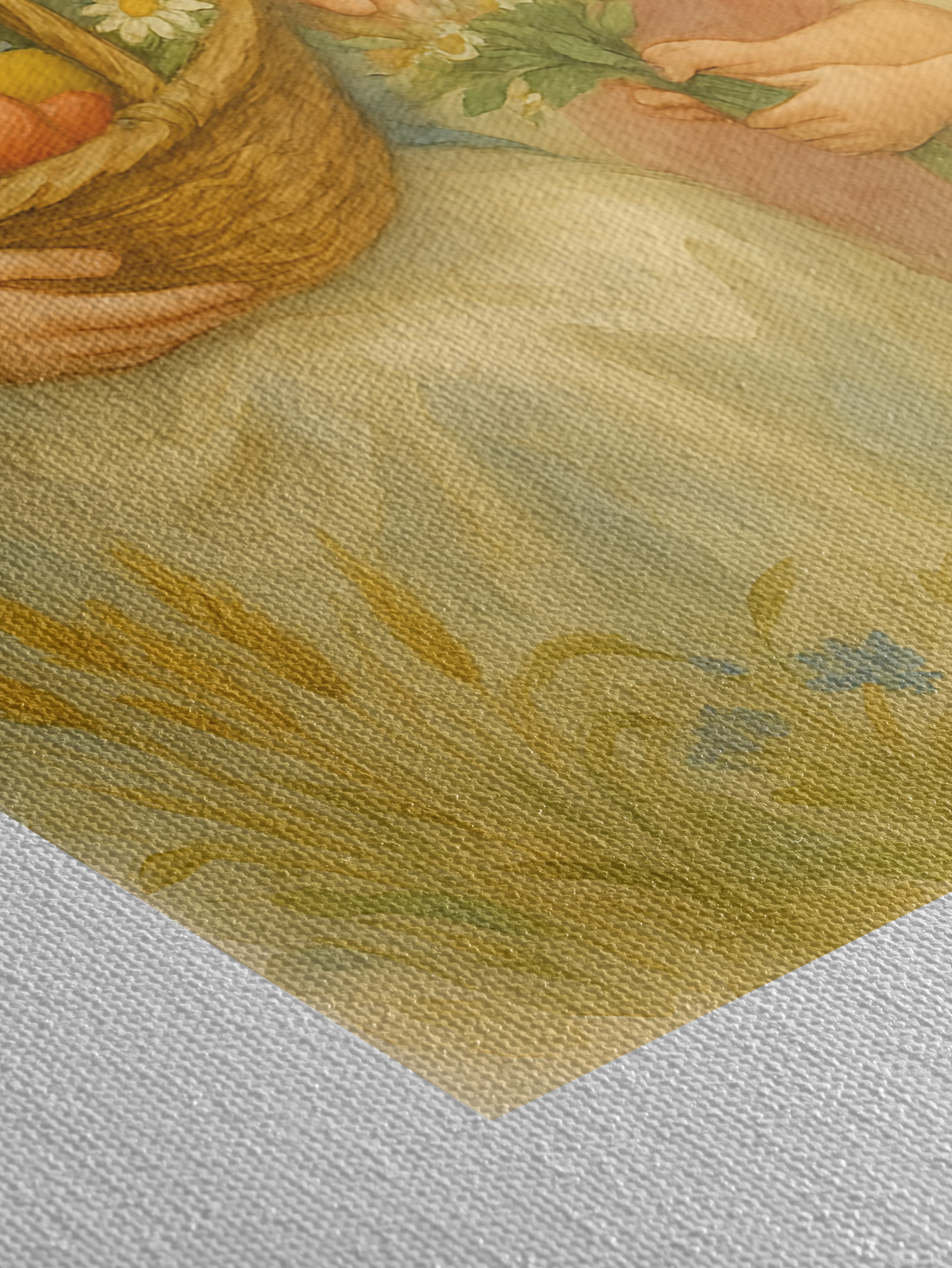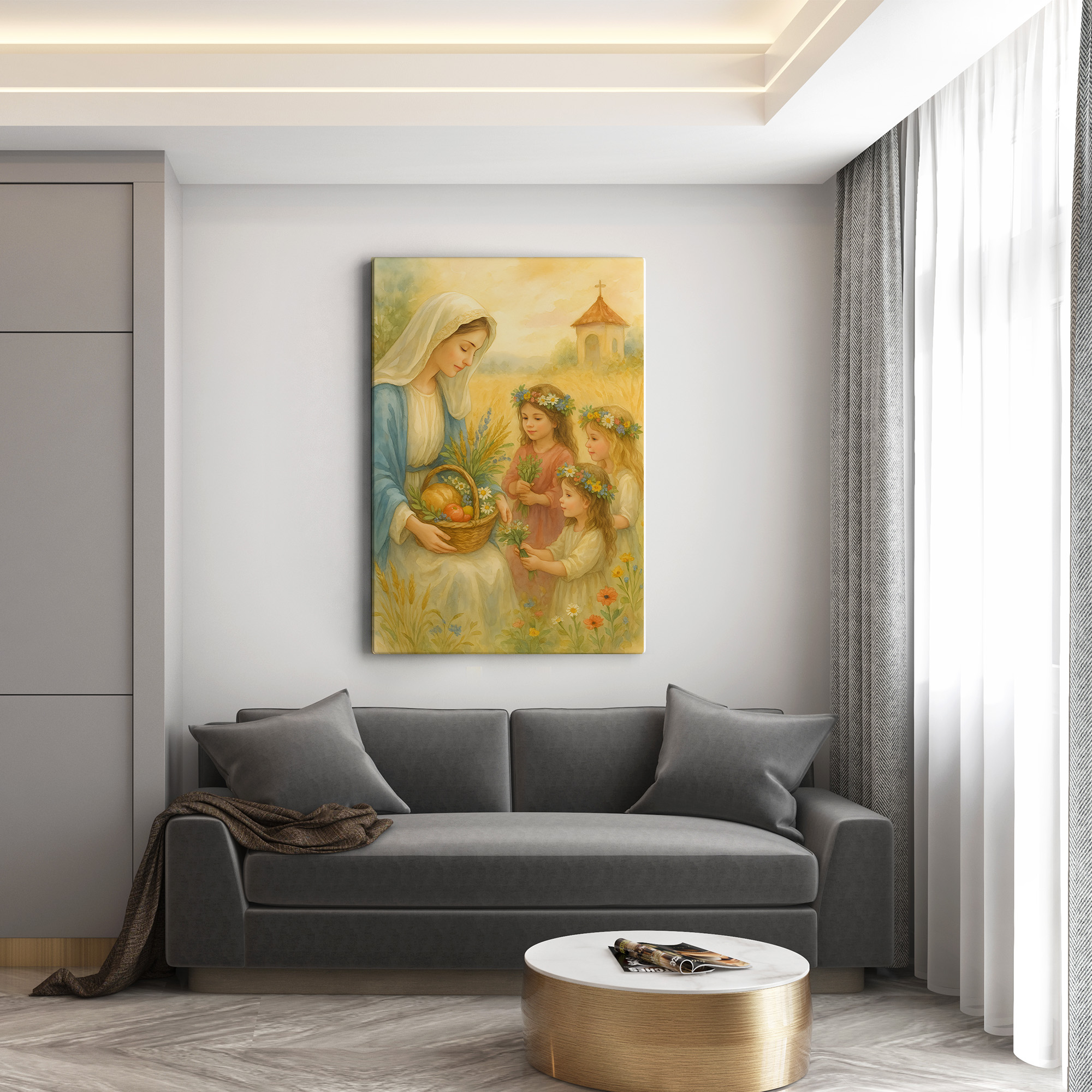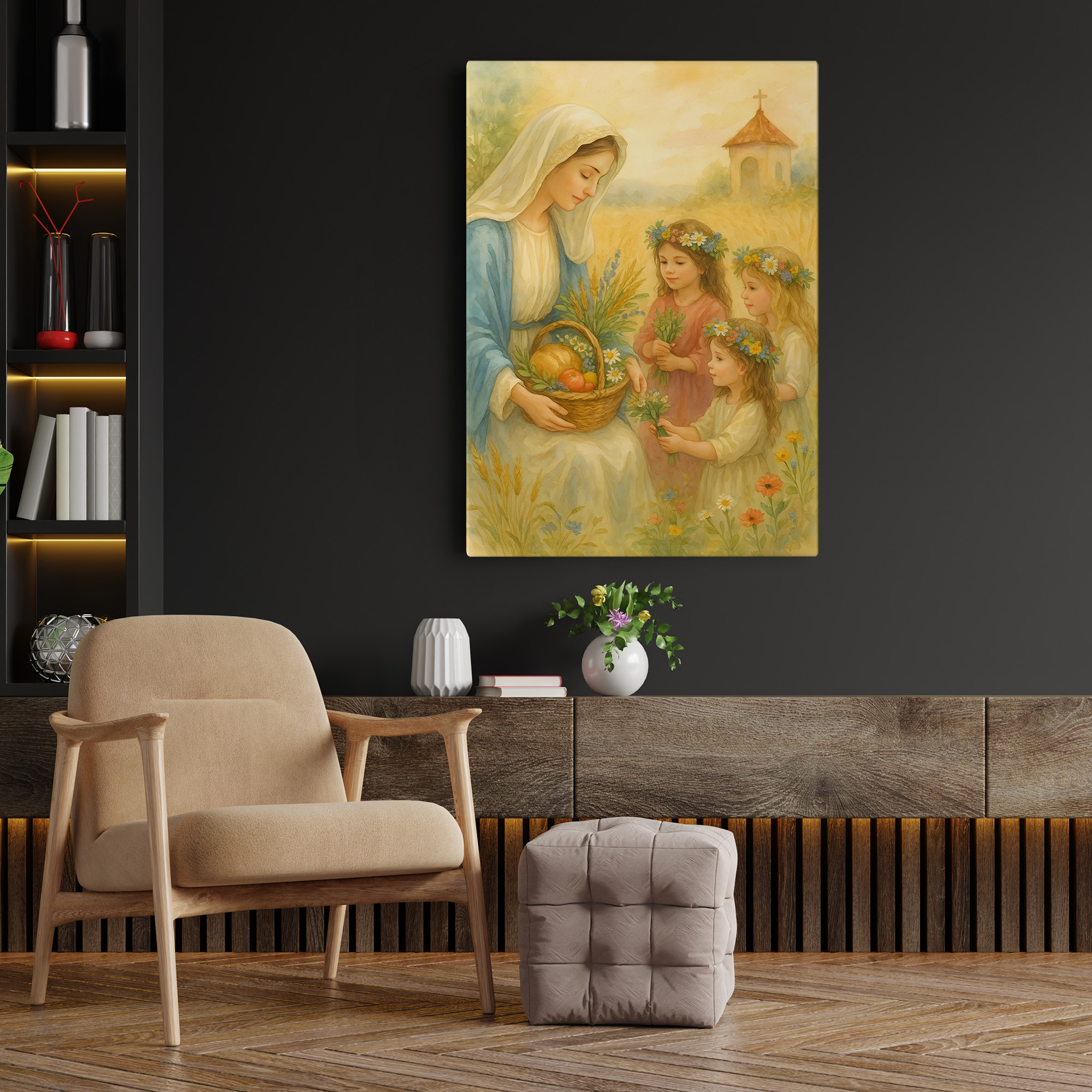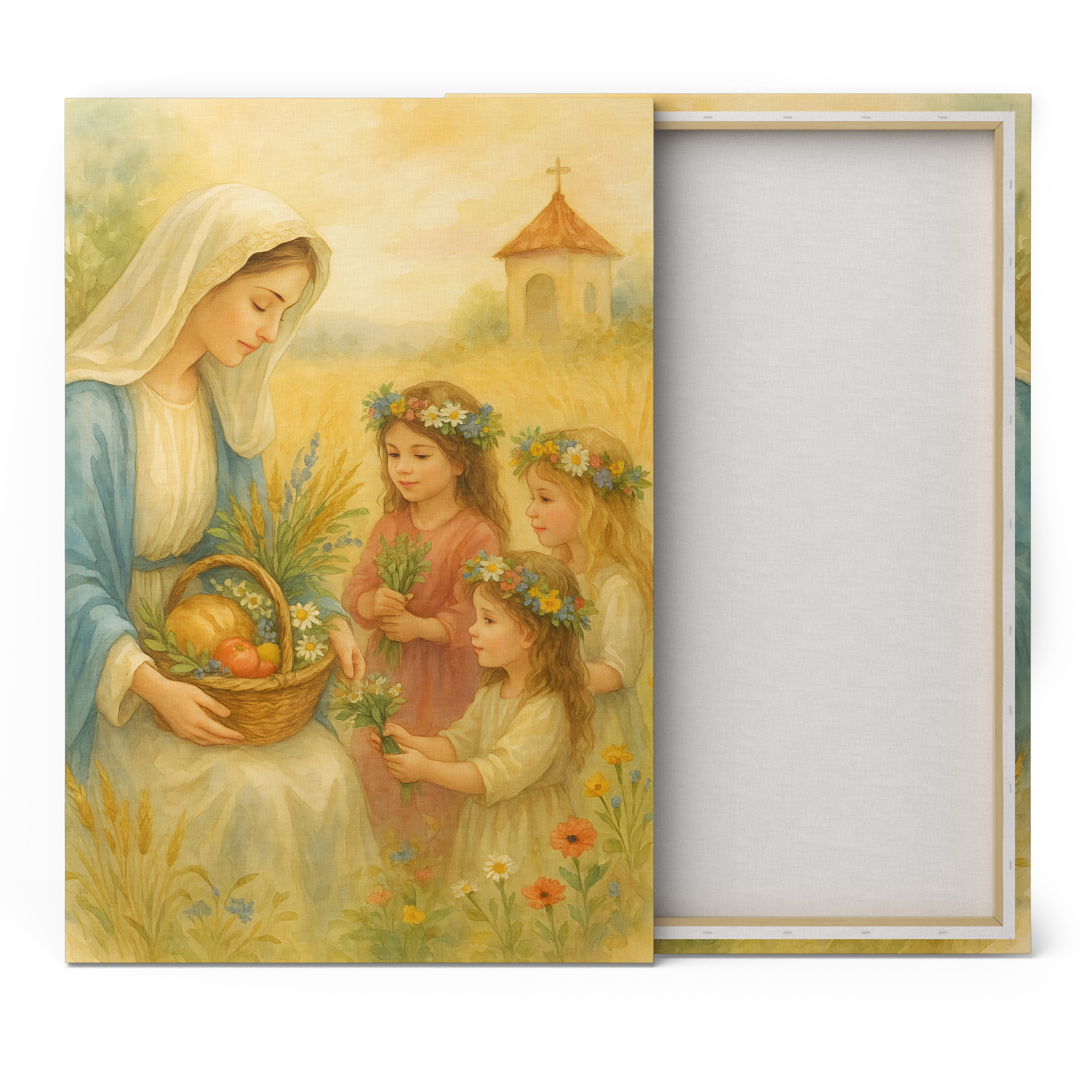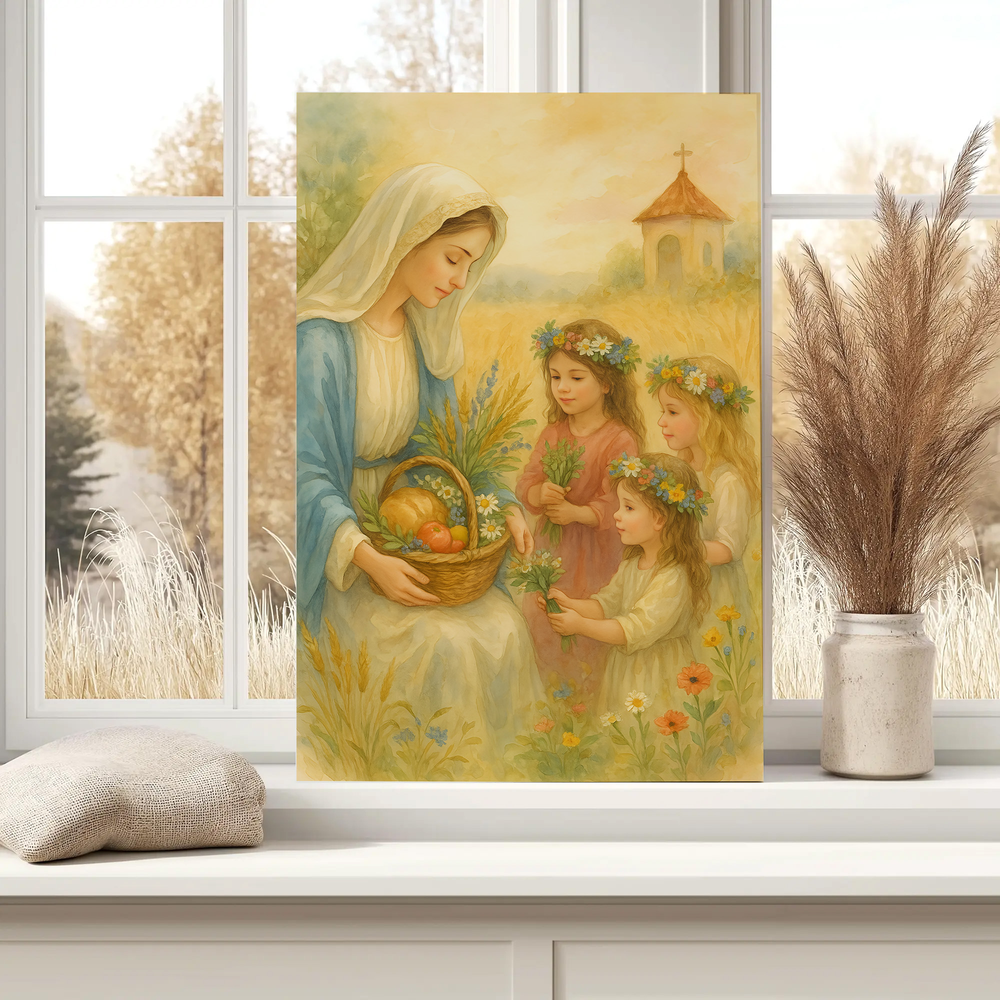 Subtelny i pełen ciepła obraz przedstawiający Matkę Boską Zielną w otoczeniu dzieci składających dary natury. Maryja z koszem pełnym chleba, owoców i ziół symbolizuje wdzięczność za plony i Boże błogosławieństwo dla ziemi. To wizerunek łączący duchowość z pięknem polskiej tradycji ludowej.