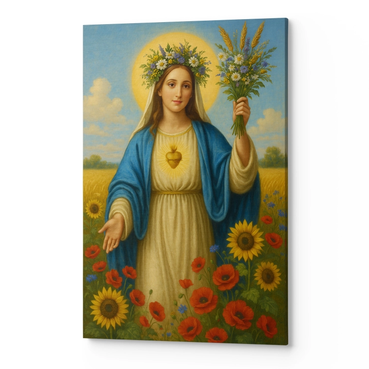 Obraz religijny na płótnie – Maryja z bukietem kwiatów. Canvas premium, ręcznie naciągnięty na krosna, gotowy do zawieszenia. Piękna dekoracja i wyjątkowy prezent religijny.