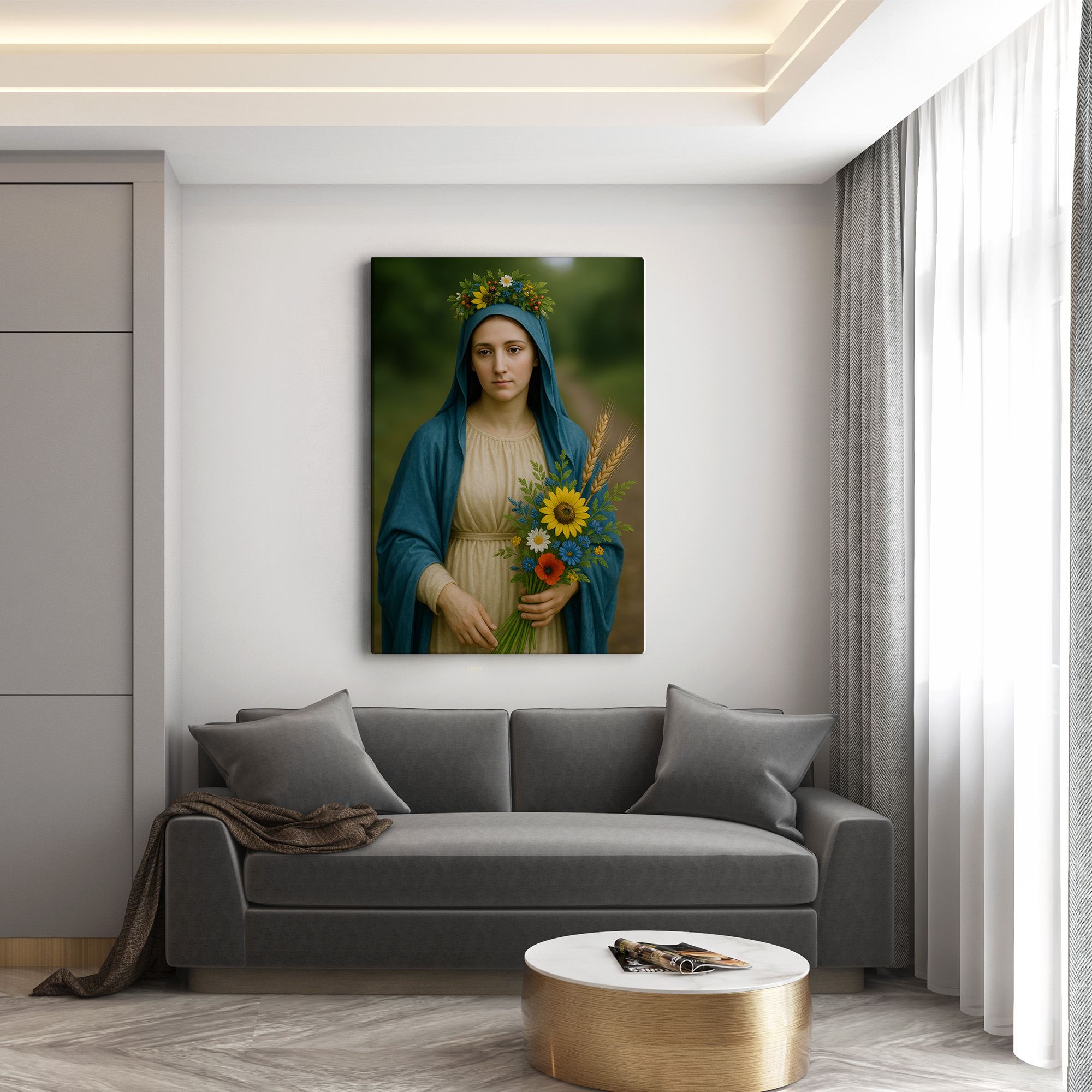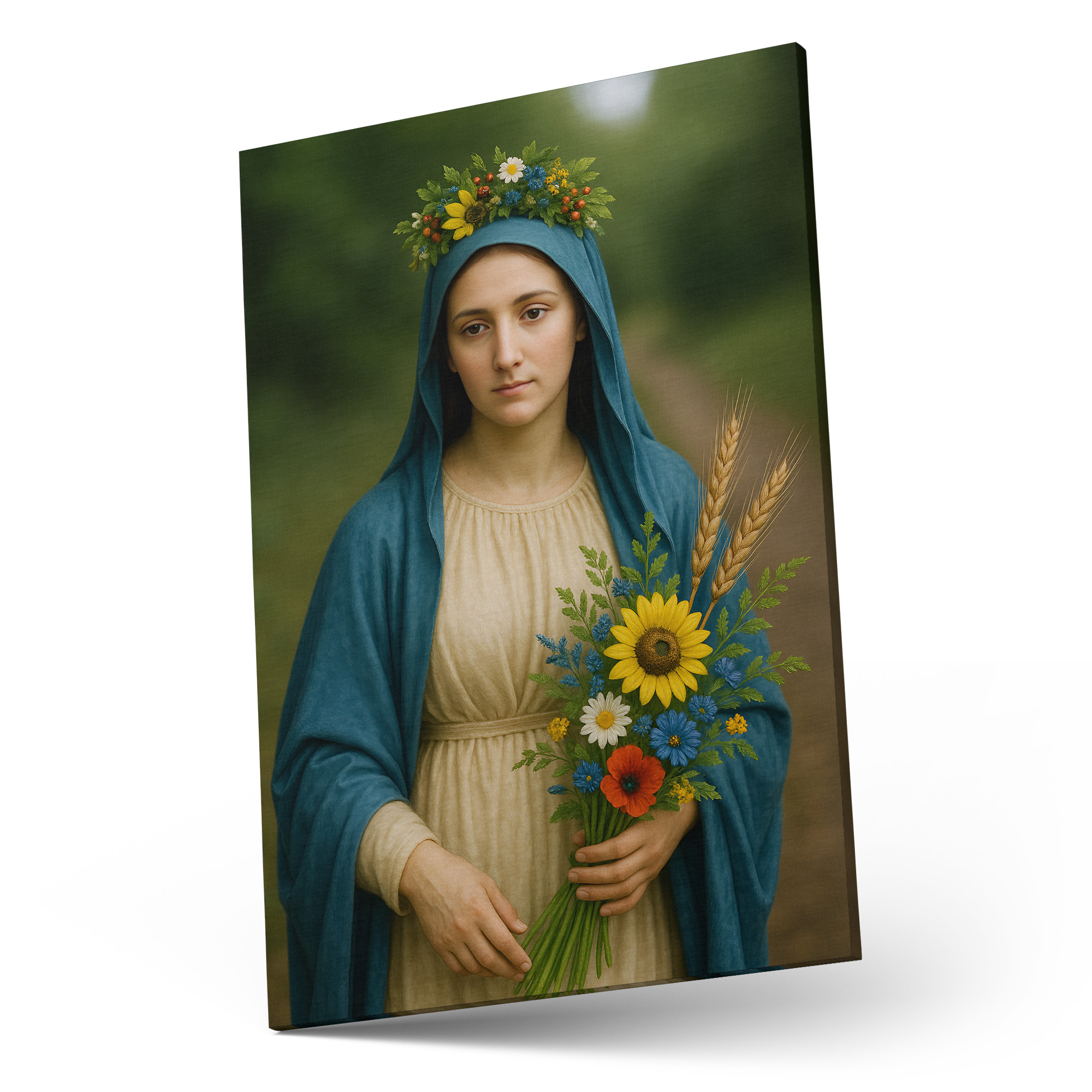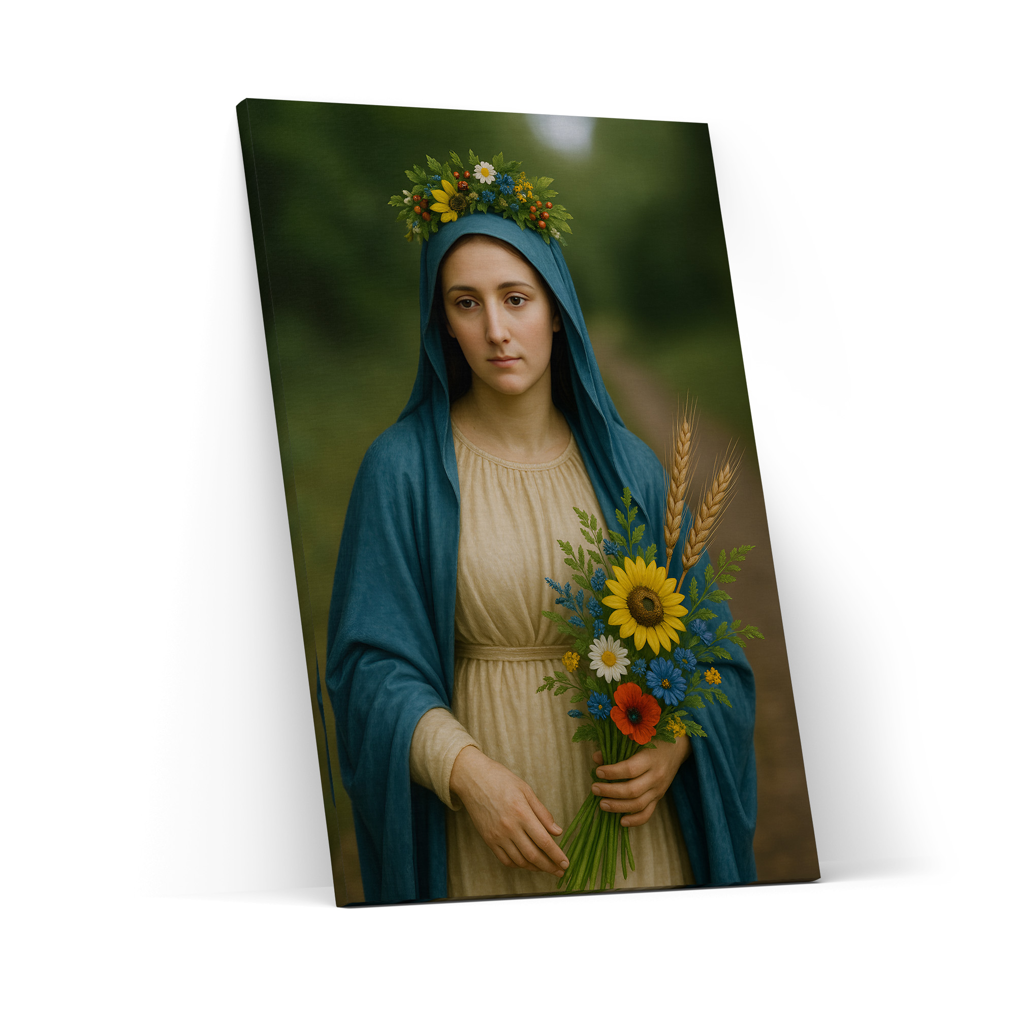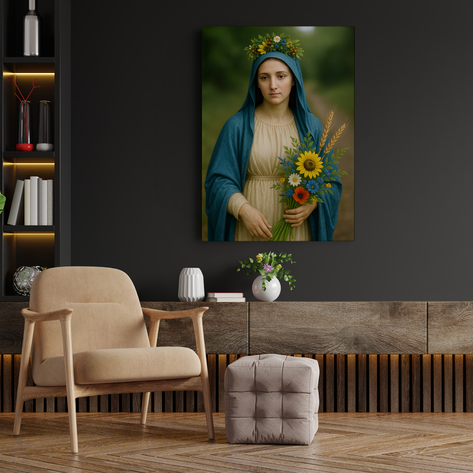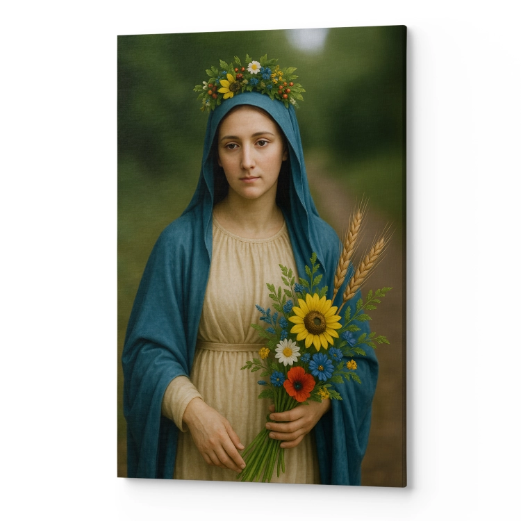 Zamów obraz „Maryja z bukietem zbóż i kwiatów" i wprowadź do swojego domu piękno prostoty oraz błogosławieństwo Matki Bożej.