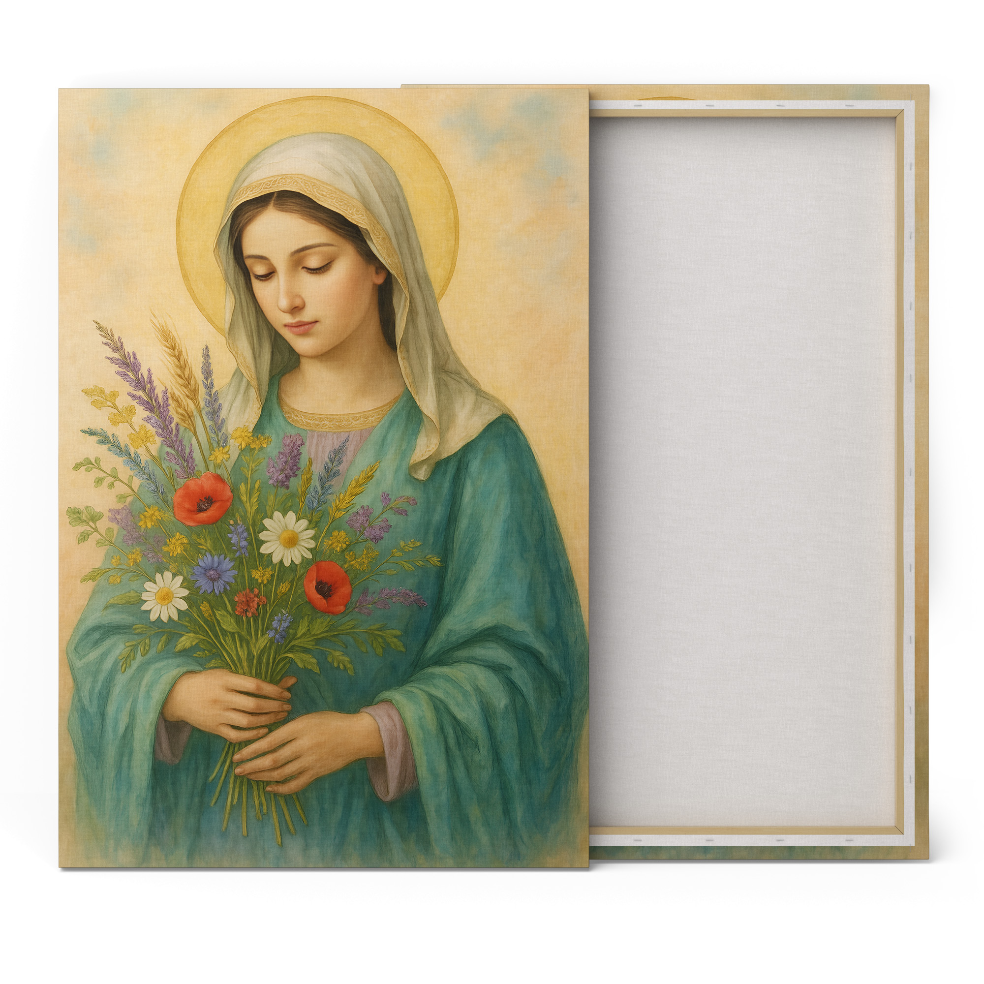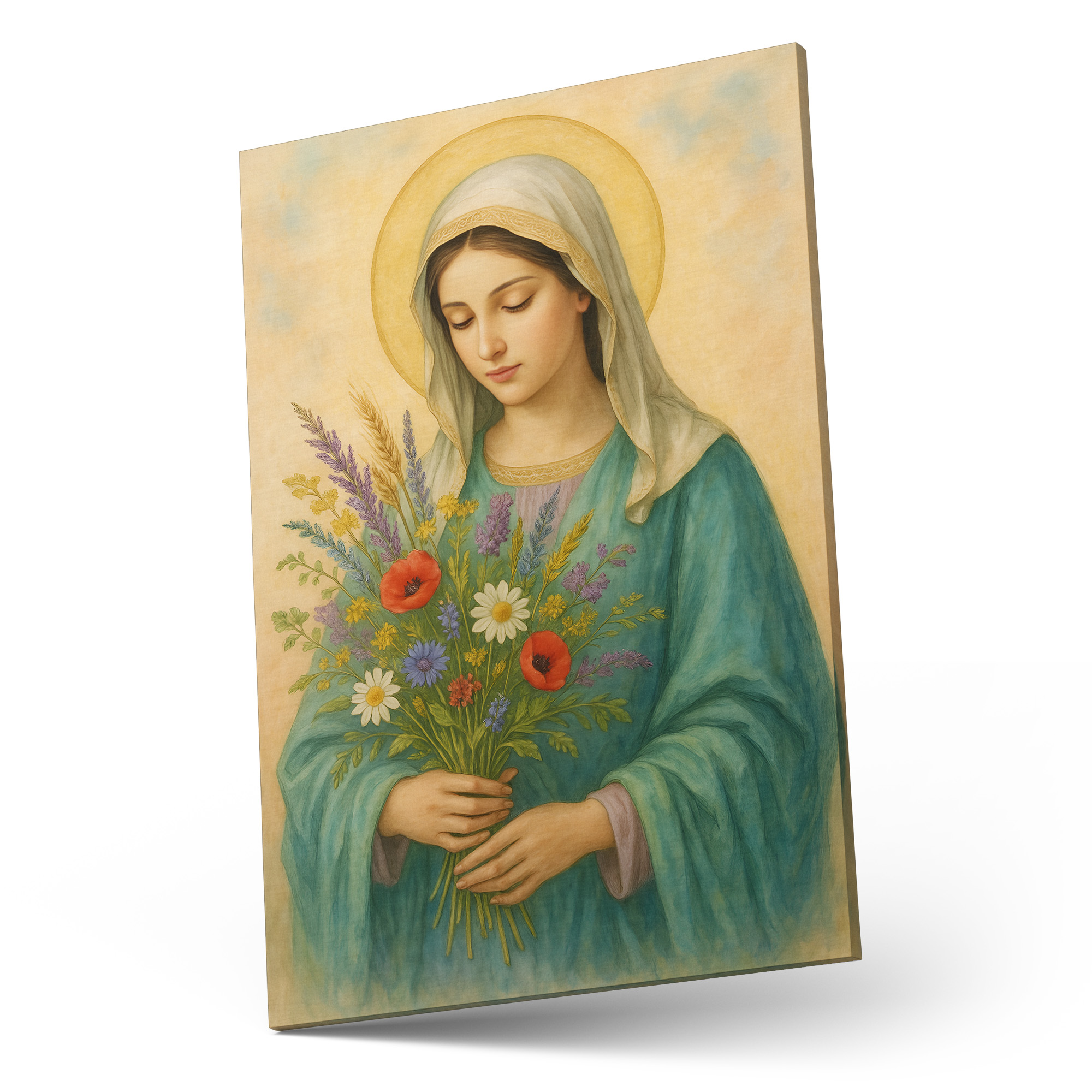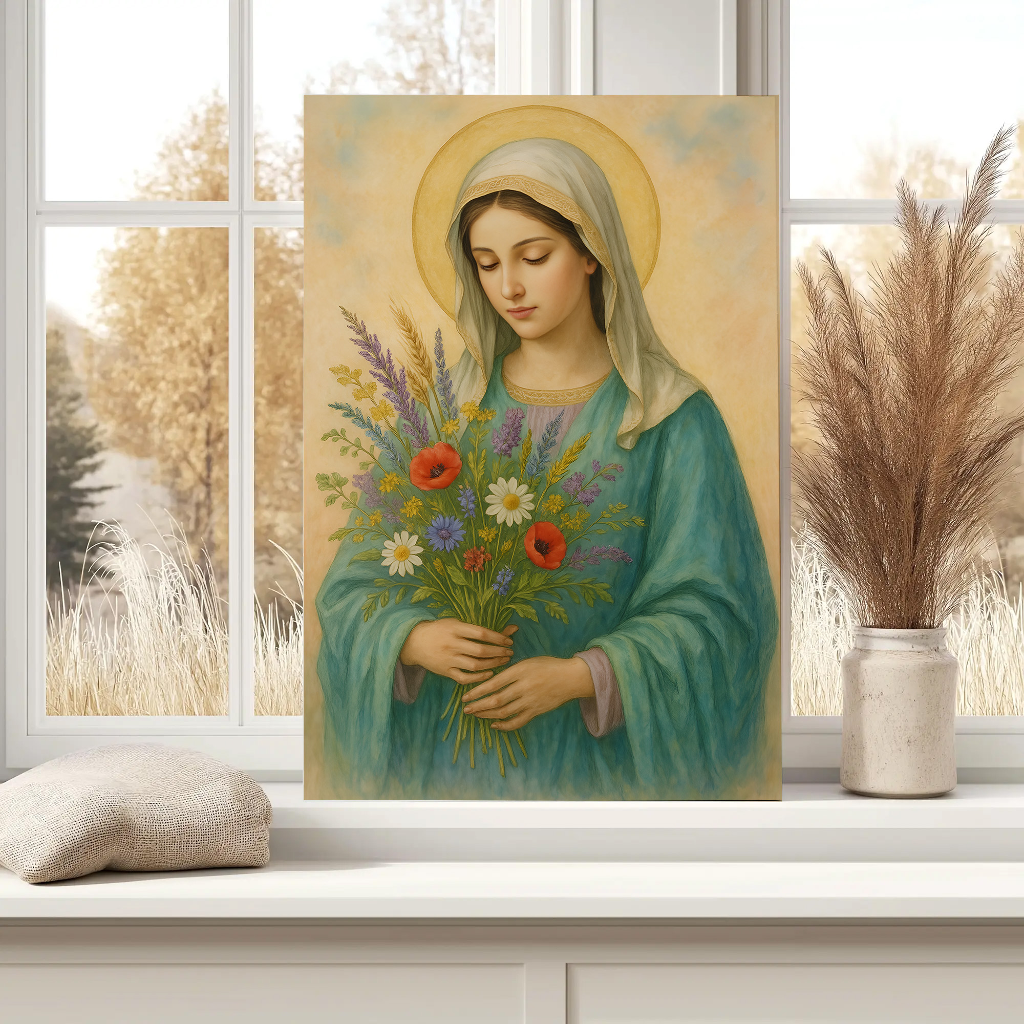 Zamów obraz „Maryja z bukietem polnych kwiatów" i zaproś Jej łagodność oraz błogosławieństwo do swojego domu.
