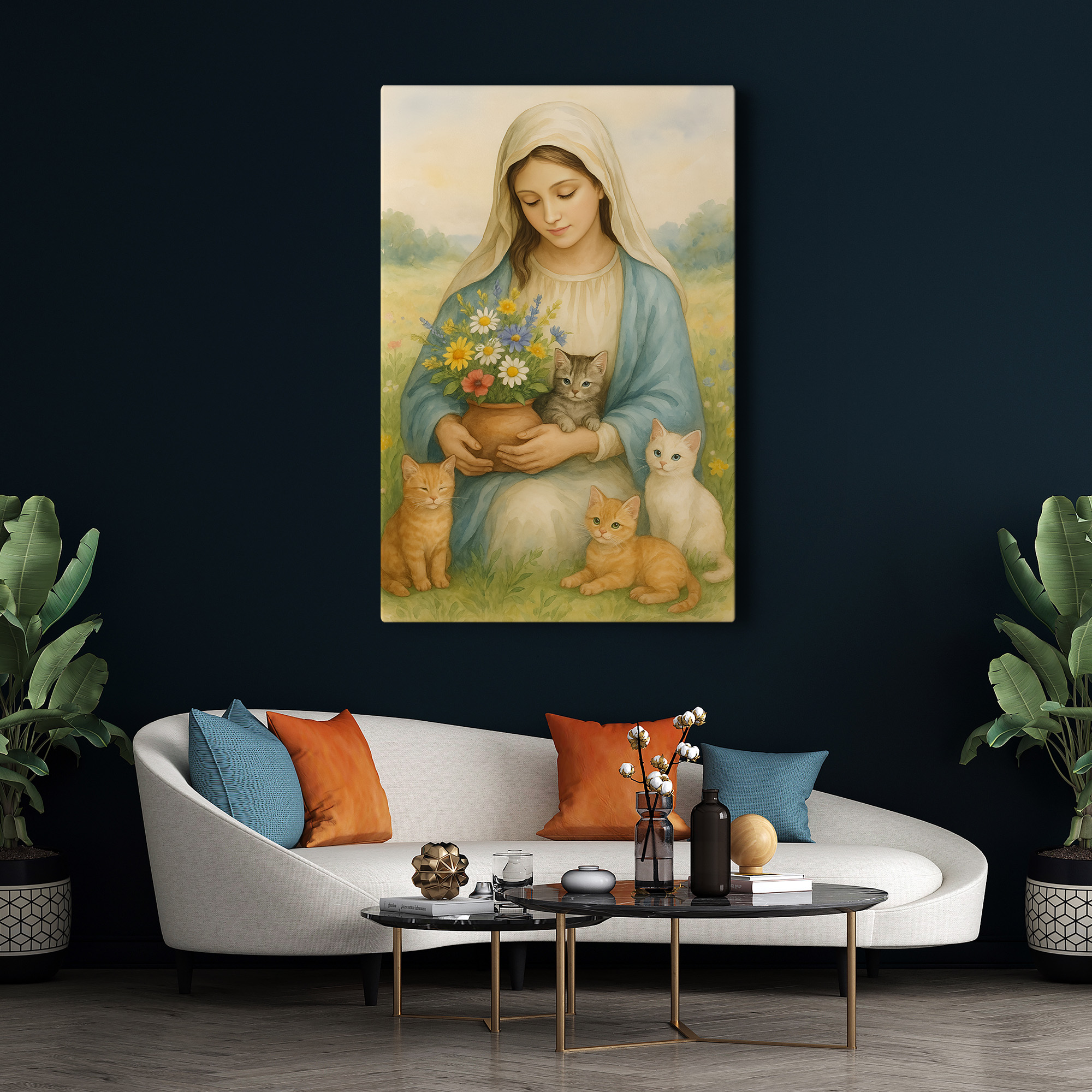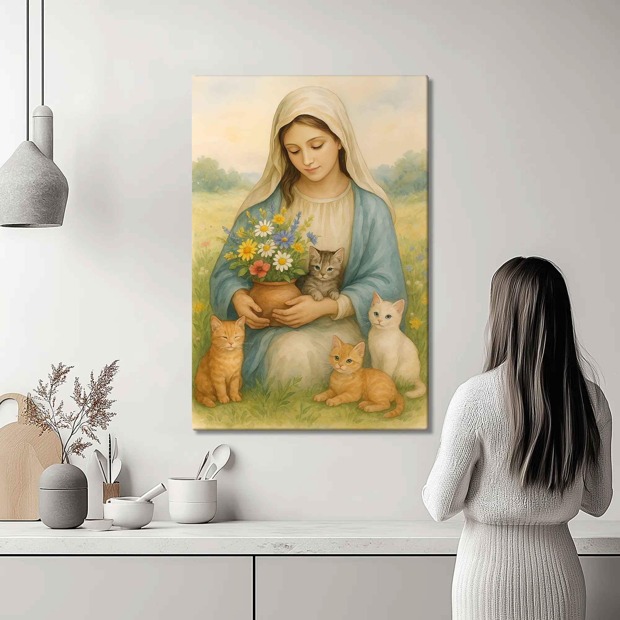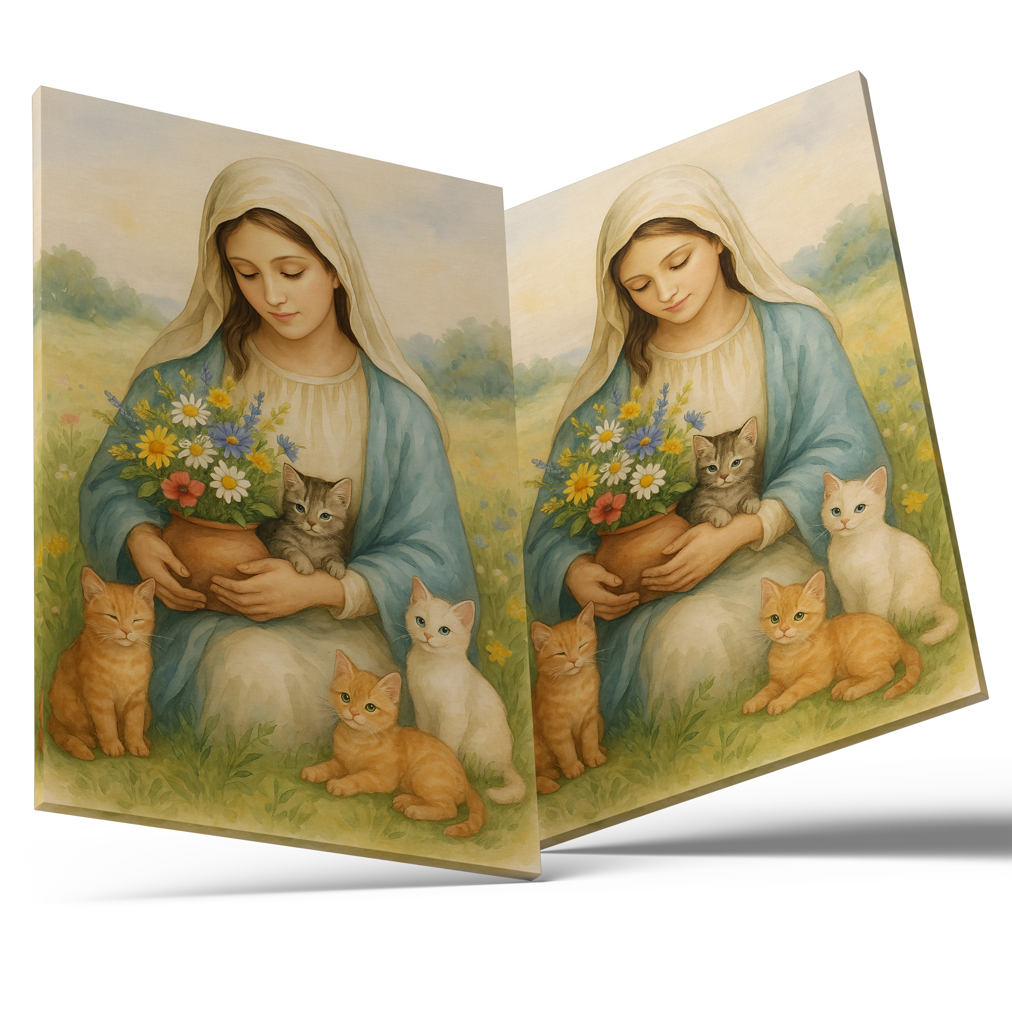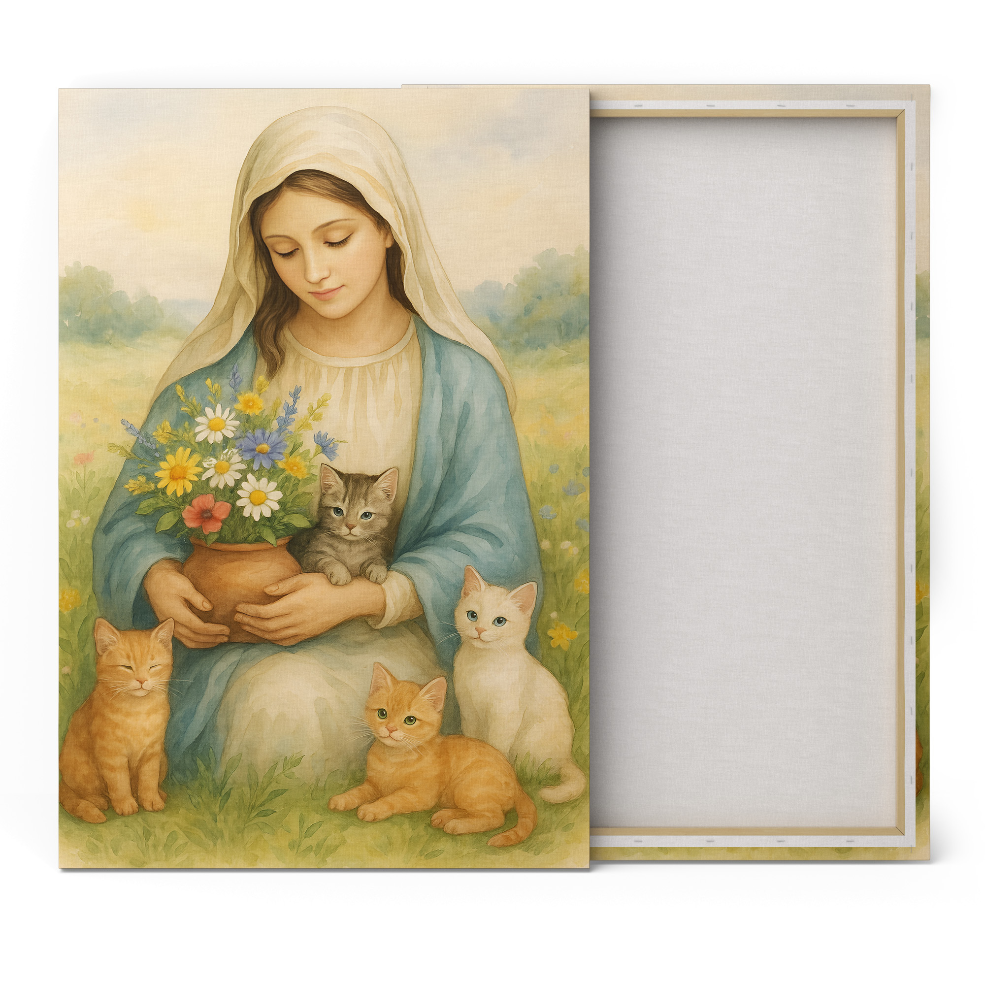 Zamów obraz „Maryja z kwiatami i kotkami" i pozwól, by radość, pokój i miłość Matki Bożej rozświetlały Twoje wnętrze.