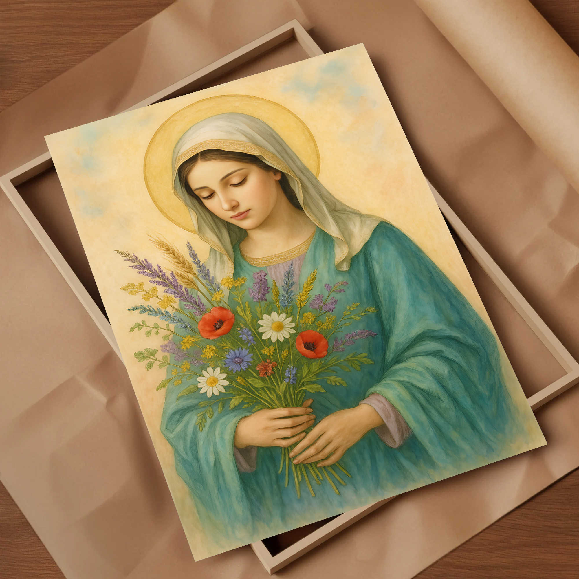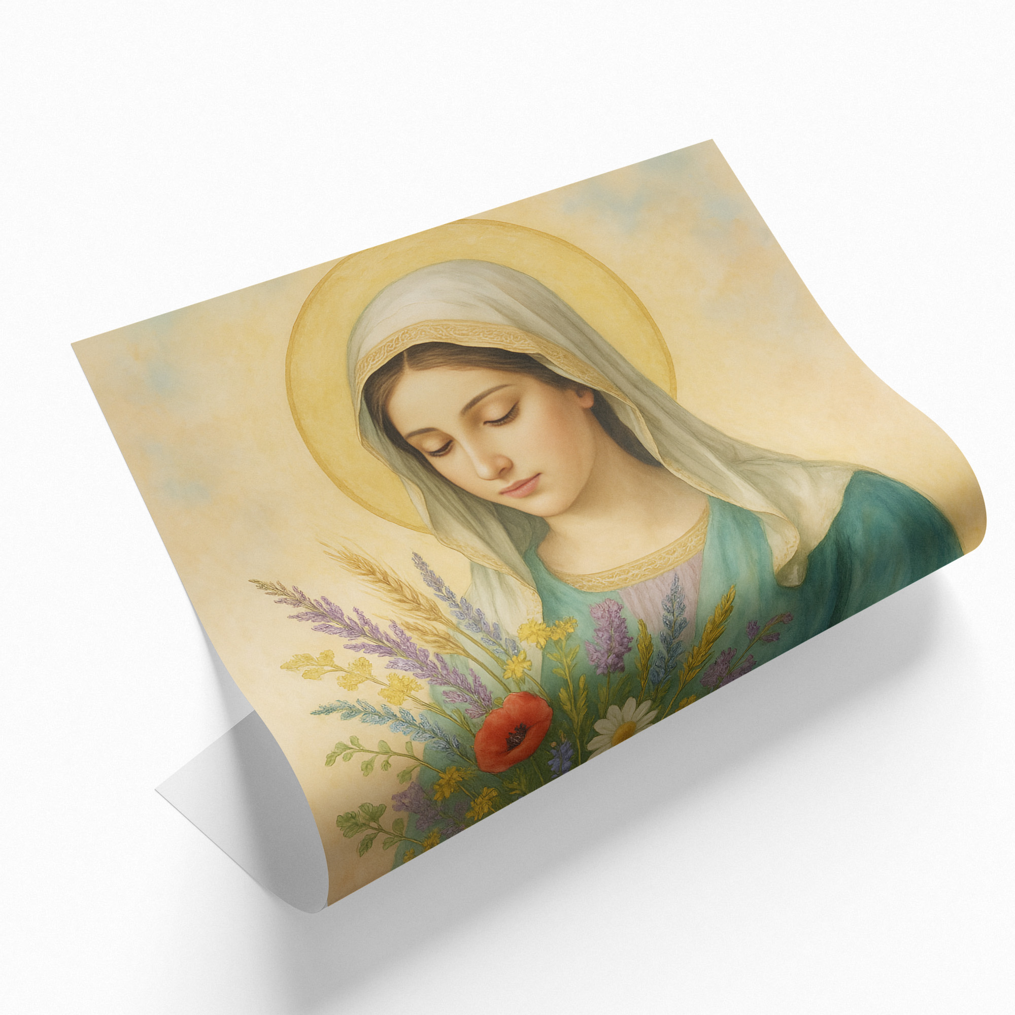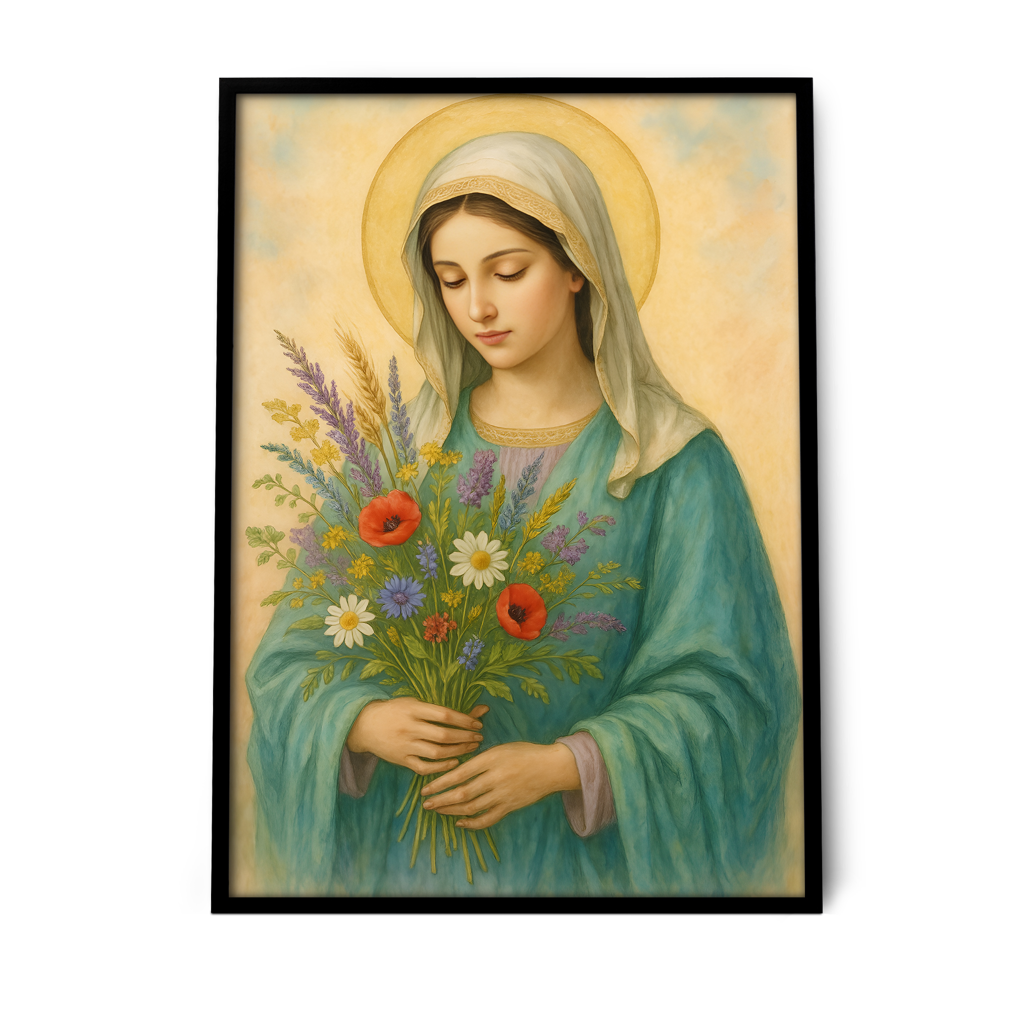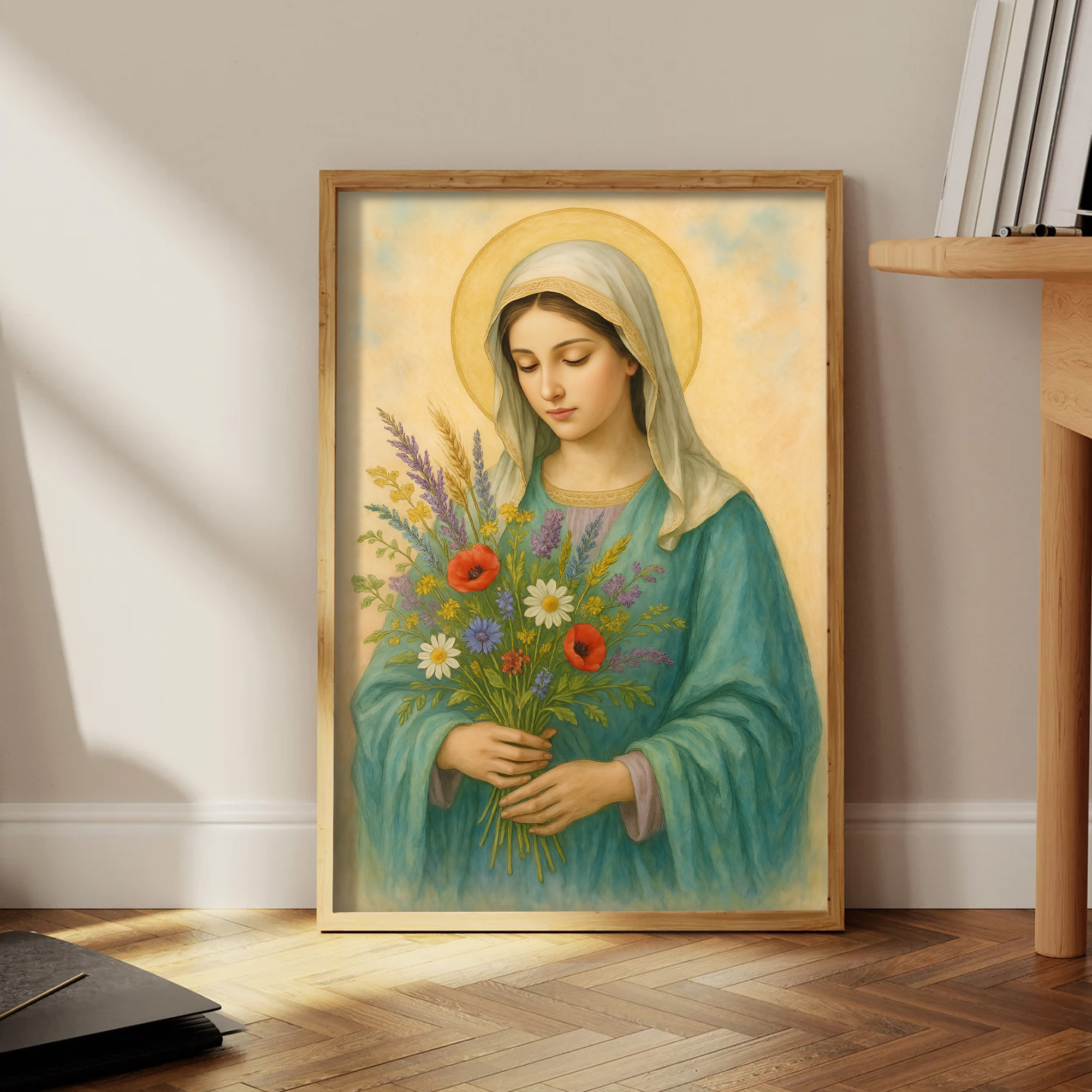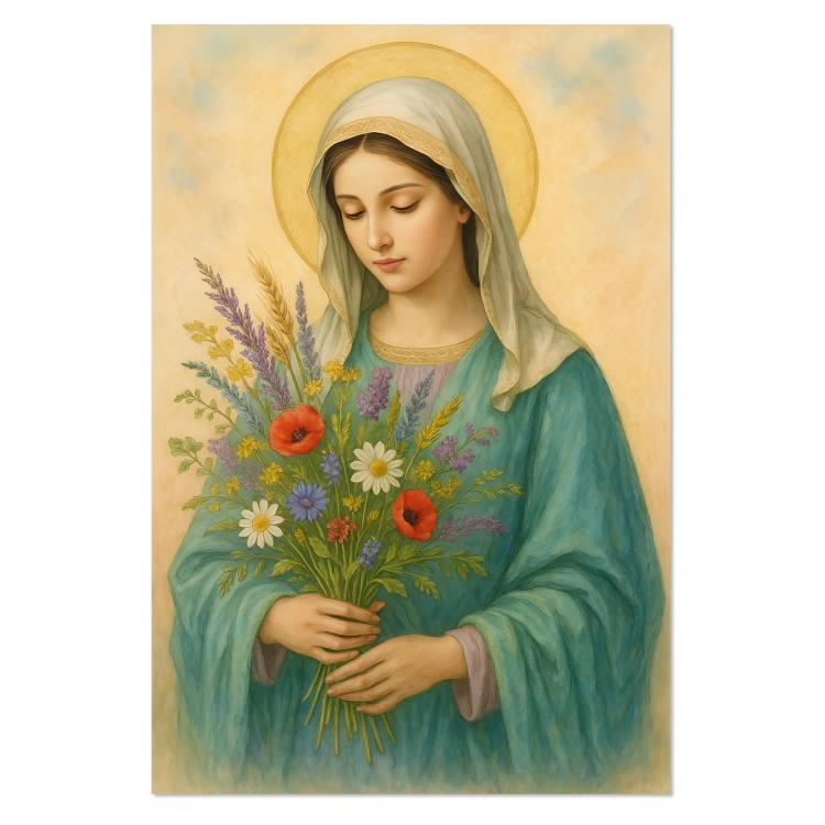 Plakat religijny – „Maryja z bukietem polnych kwiatów". Wydruk premium na papierze satynowym, matowe wykończenie i trwałe kolory. Doskonały do domu, kaplicy i na prezent.