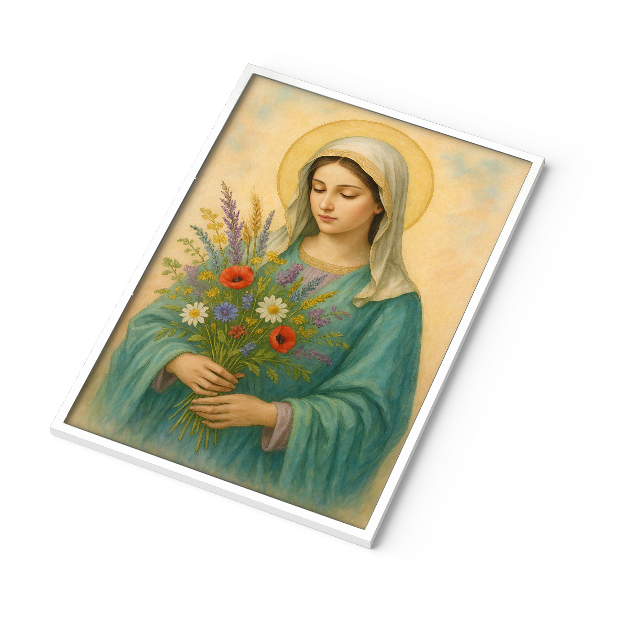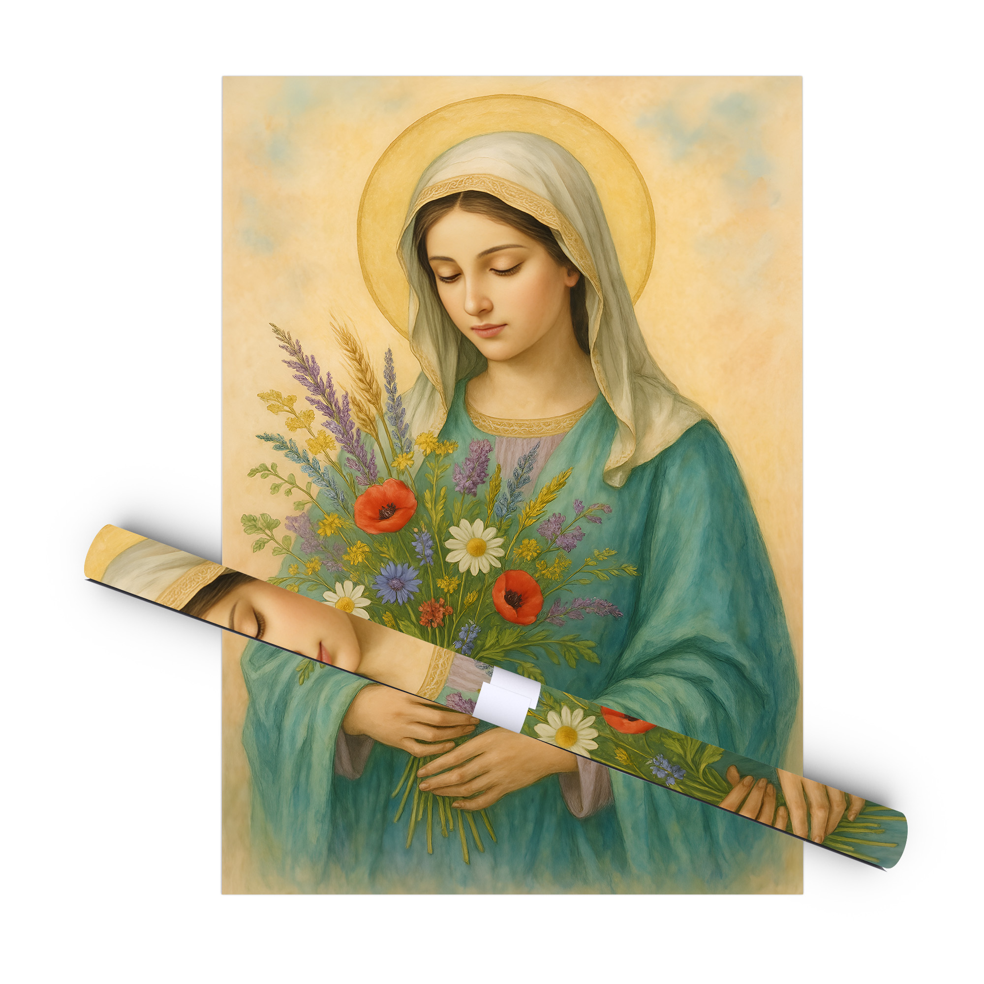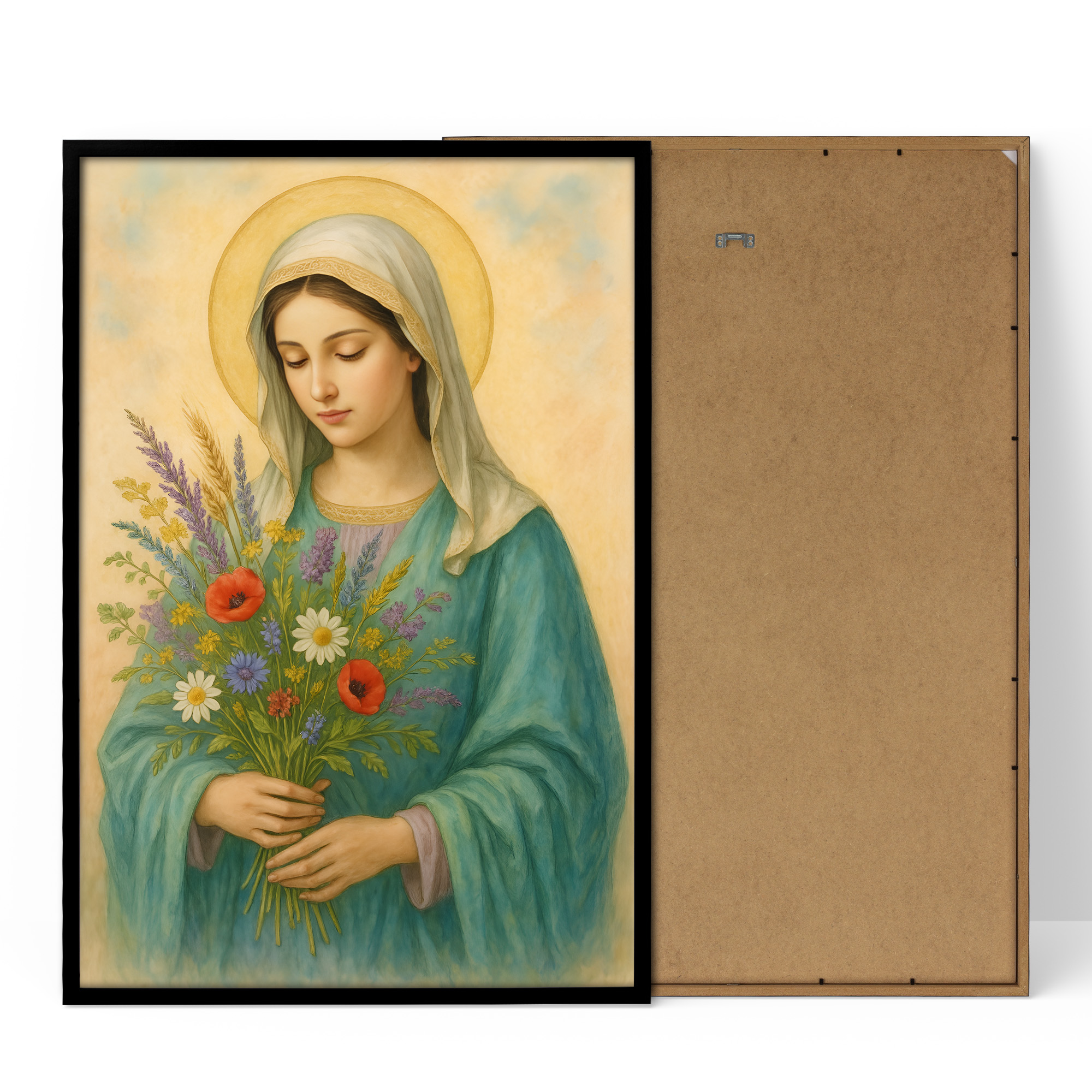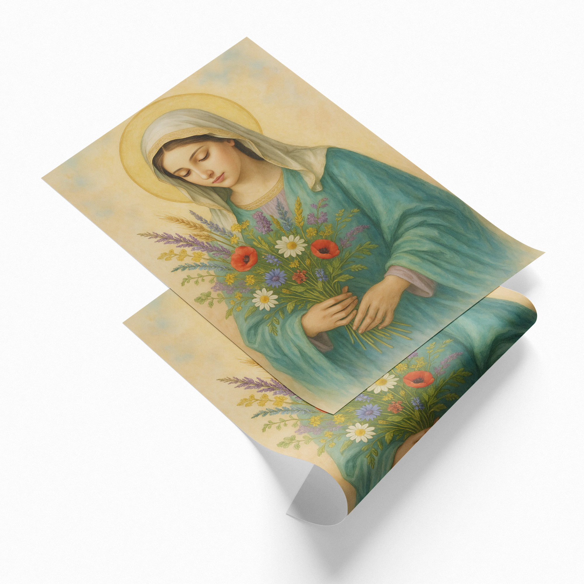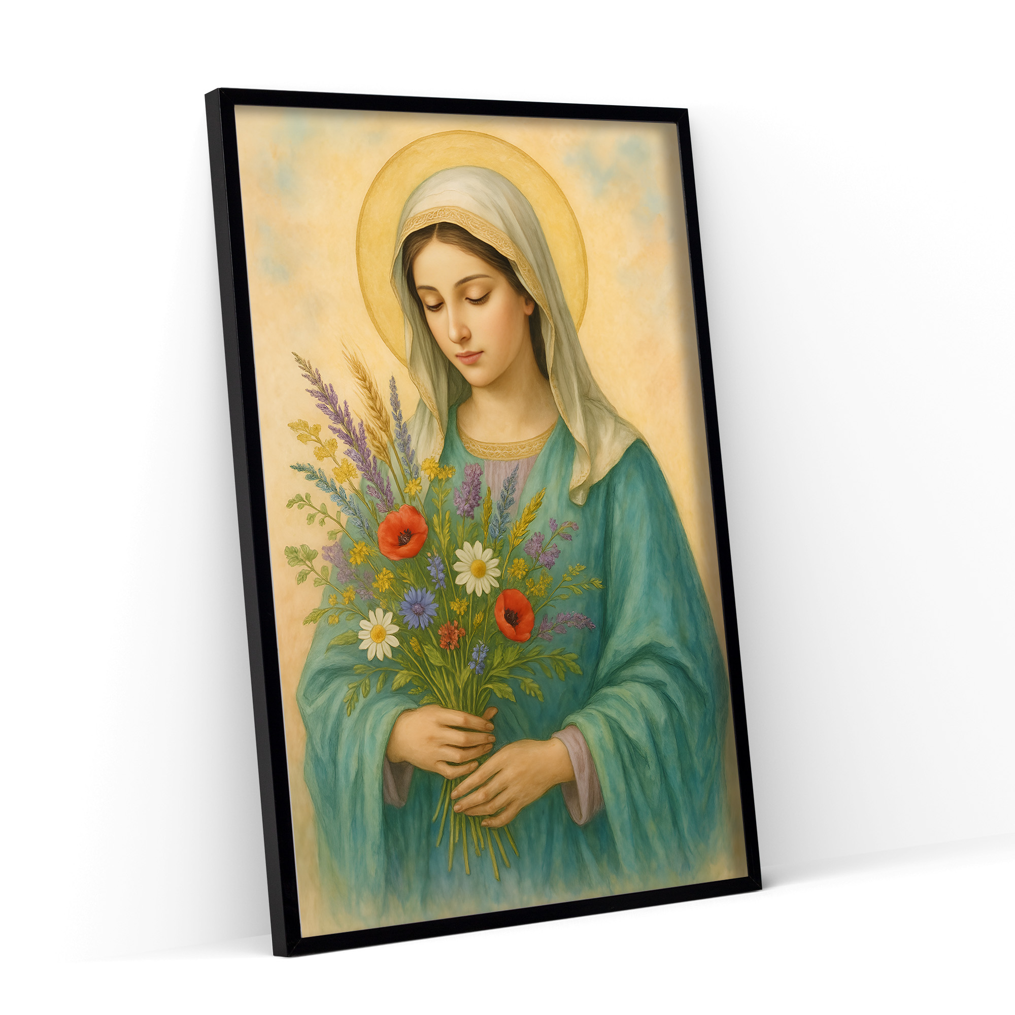 Plakat religijny – „Maryja z bukietem polnych kwiatów". Wydruk premium na papierze satynowym, matowe wykończenie i trwałe kolory. Doskonały do domu, kaplicy i na prezent.