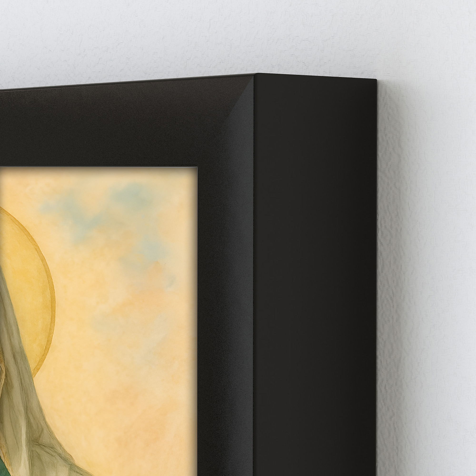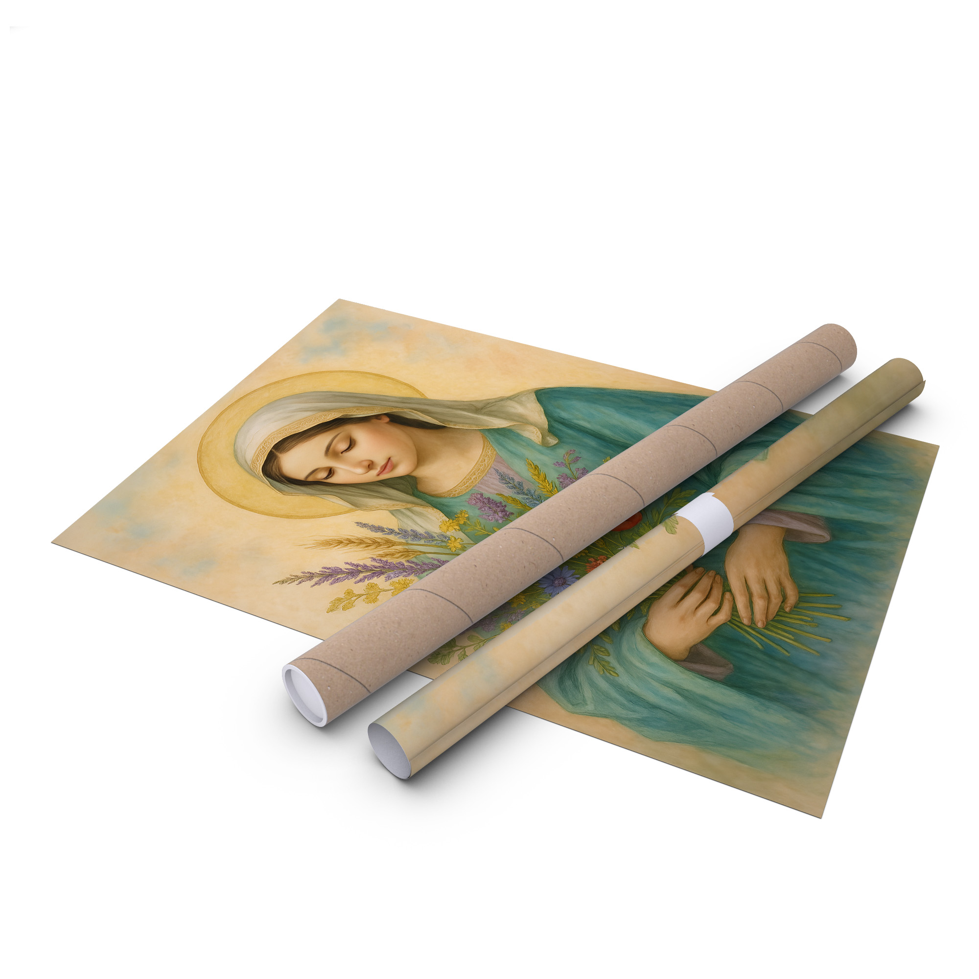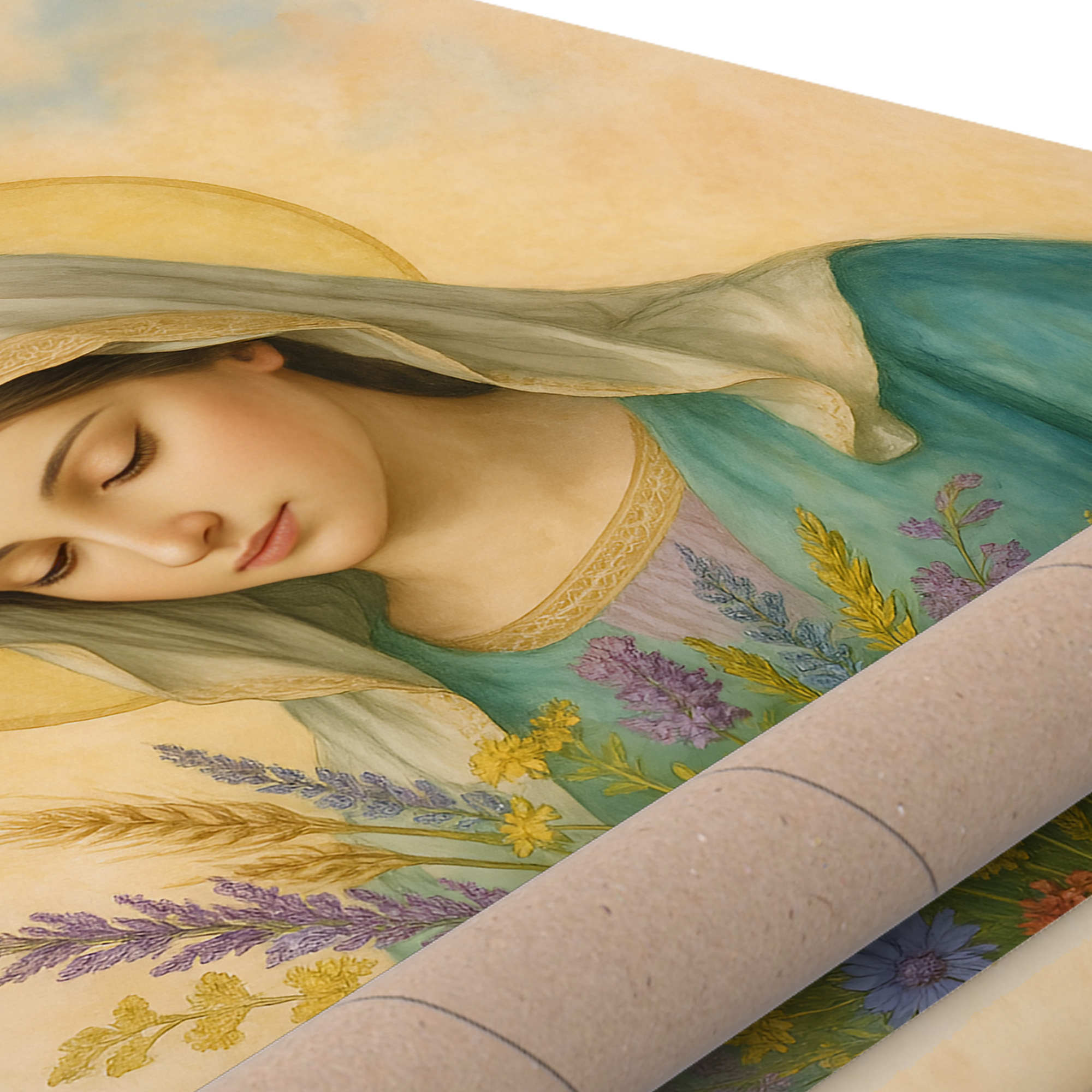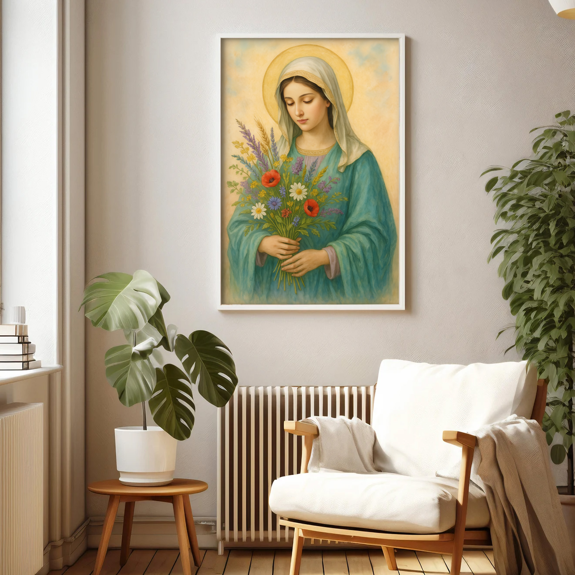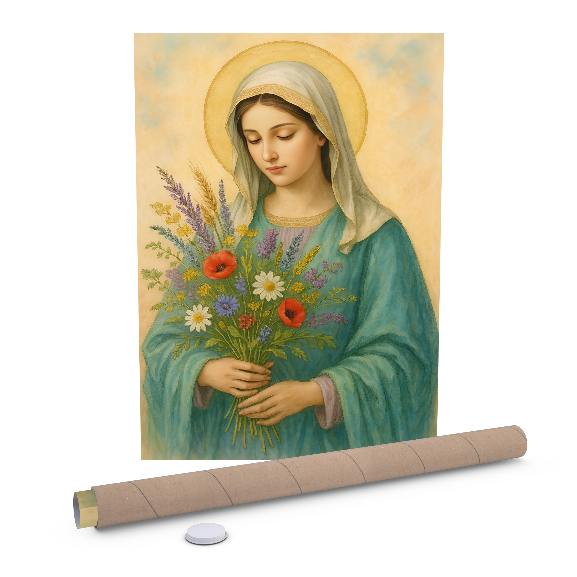 Plakat religijny – „Maryja z bukietem polnych kwiatów". Wydruk premium na papierze satynowym, matowe wykończenie i trwałe kolory. Doskonały do domu, kaplicy i na prezent.
