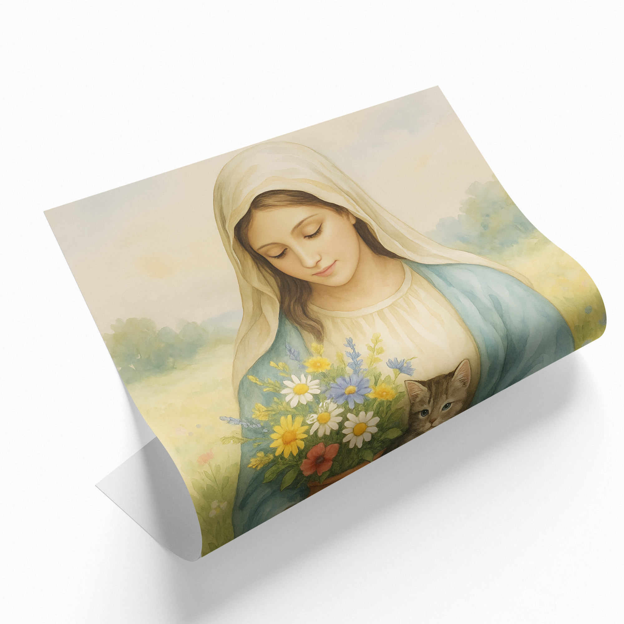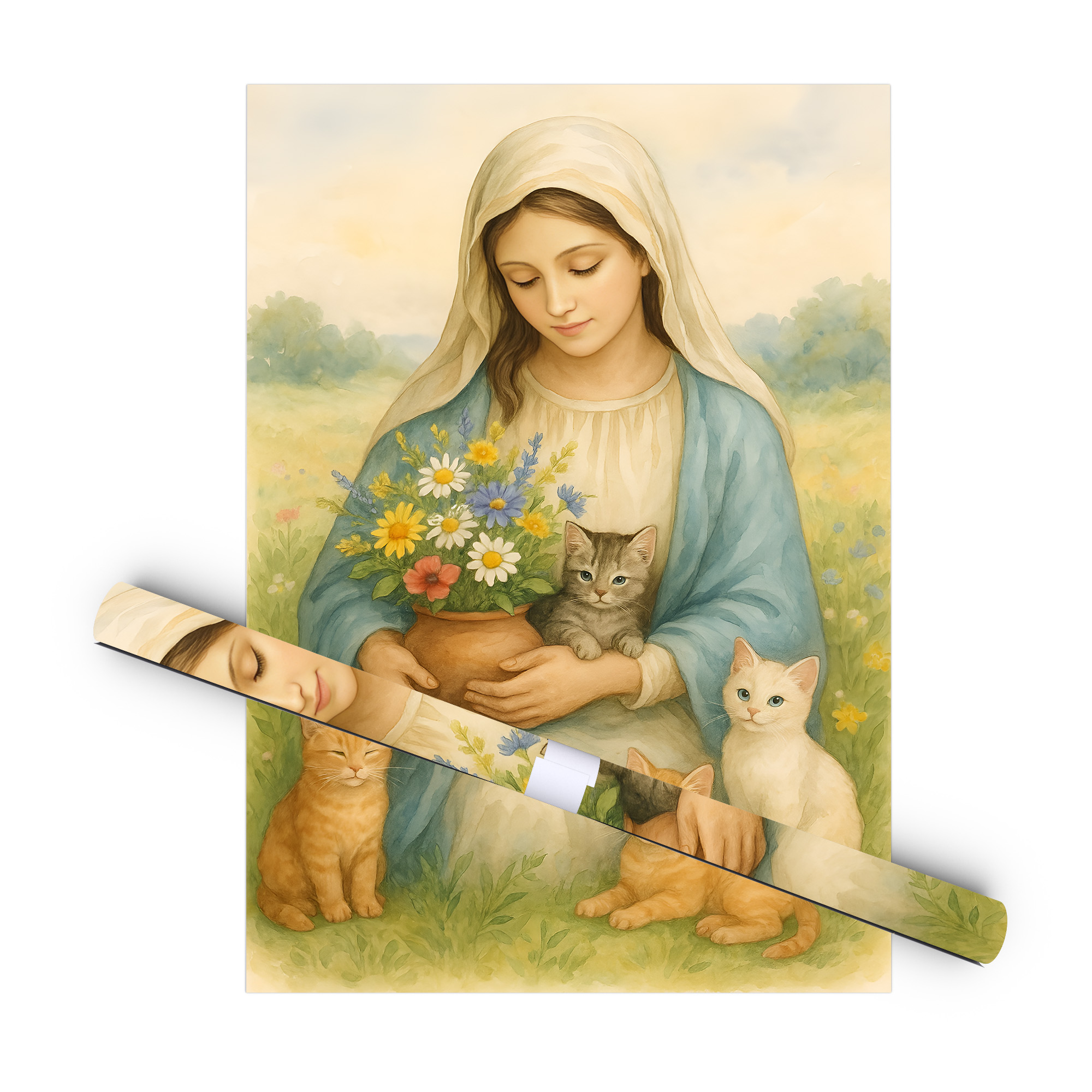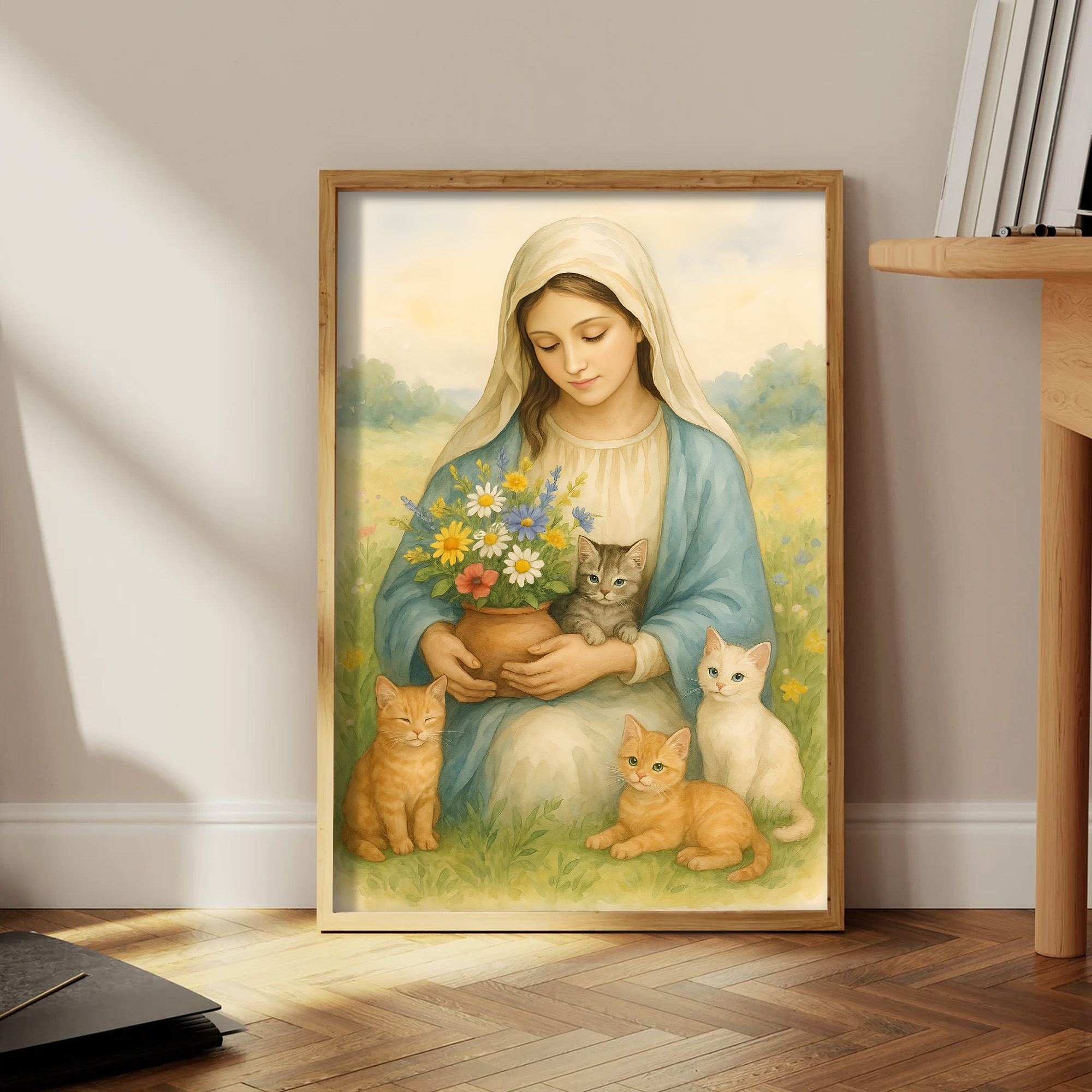 Plakat religijny – „Maryja z kwiatami i kotkami". Wydruk premium na papierze satynowym, matowe wykończenie i trwałe kolory. Idealny do domu i na prezent.