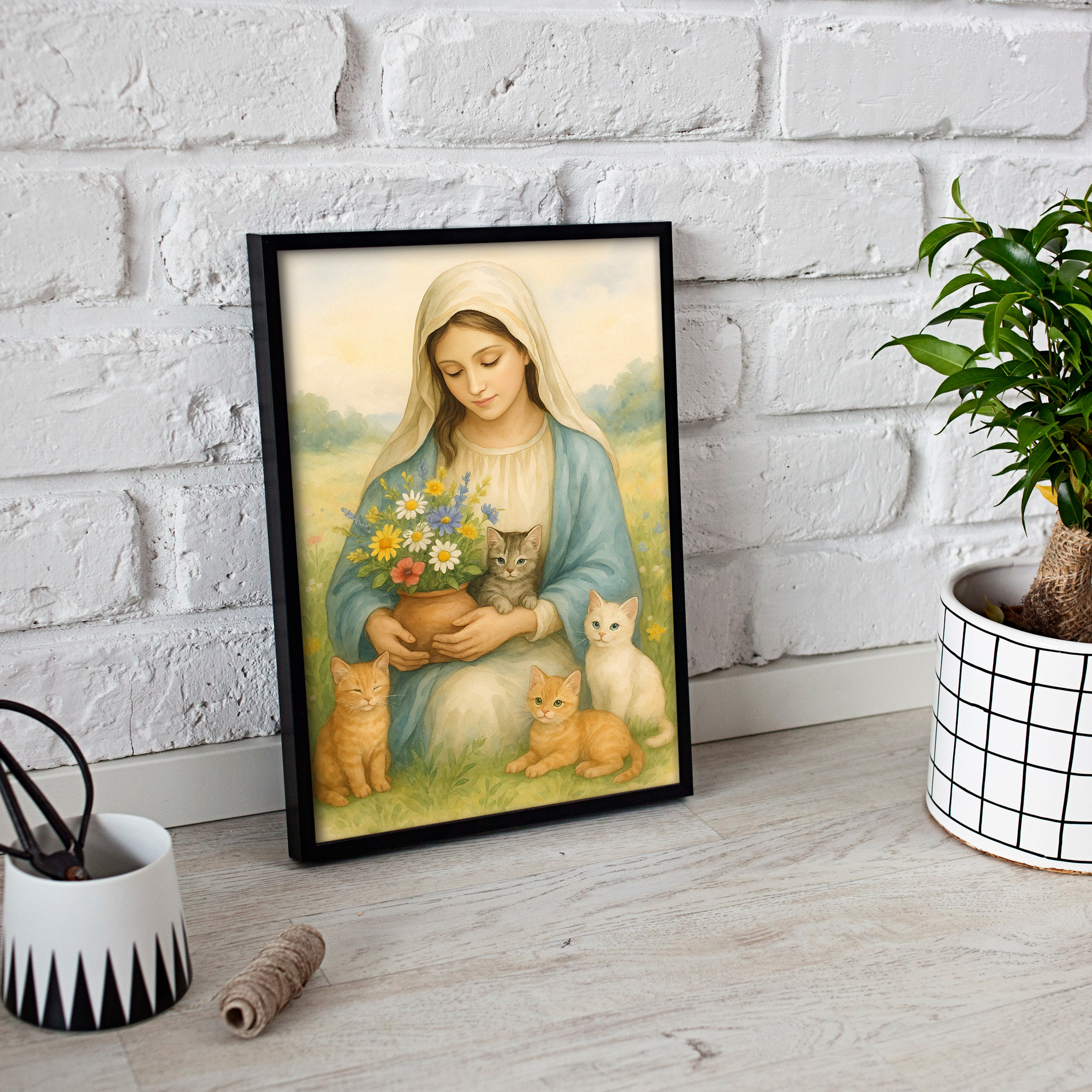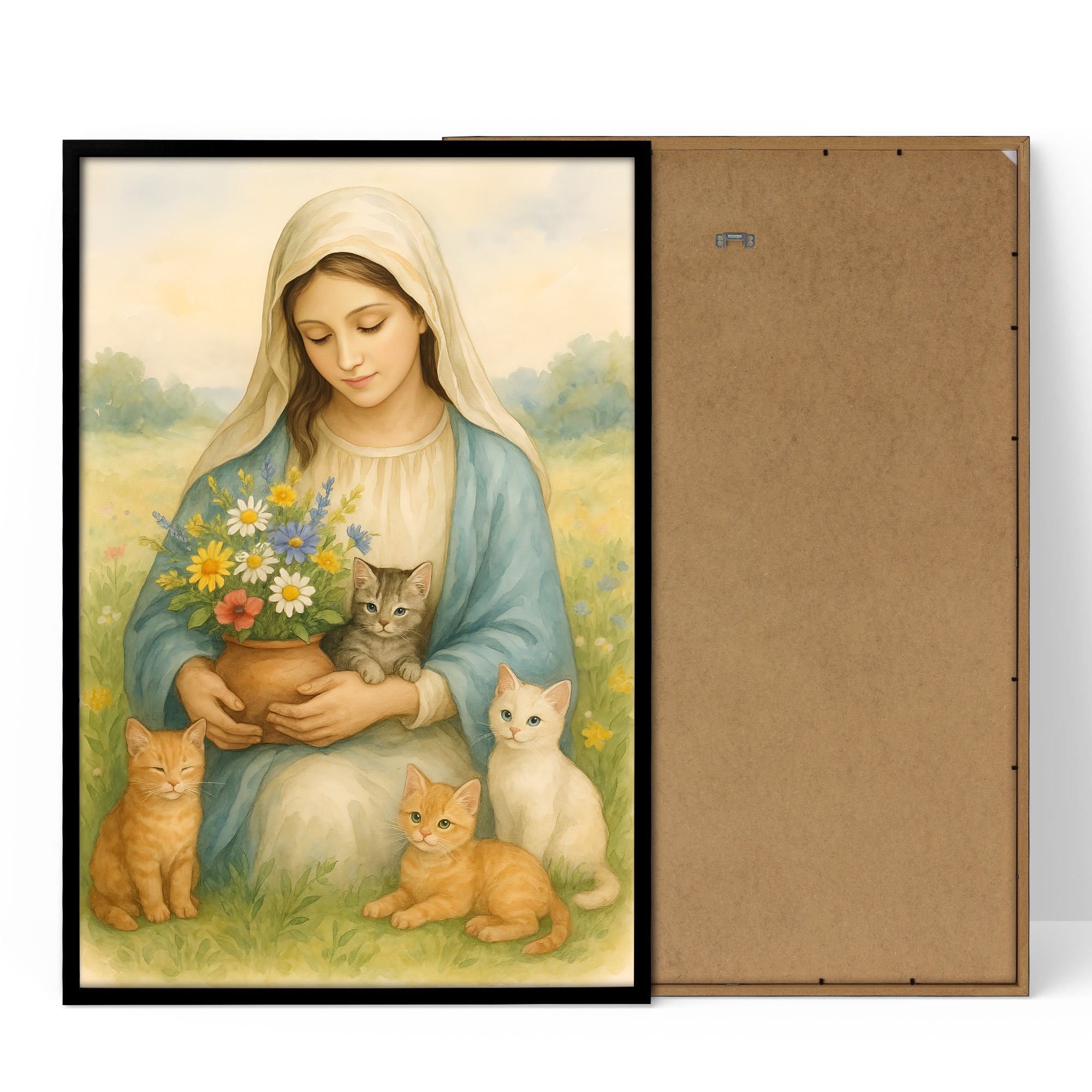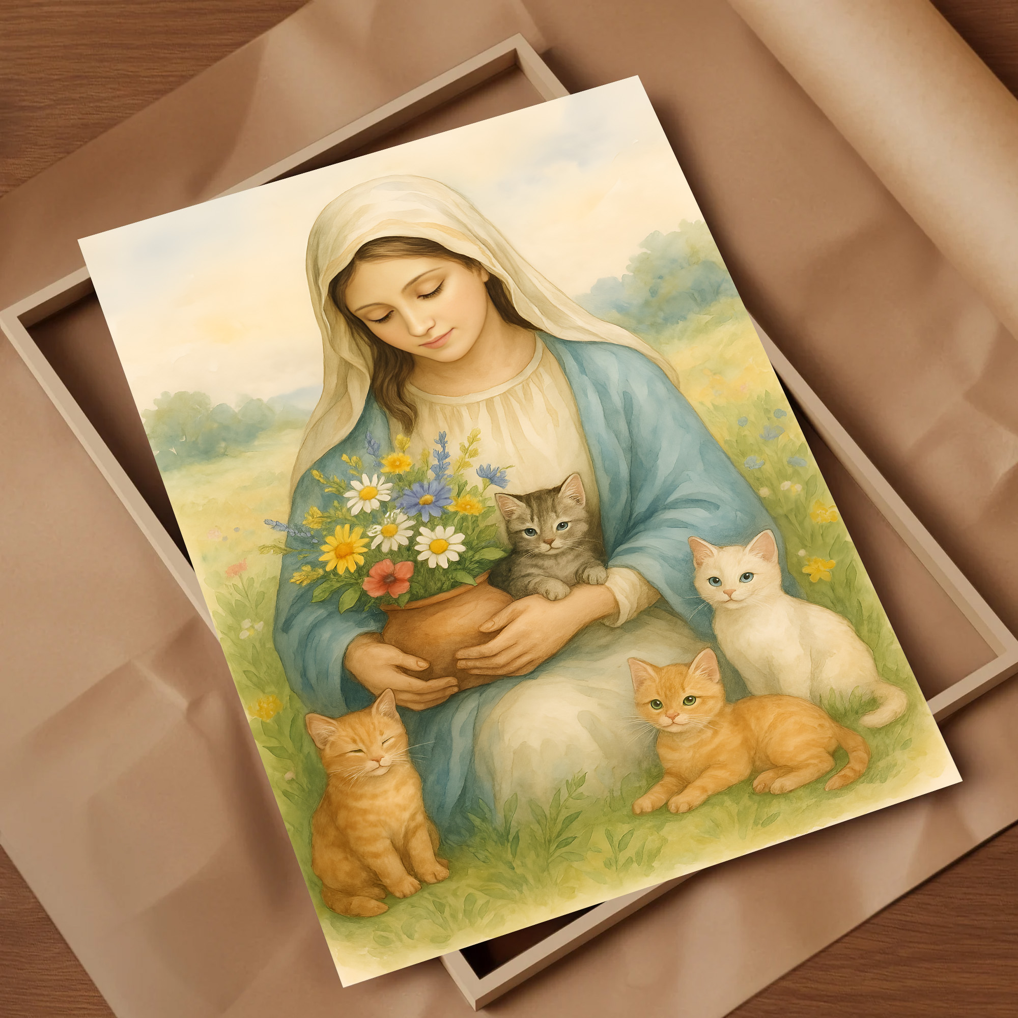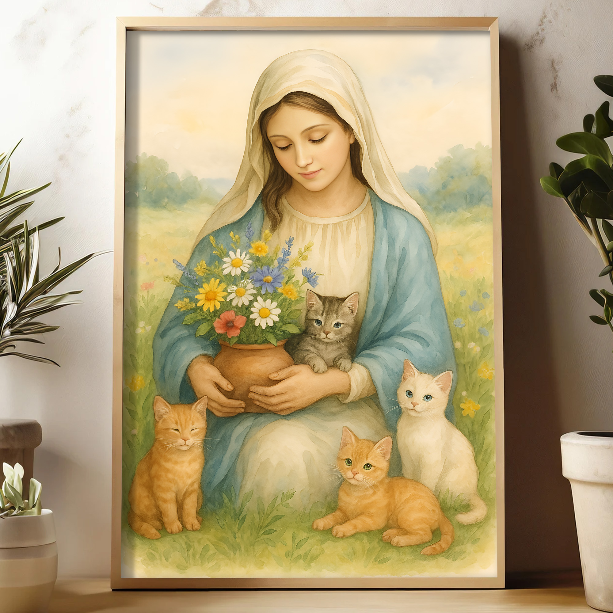 Plakat religijny – „Maryja z kwiatami i kotkami". Wydruk premium na papierze satynowym, matowe wykończenie i trwałe kolory. Idealny do domu i na prezent.