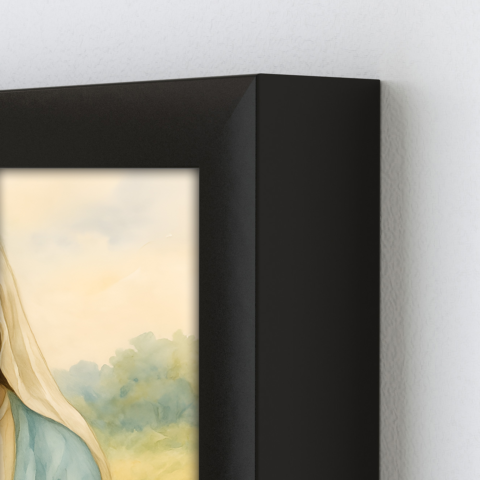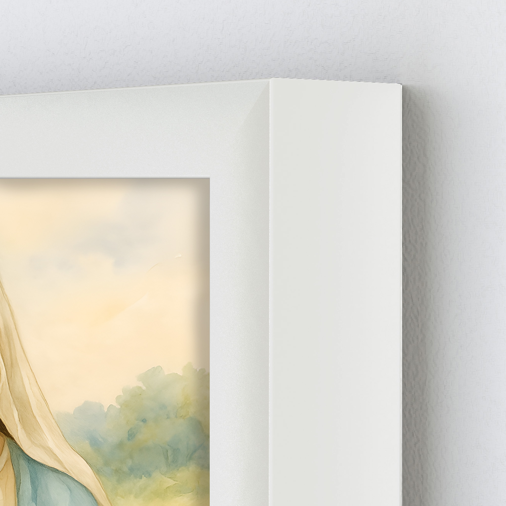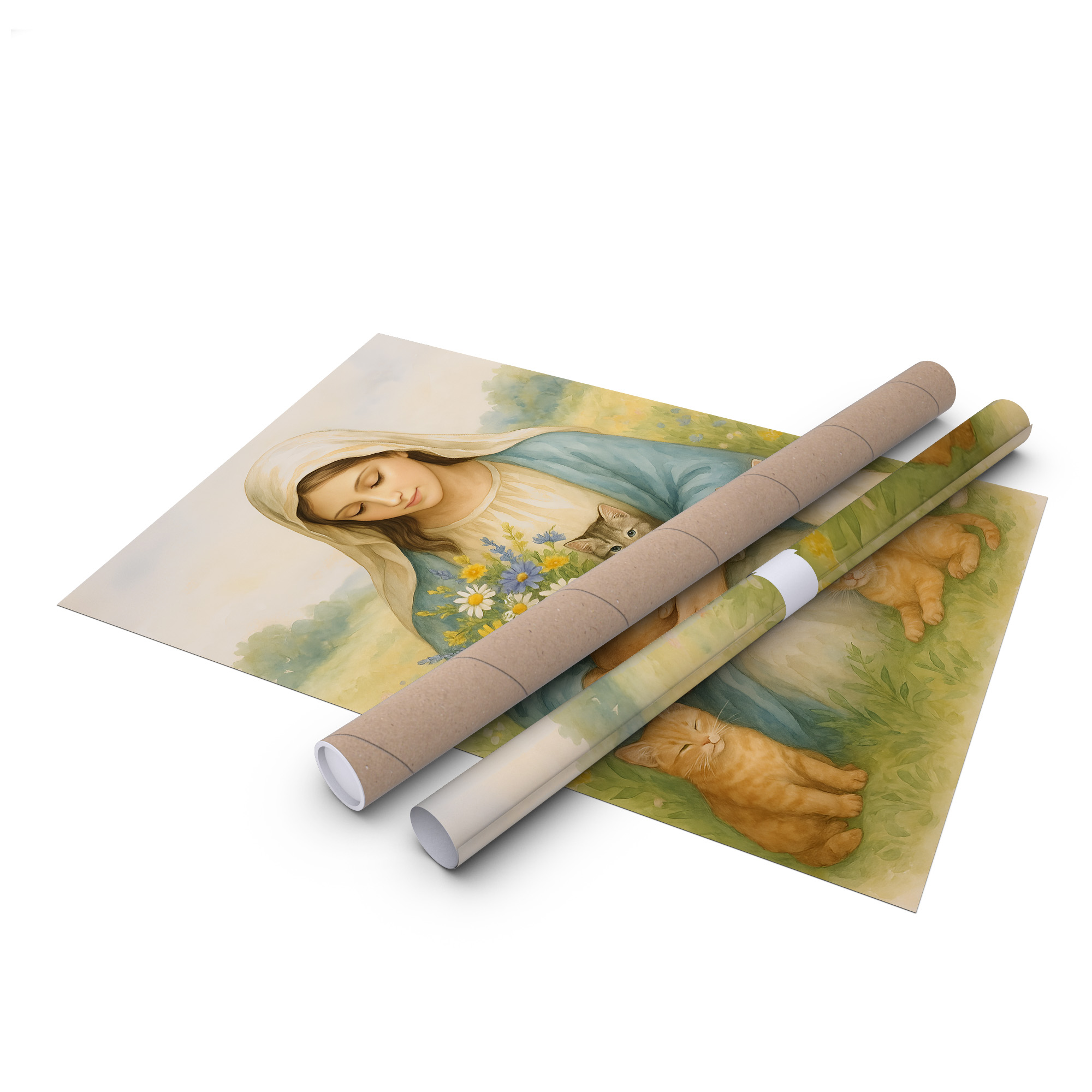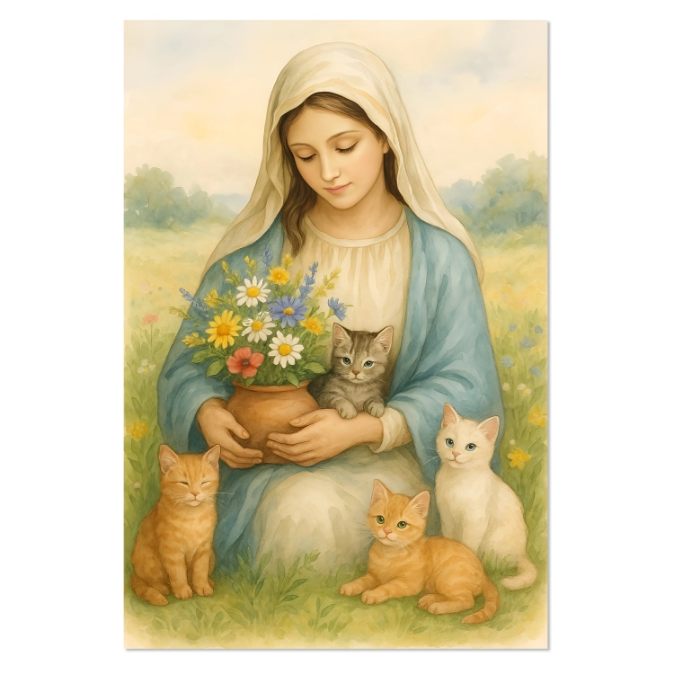 Plakat religijny – „Maryja z kwiatami i kotkami". Wydruk premium na papierze satynowym, matowe wykończenie i trwałe kolory. Idealny do domu i na prezent.